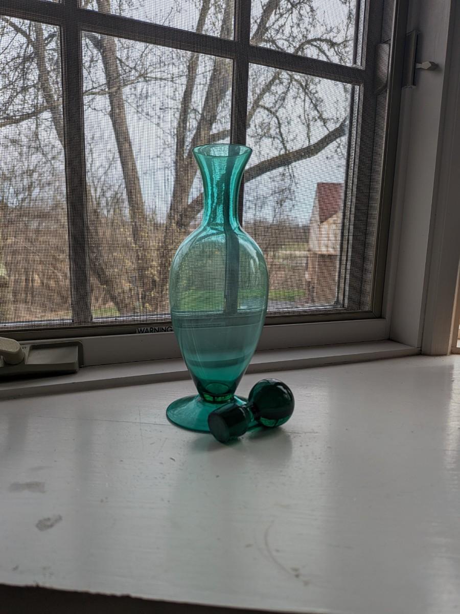 Vintage Green MCM Retro Round Top Stoppered Art Glass Bottle Decanter