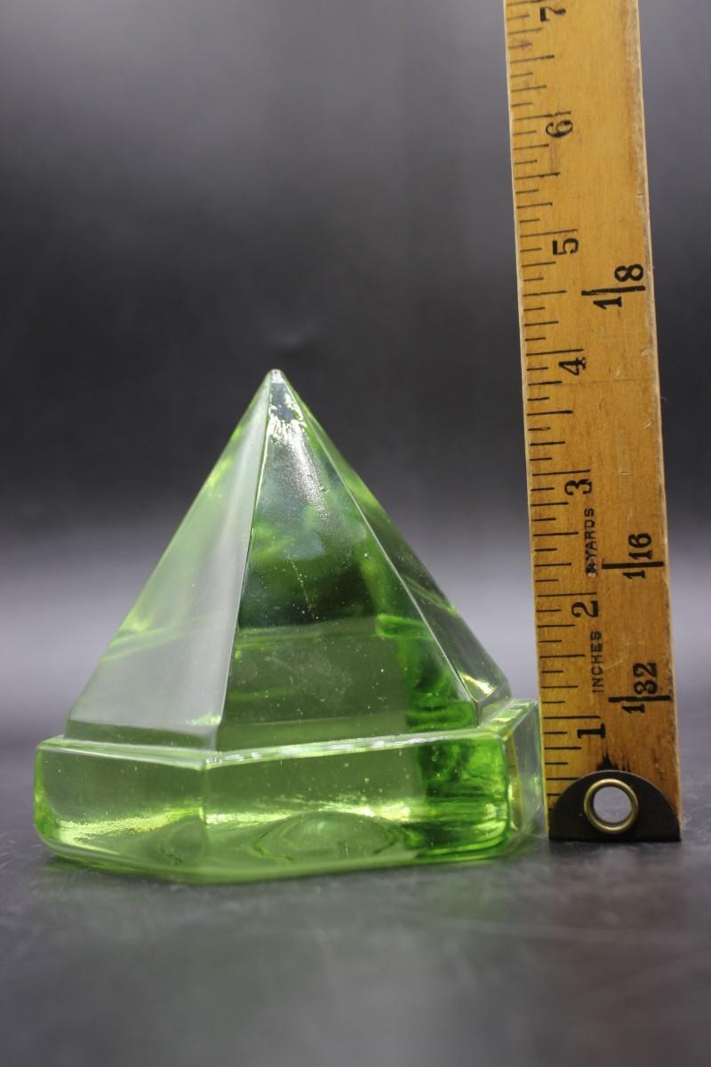 Green Glass Gem Paperweight, there are no cracks or chips to the piece and is in good useable condition. Check pictures for more details and for sizing.