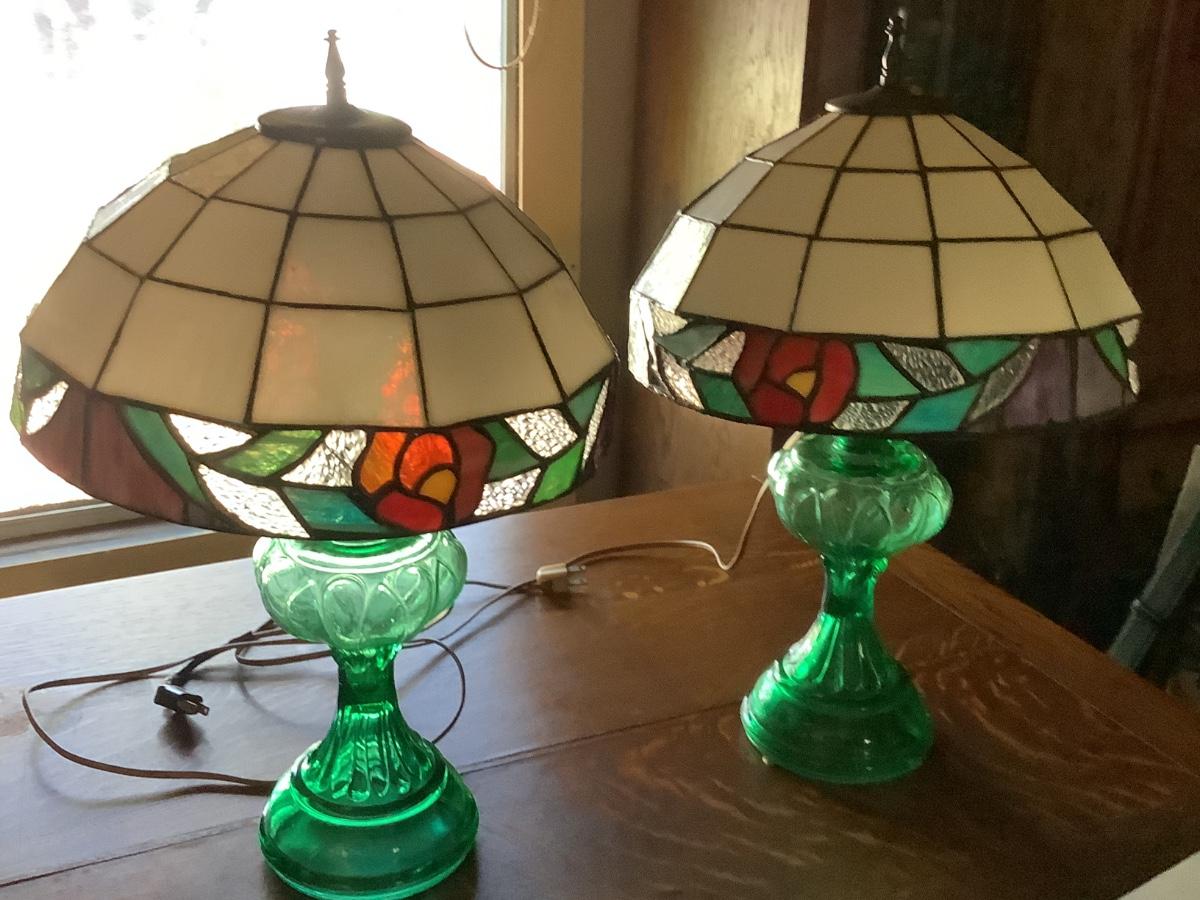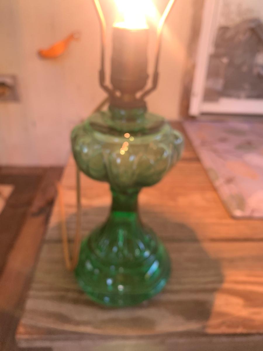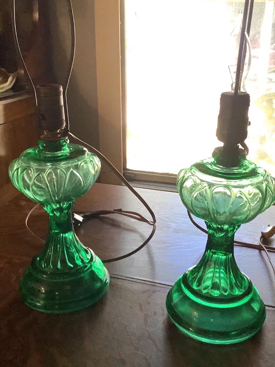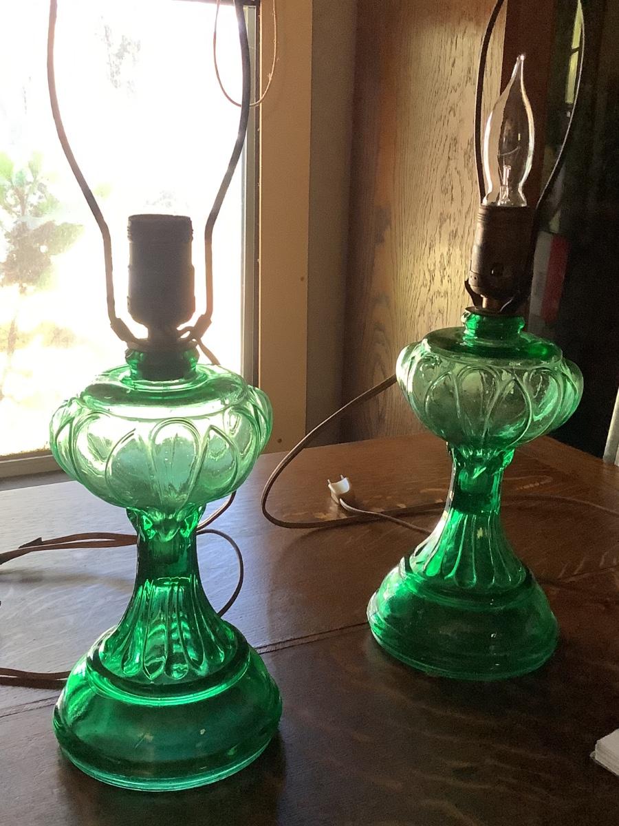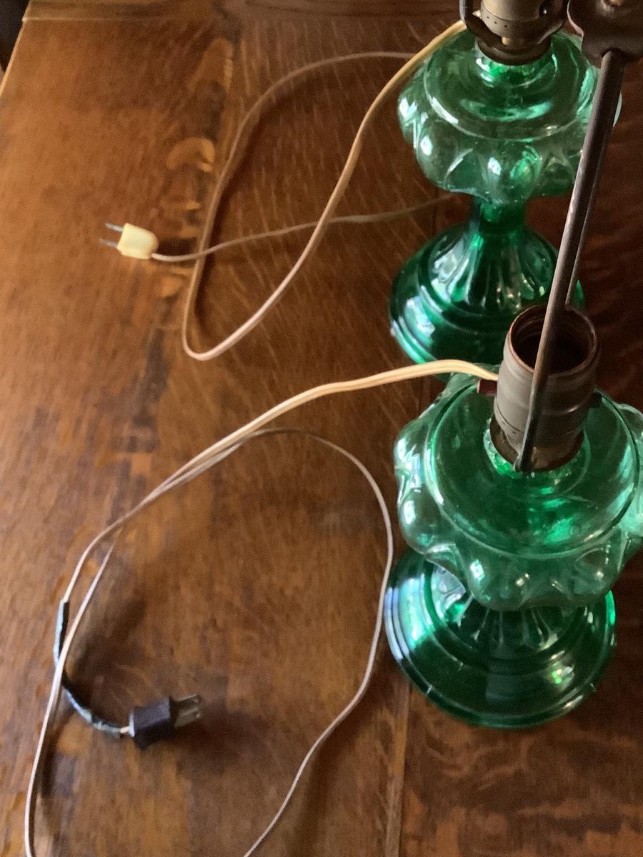 Green glass lamps converted to electric-can be converted to oil lamps