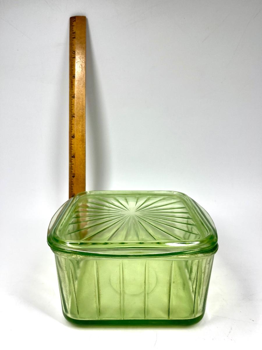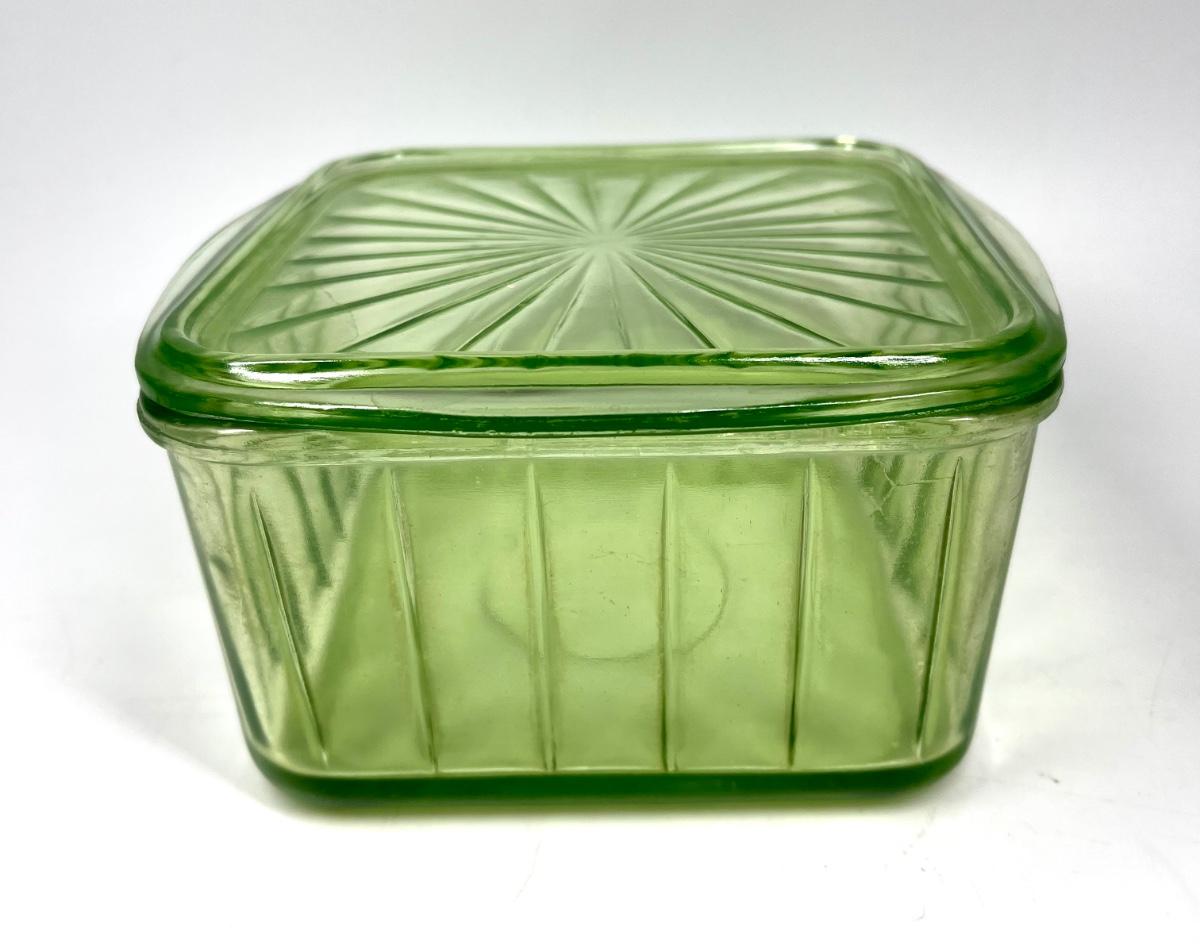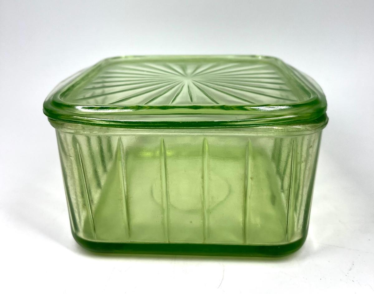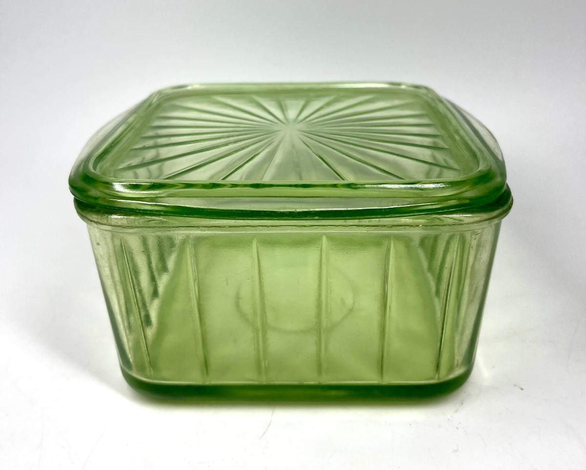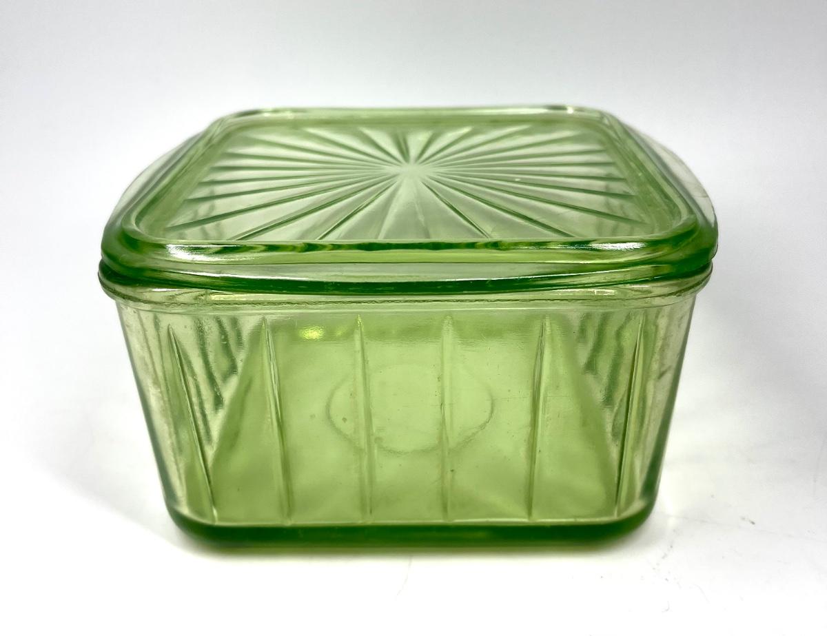 Vintage Vaseline Uranium Glass Lidded Refrigerator Storage Dish. In good vintage condition.
