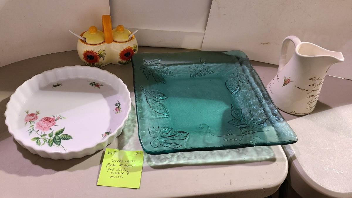Green Glass Plate+Pie Dish+Pitcher+Relish dish -Item #418