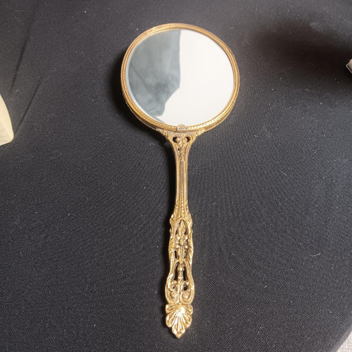GREEN GLASS POWDER OR TRINKET BOX, LENOX FORTUNE ELEPHANT & VANITY MIRROR