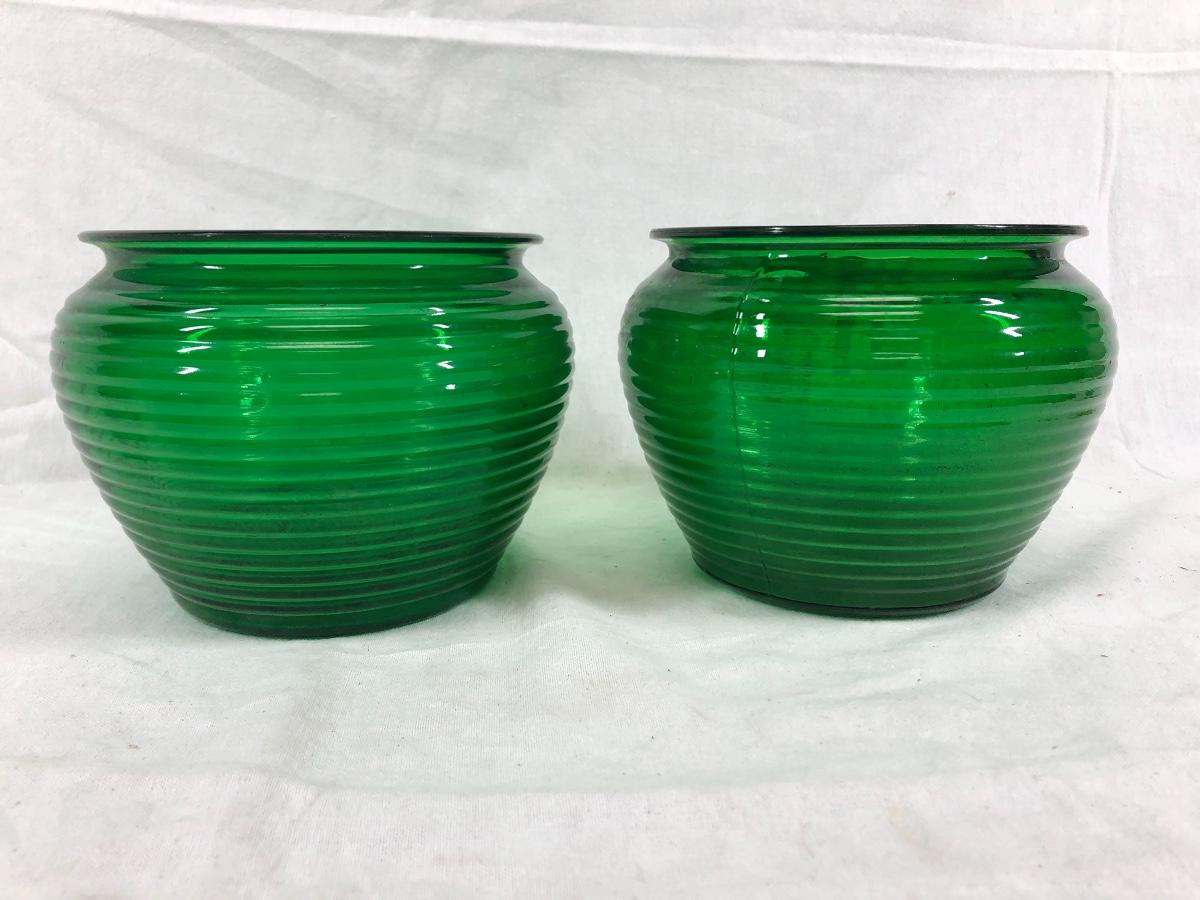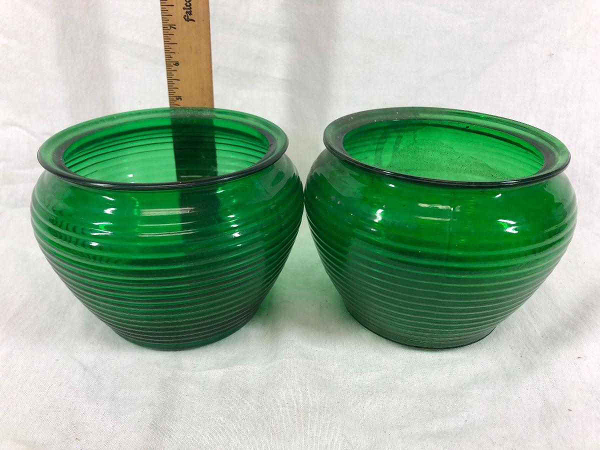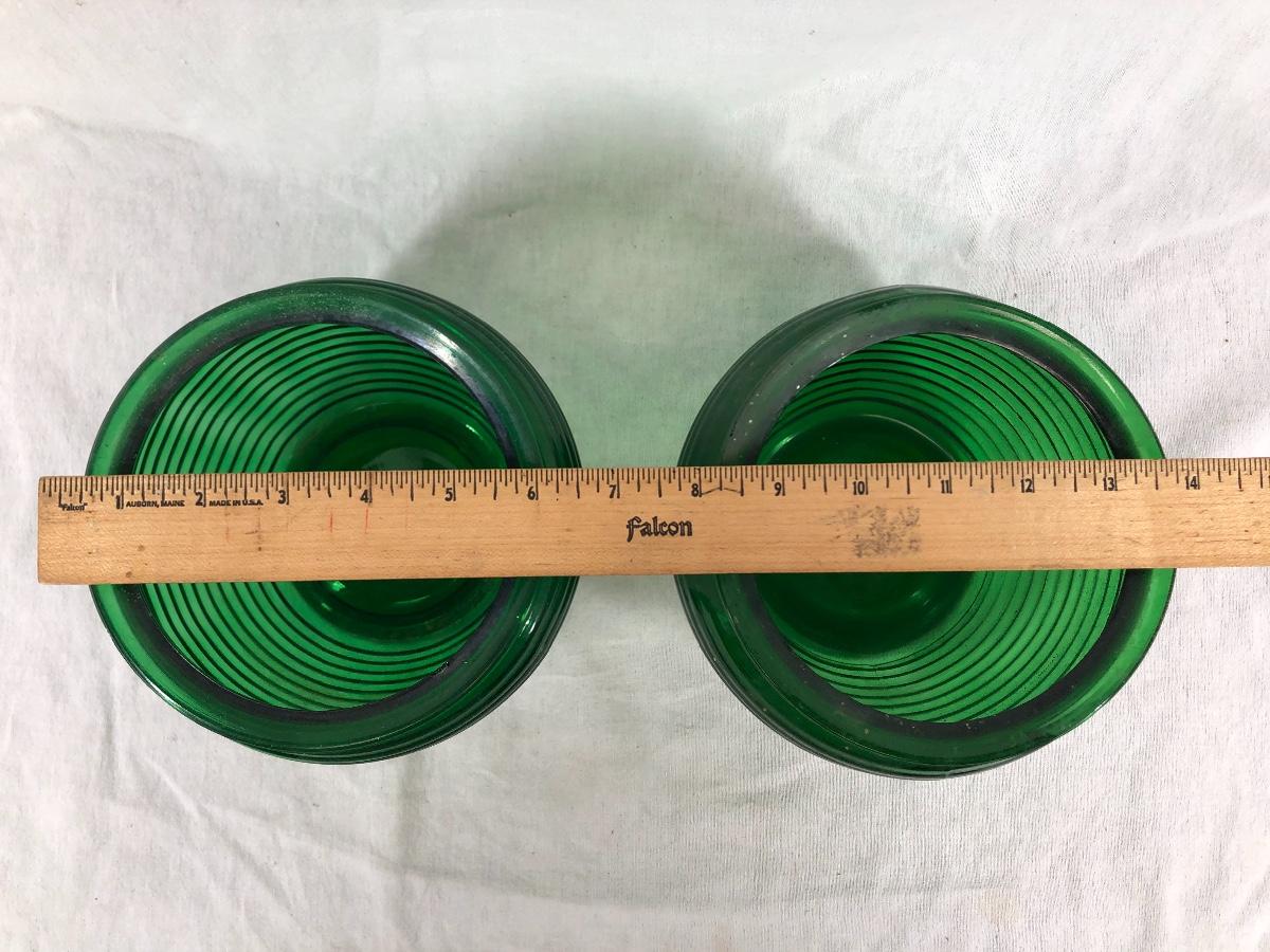 Pair of green translucent glass tea light or candle holders. Approx. 5” tall and 7” across.