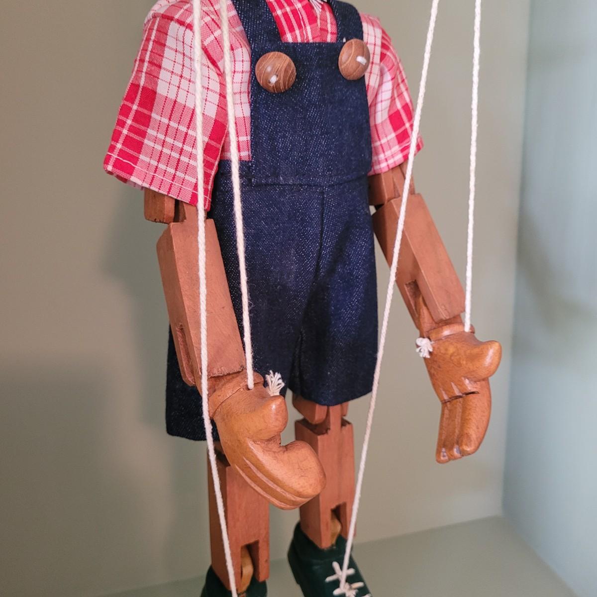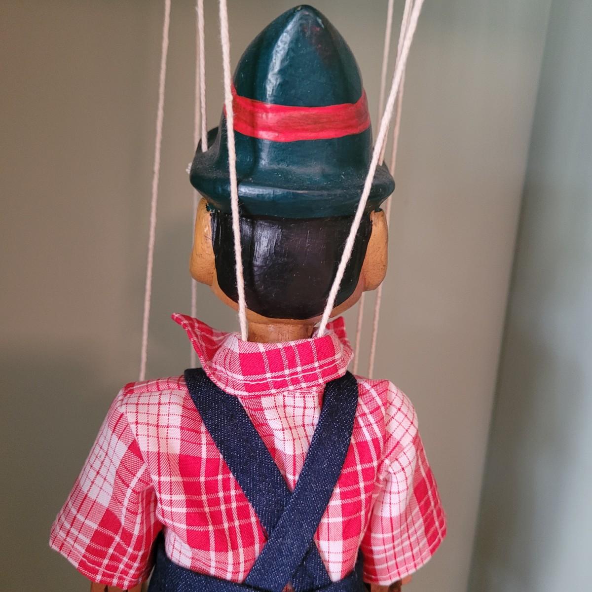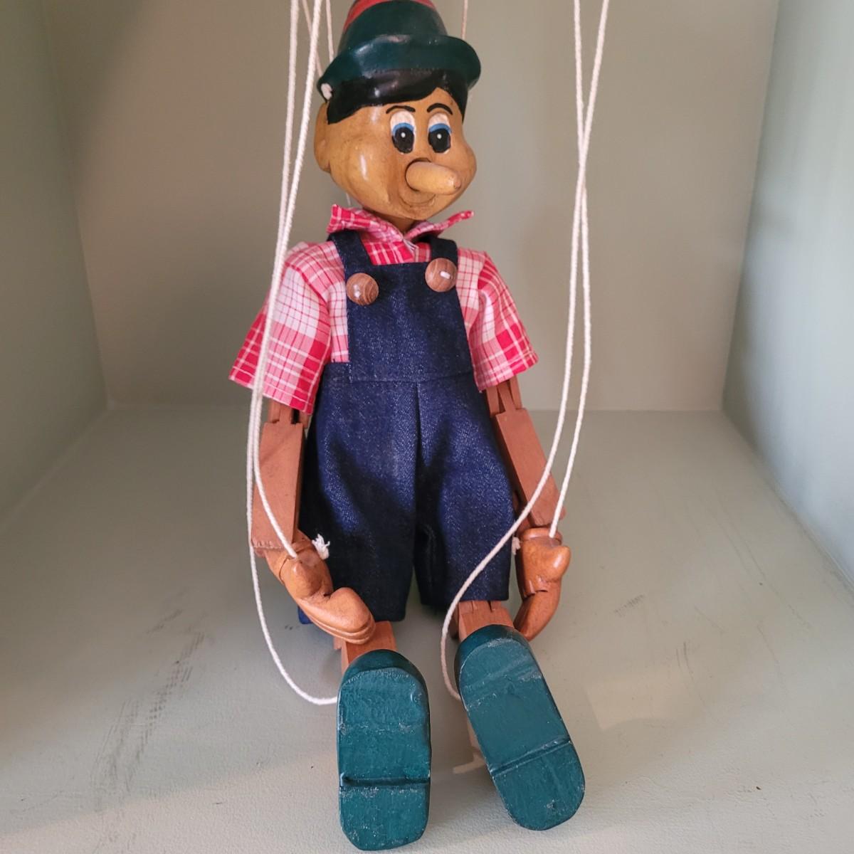 Vintage Pinocchio marionette. Hand-carved from wood with hand-painted features. This doll is wearing a green hat, blue overalls, and a red flannel shirt. Designed for smooth and easy movement, suitable for both beginners and semi-professional puppeteers. Pinocchio is a well-known character from children's literature, making these marionettes popular as toys, collectibles, and decorative items. This doll measures 6" x 8" x 23"H with strings.