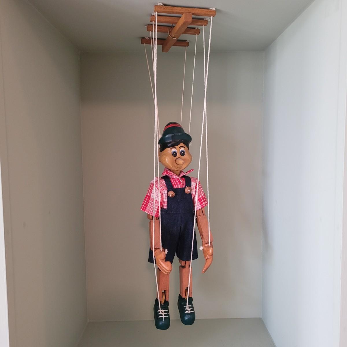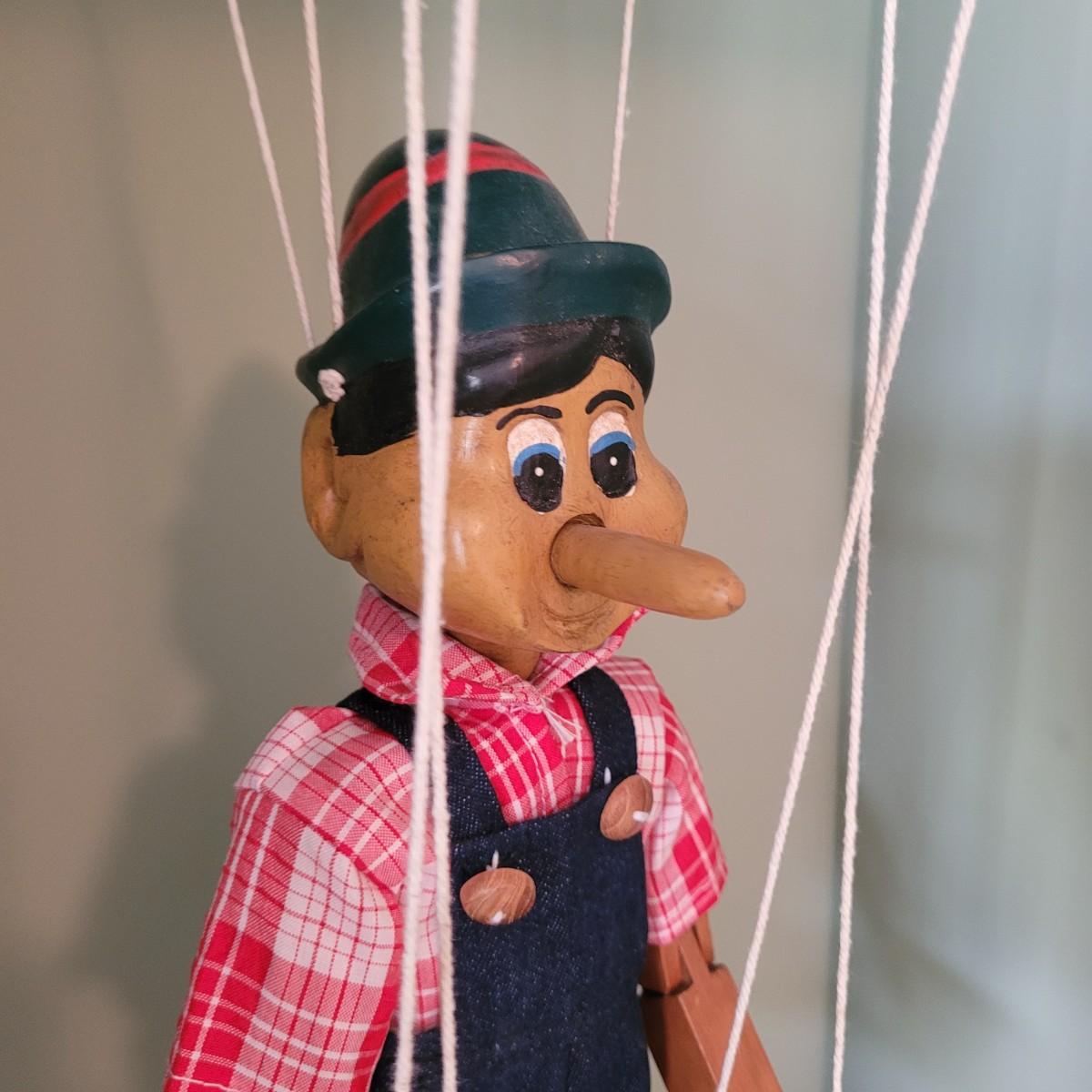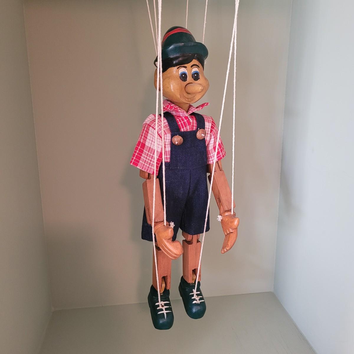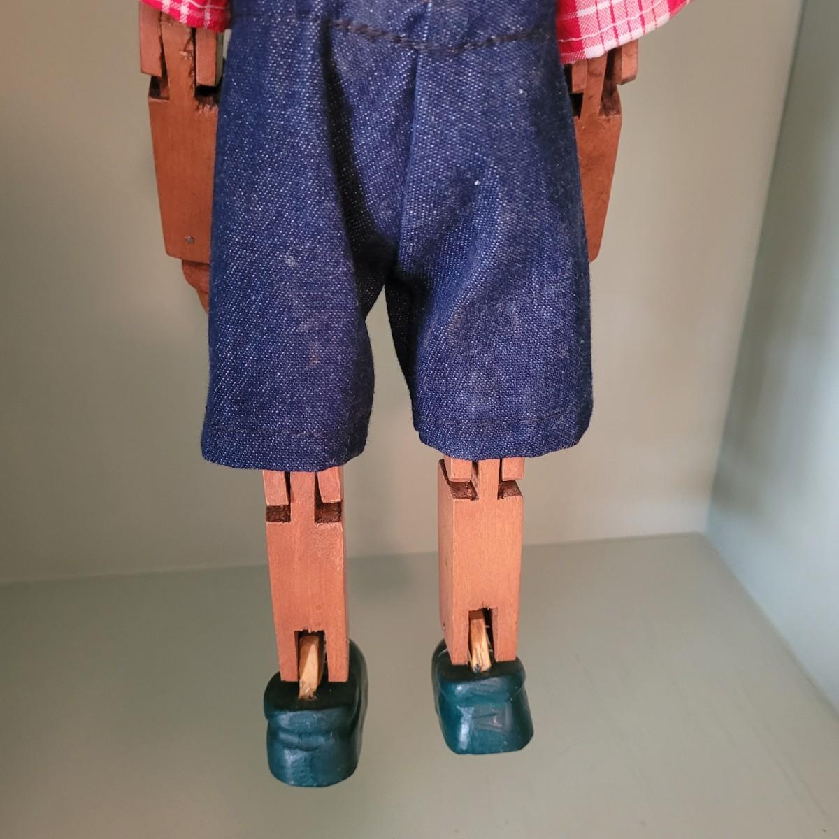 Vintage Pinocchio marionette. Hand-carved from wood with hand-painted features. This doll is wearing a green hat, blue overalls, and a red flannel shirt. Designed for smooth and easy movement, suitable for both beginners and semi-professional puppeteers. Pinocchio is a well-known character from children's literature, making these marionettes popular as toys, collectibles, and decorative items. This doll measures 6" x 8" x 23"H with strings.