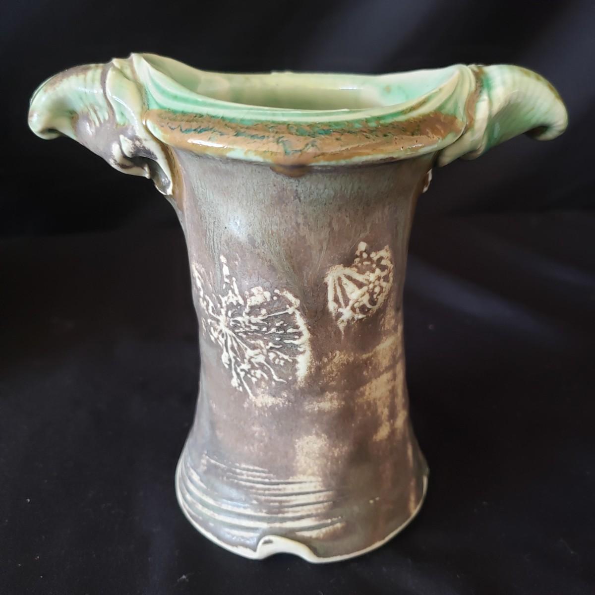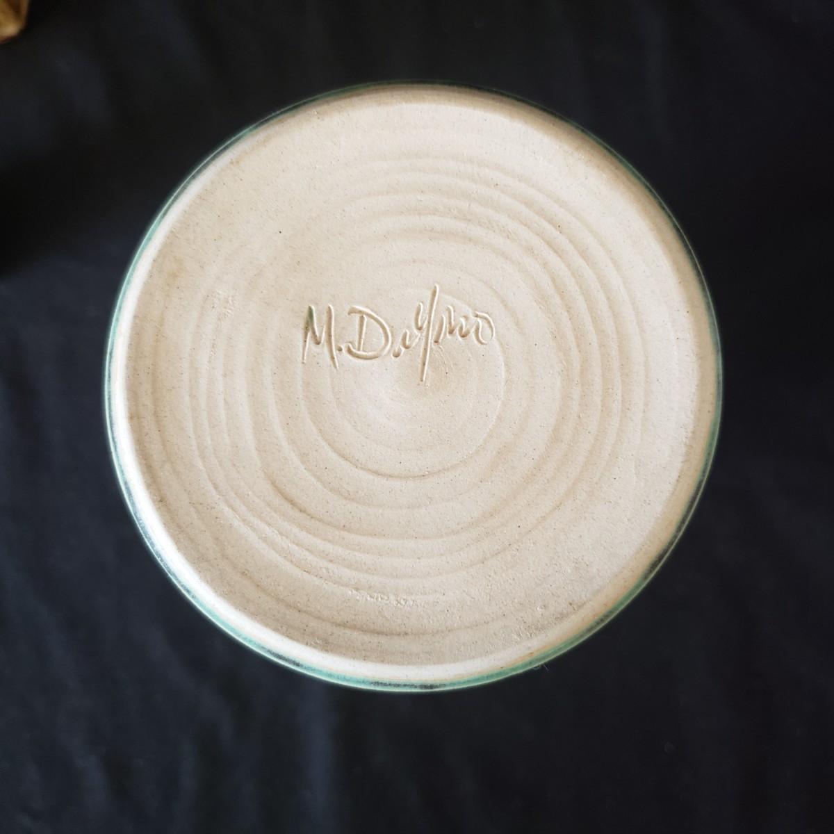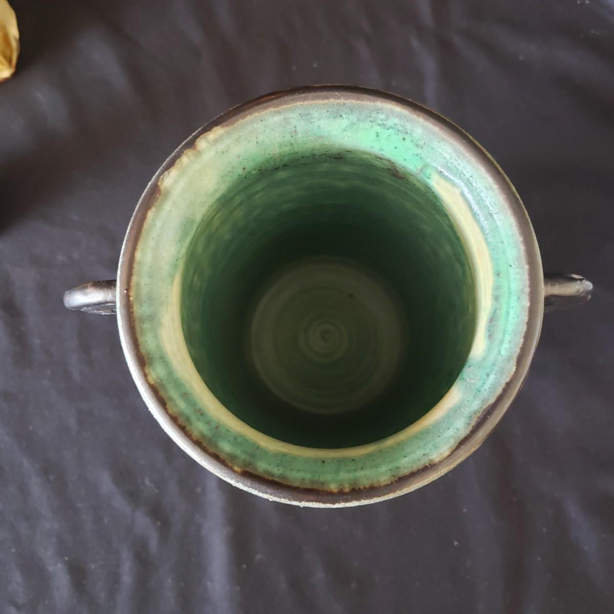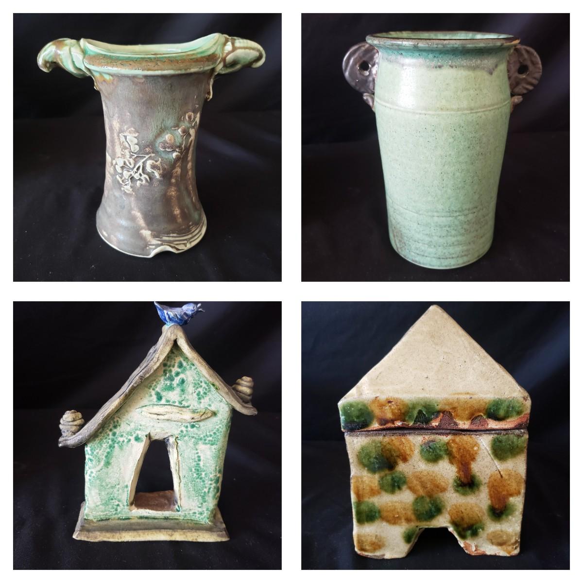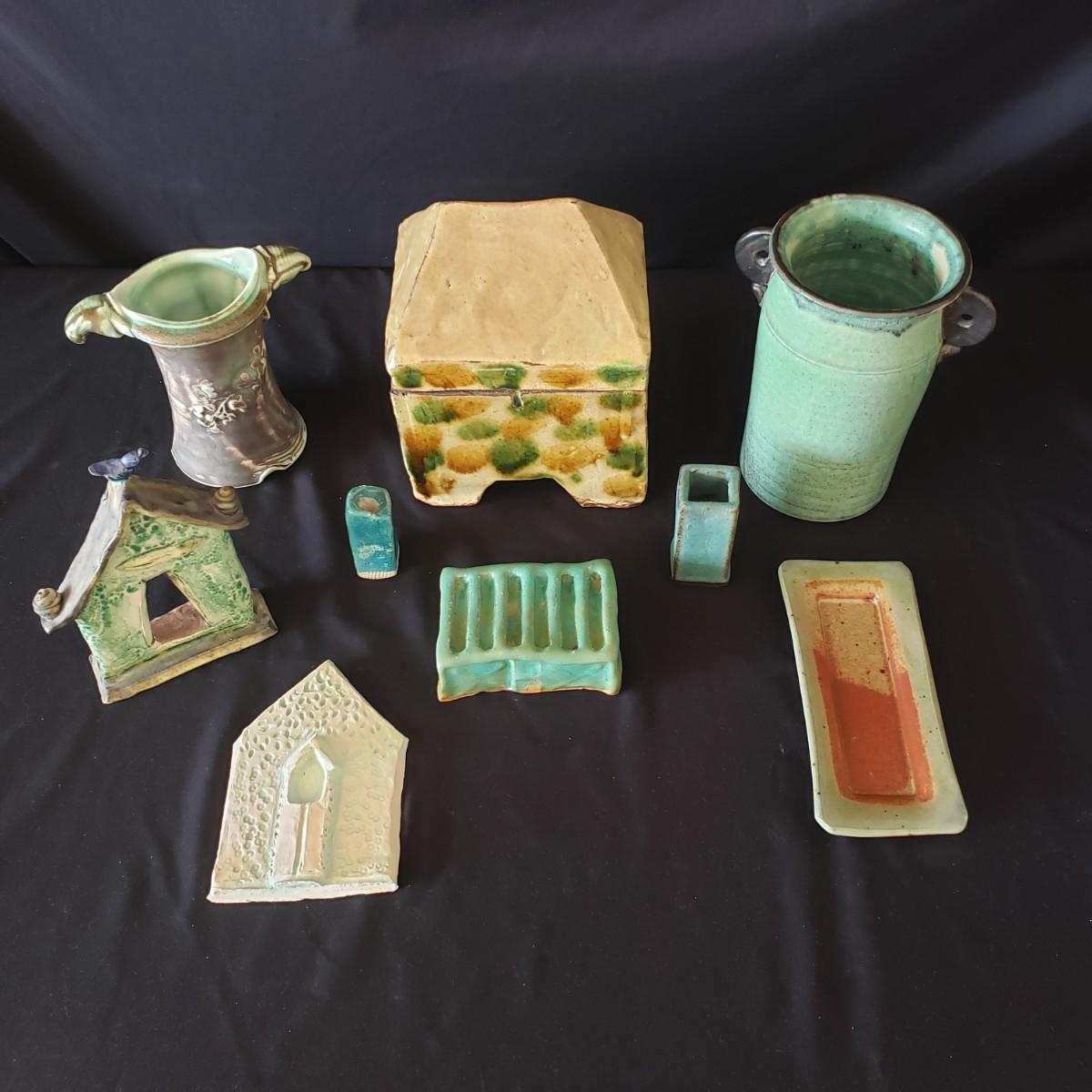 This nine piece lot features green inspired pottery. The handled green vase measures 6"D x 7"H. The lidded box is heavy to the touch and measures 6" x 5" x 8"H. The soap dish has Mim Strang stamped on the bottom. The two small bud vases are adorable. The smaller brown vase with handles has two different flowers on each side and a smooth glaze inside.