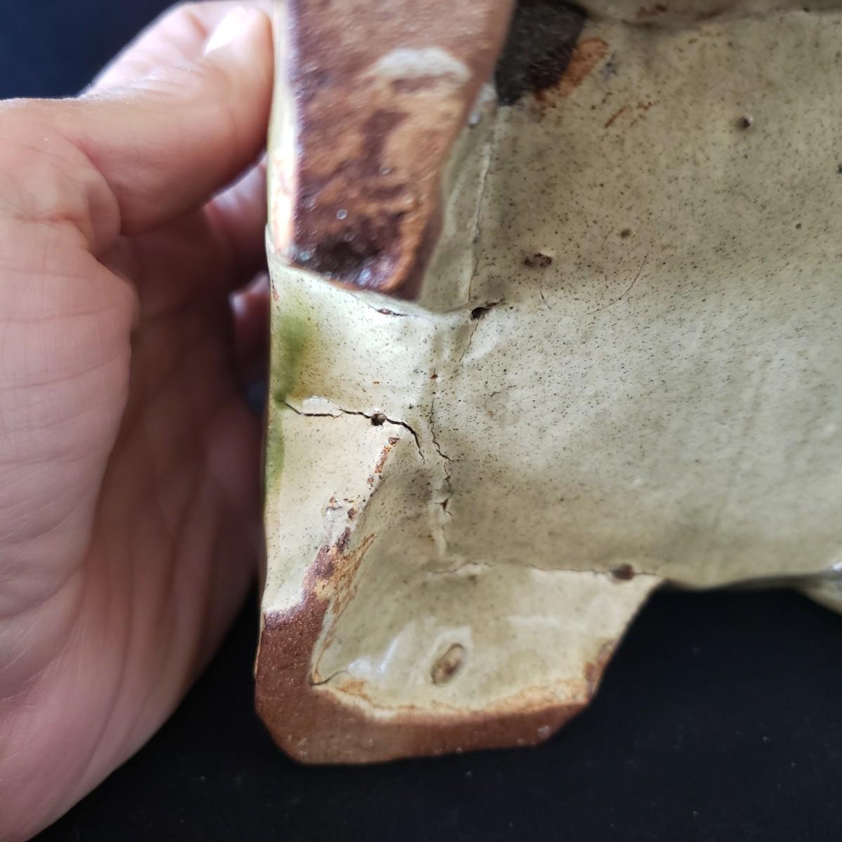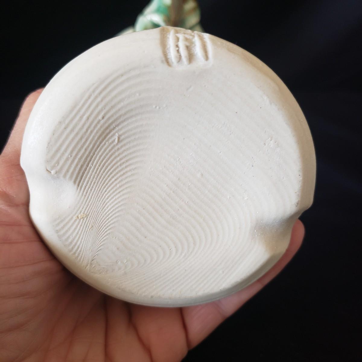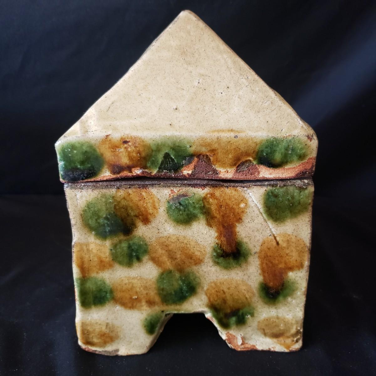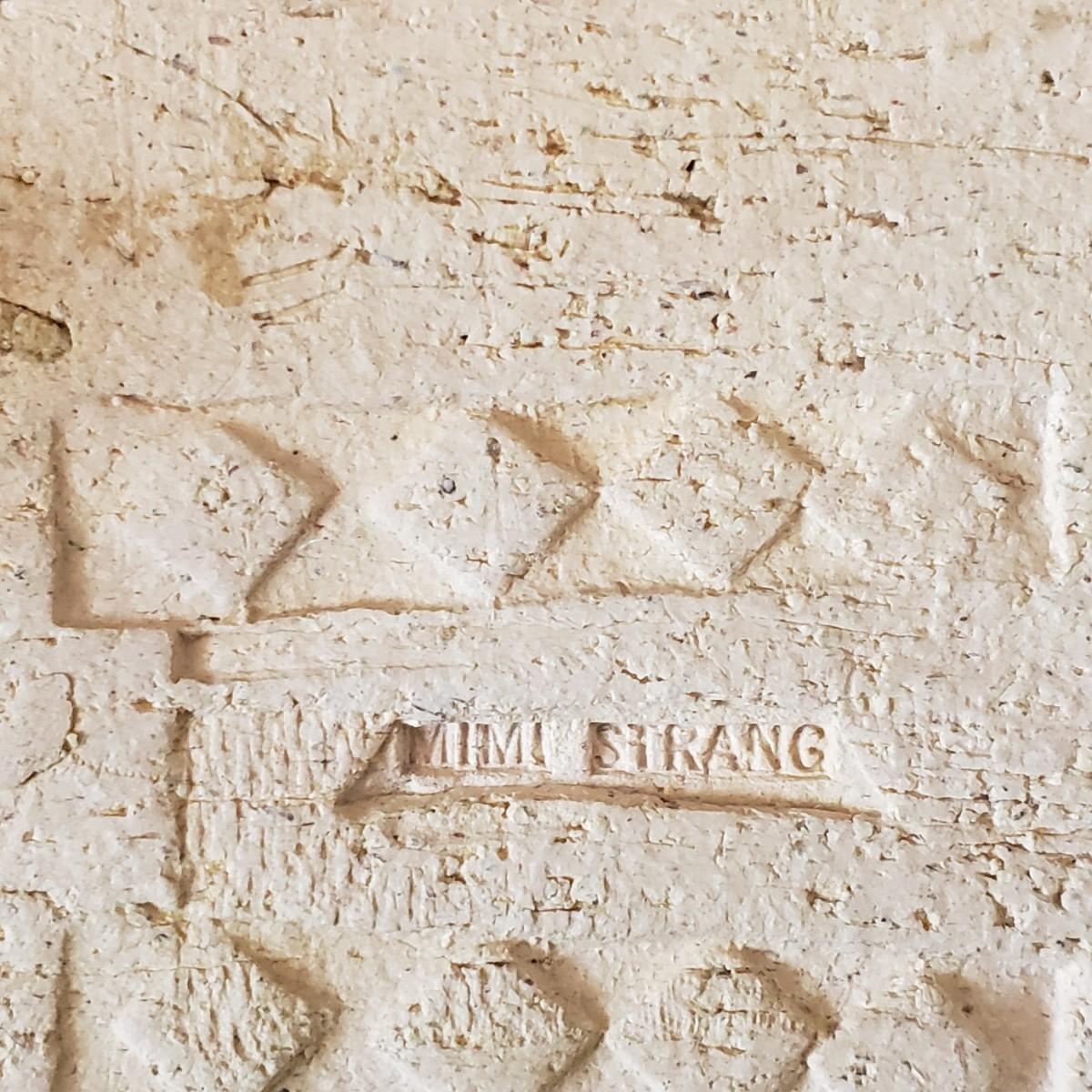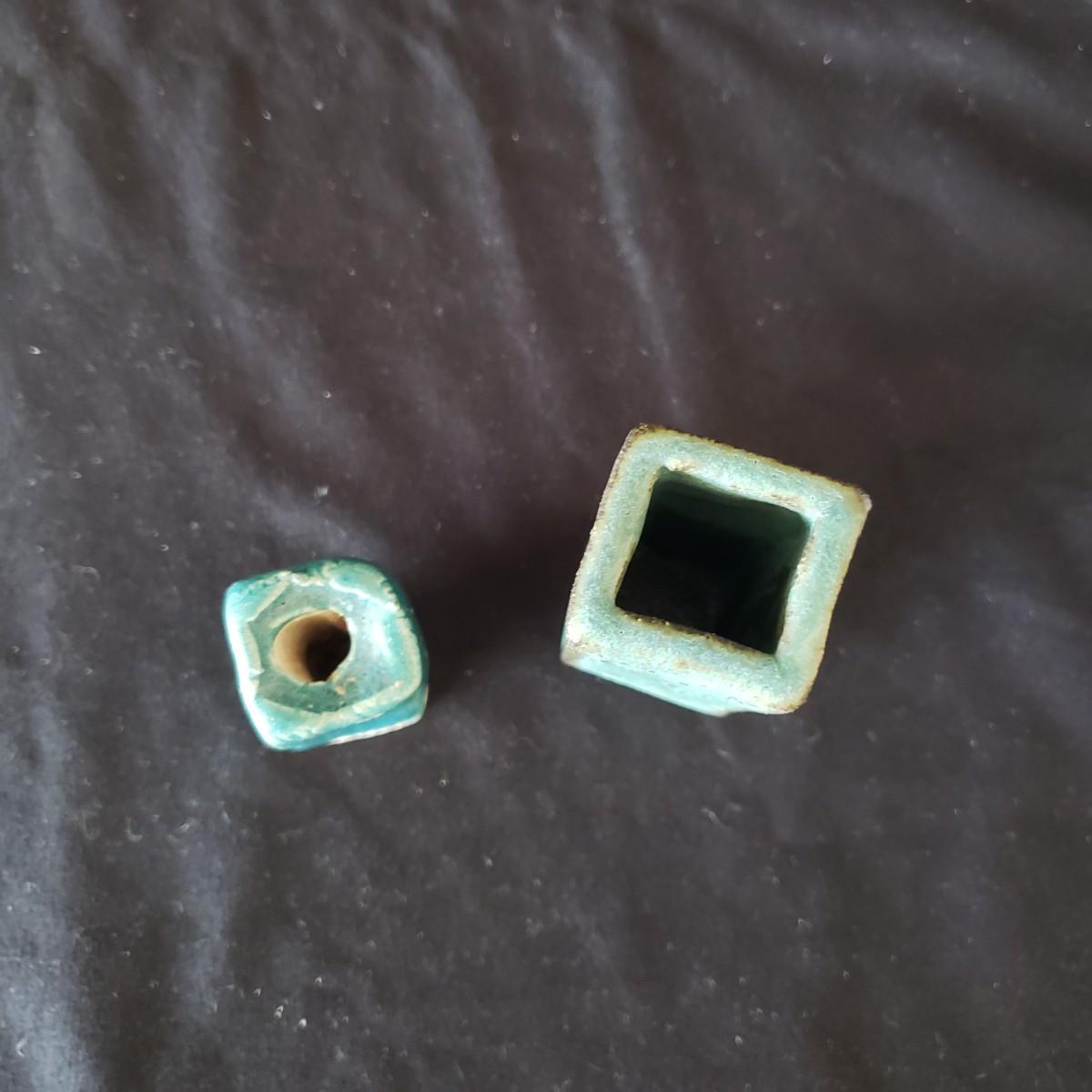 This nine piece lot features green inspired pottery. The handled green vase measures 6"D x 7"H. The lidded box is heavy to the touch and measures 6" x 5" x 8"H. The soap dish has Mim Strang stamped on the bottom. The two small bud vases are adorable. The smaller brown vase with handles has two different flowers on each side and a smooth glaze inside.