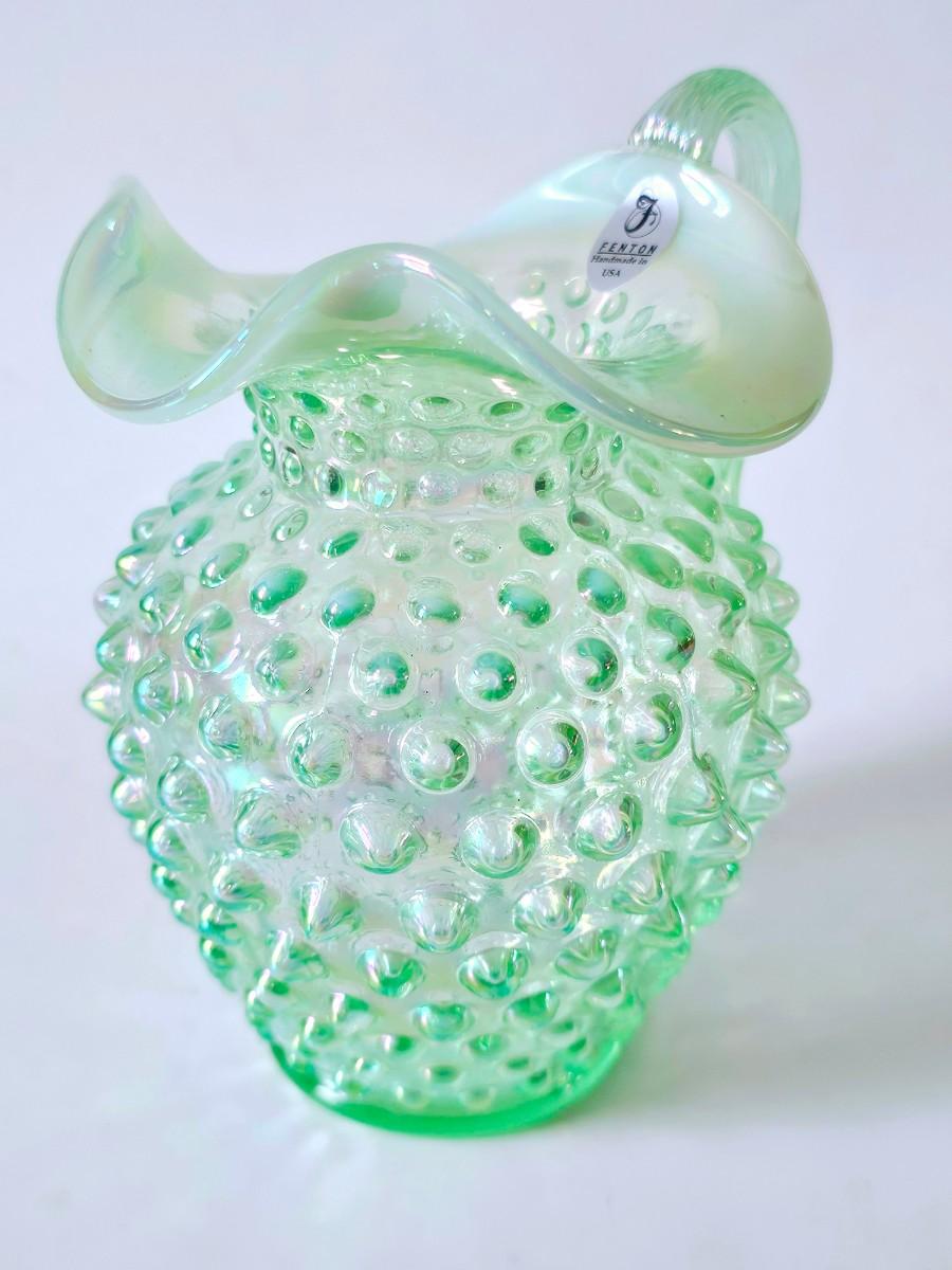 This original green iridescent Fenton jug has its Fenton sticker which is silver and says handmade in USA. This hobnail jug has the Fenton stamp on the bottom. It is iridescent, hob nail and stands a total of 5 inches tall with a ruffled top. It is a beautiful piece for any home. See photos and please note this is not uranium glass.