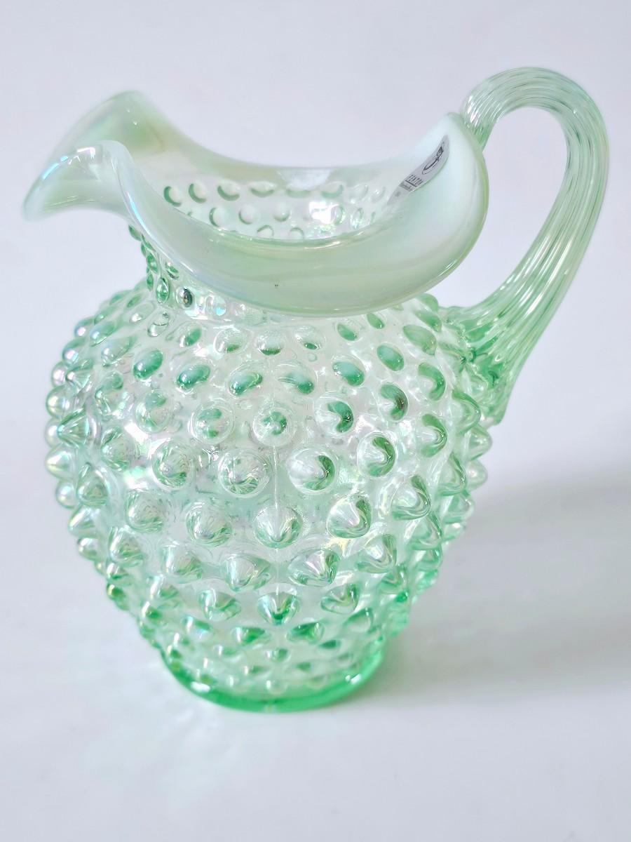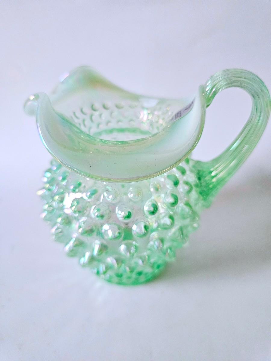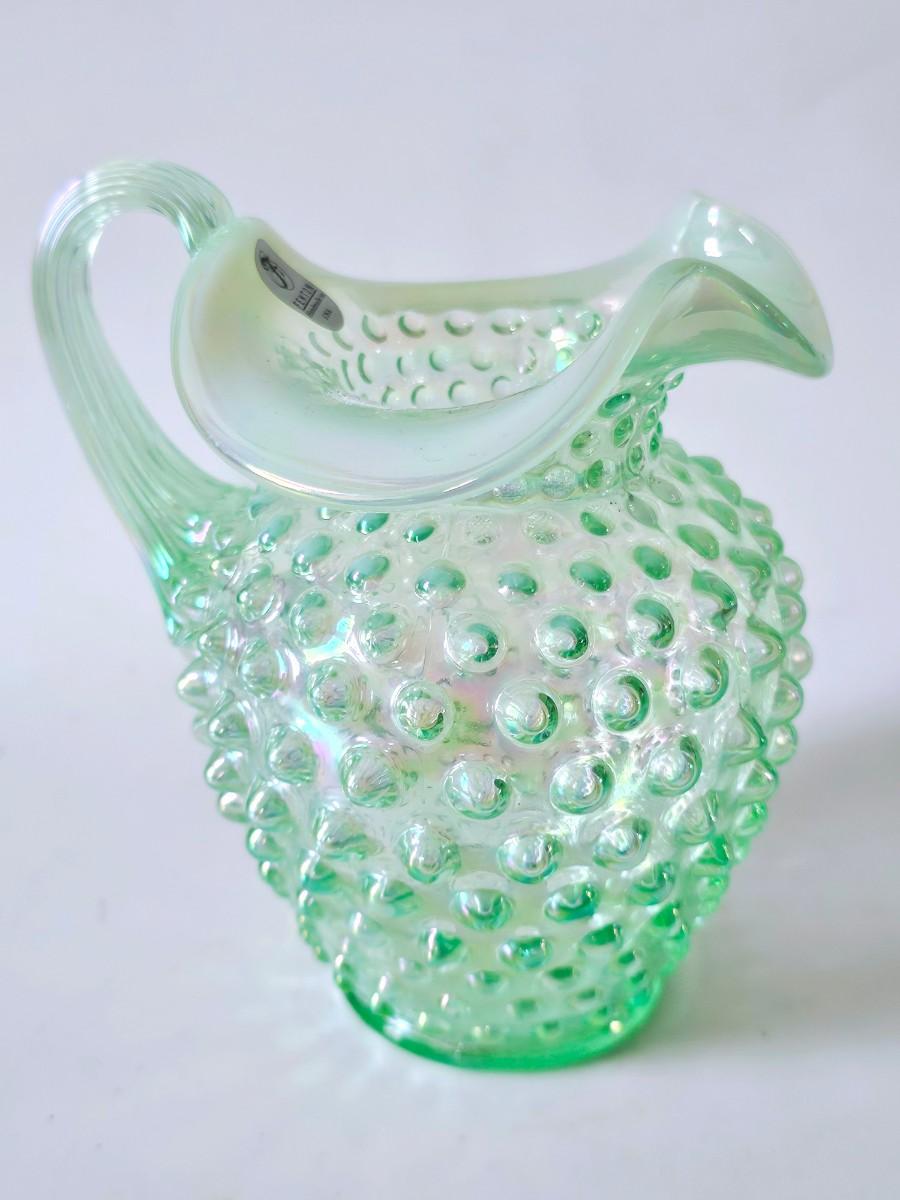 Green iridescent hobnail handled jug table decor Fenton glass with sticker, sauces sized for table decor