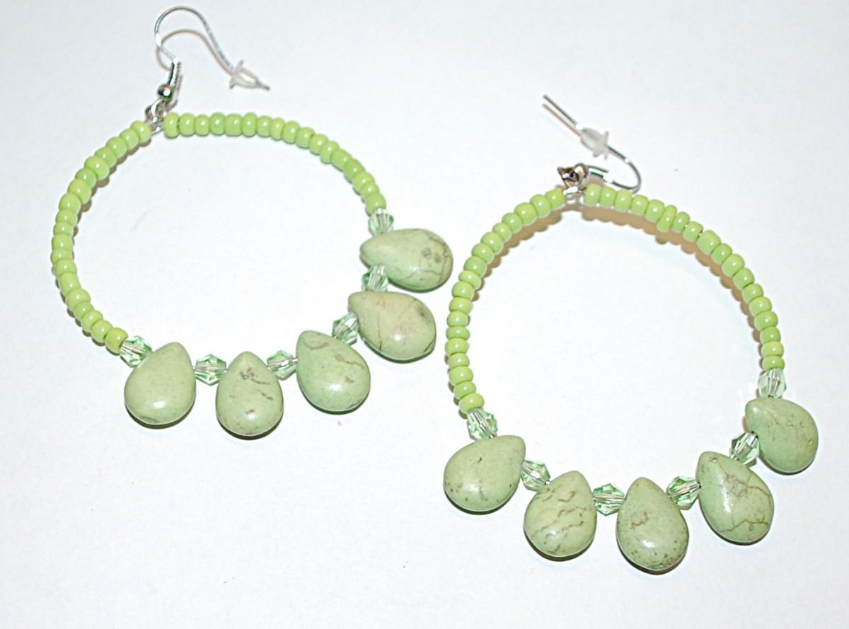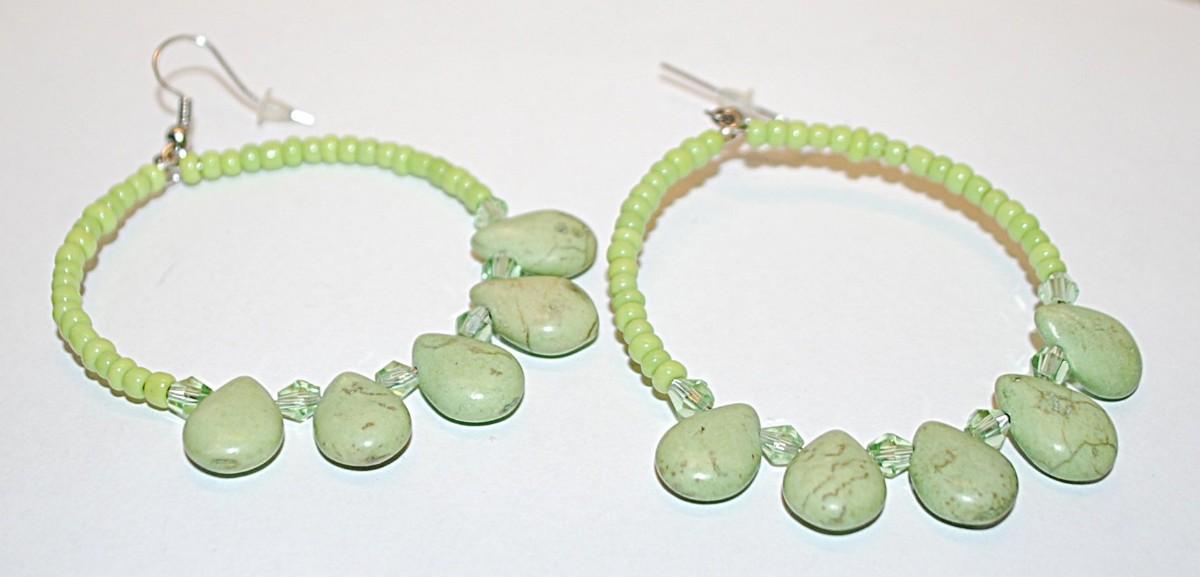 Green JADE-STYLE Teardrop Stones EARRINGS (2" Diam.) Set on a Beaded Circle and Wire Hook Clasp