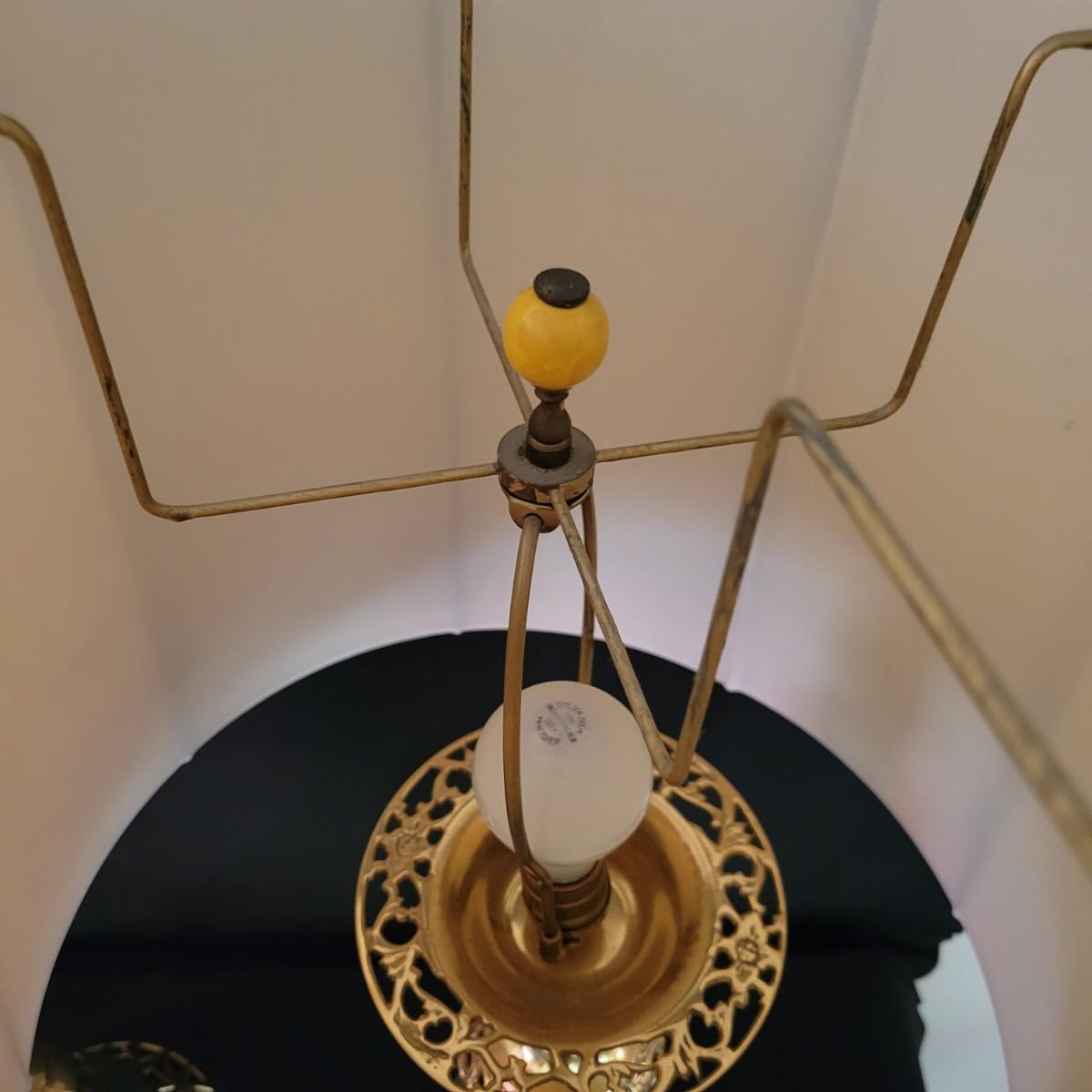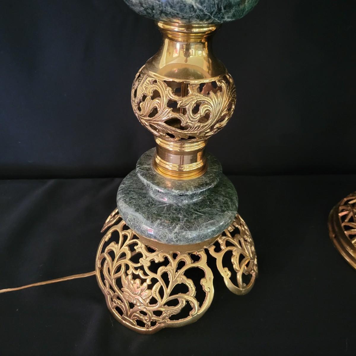 A pair of ornate, marble and brass lamps that powered on when plugged in. They feature rounded marble pieces with detailed brass accents. They have two way on and off switches on their cord and measures approximately 8"D x 37.5"H. Also included is a candlestick with the same colored marble and similar ornate design.