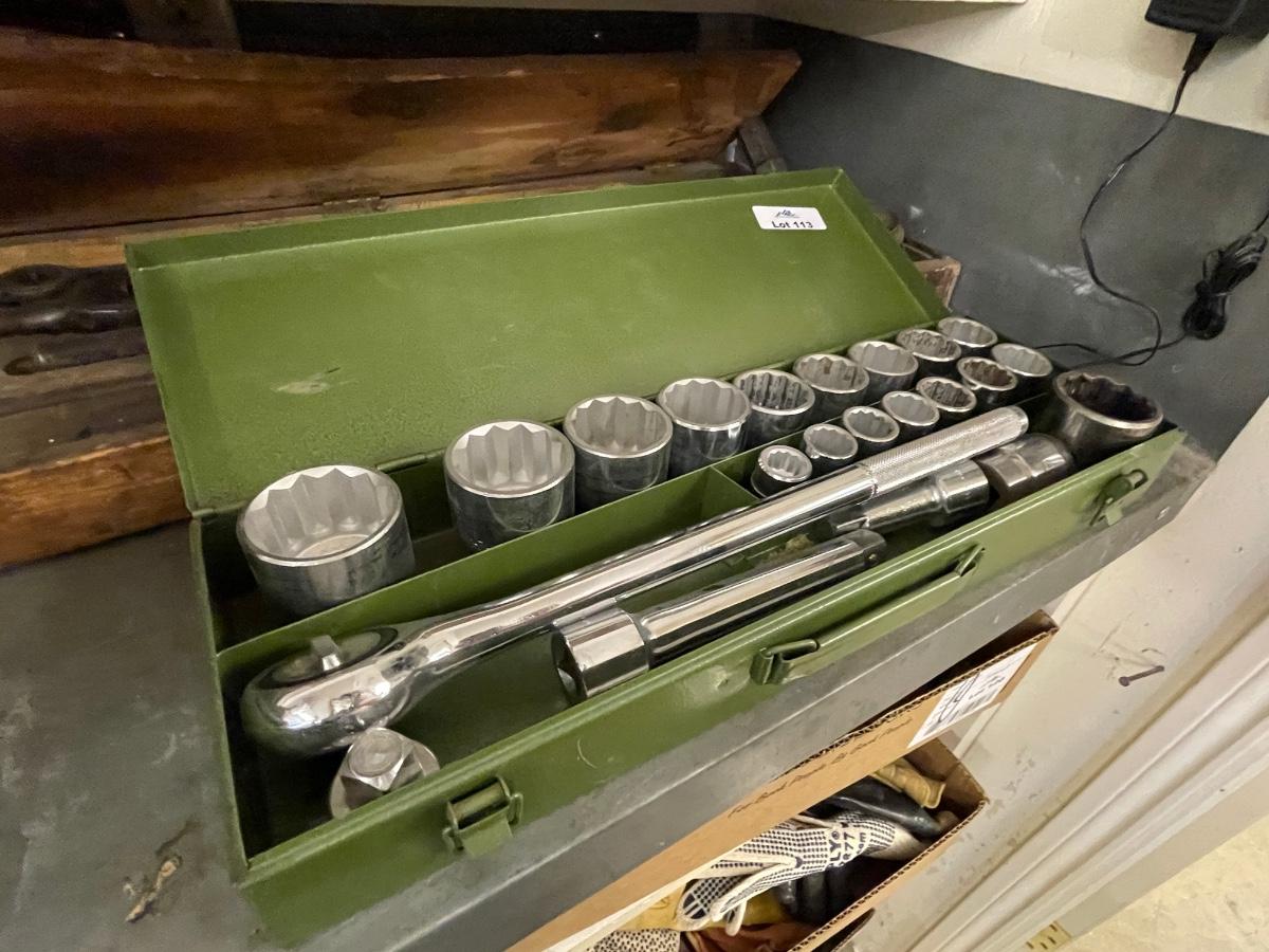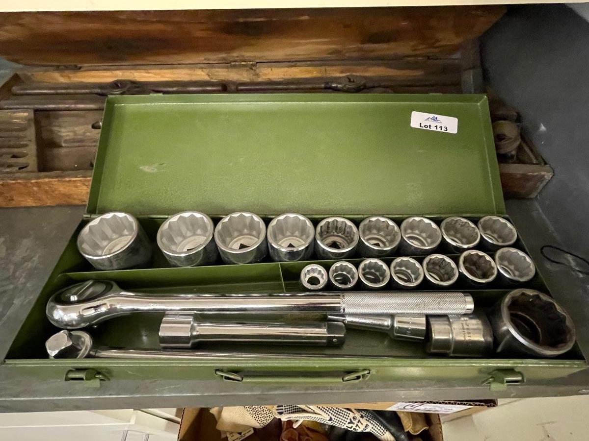 Green Metal Box w/Massive Socket Wrench & Large Diameter Sockets