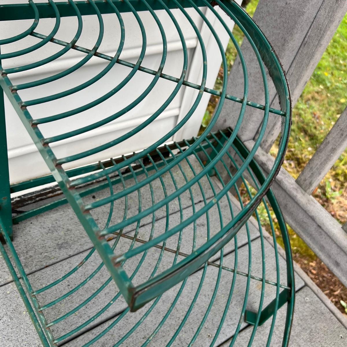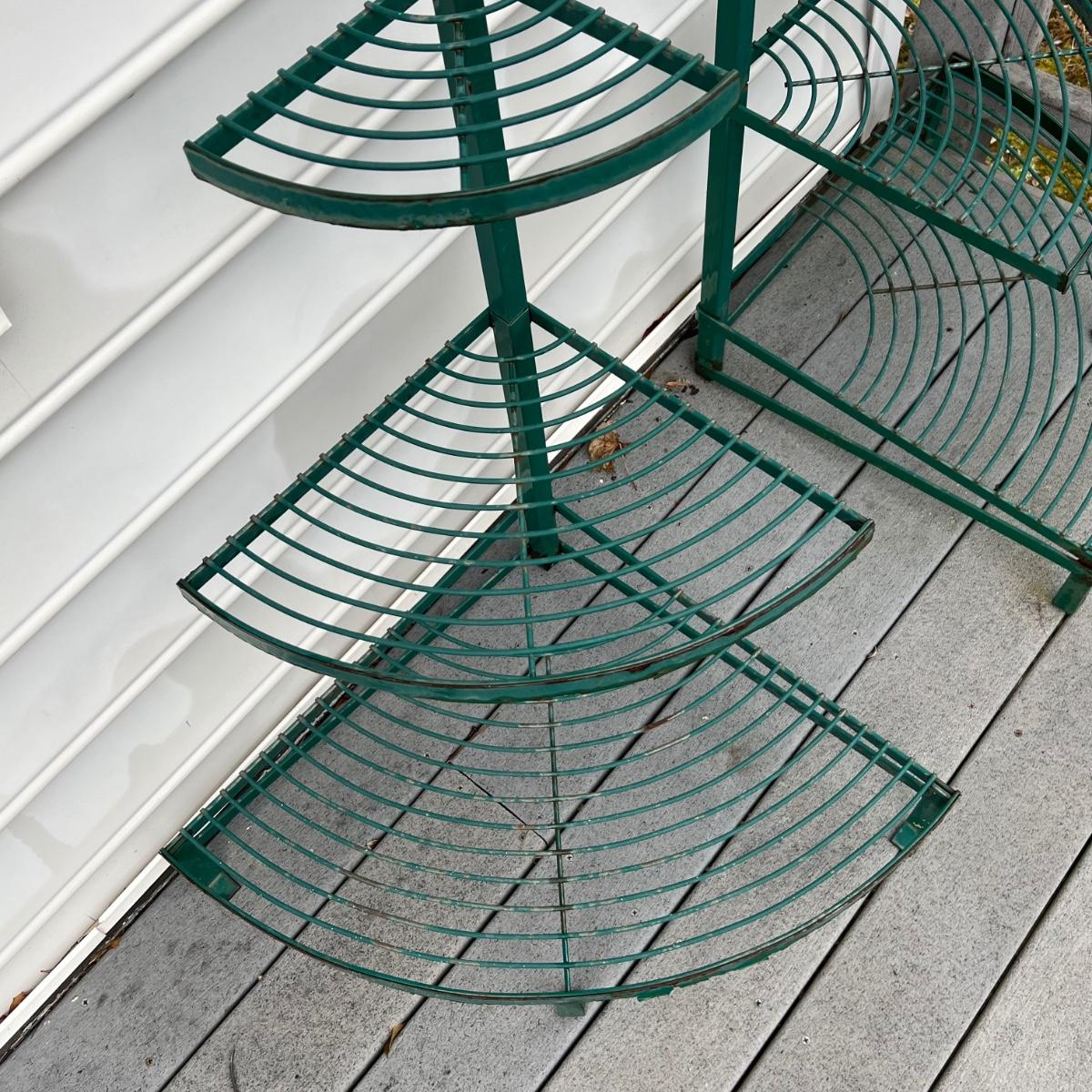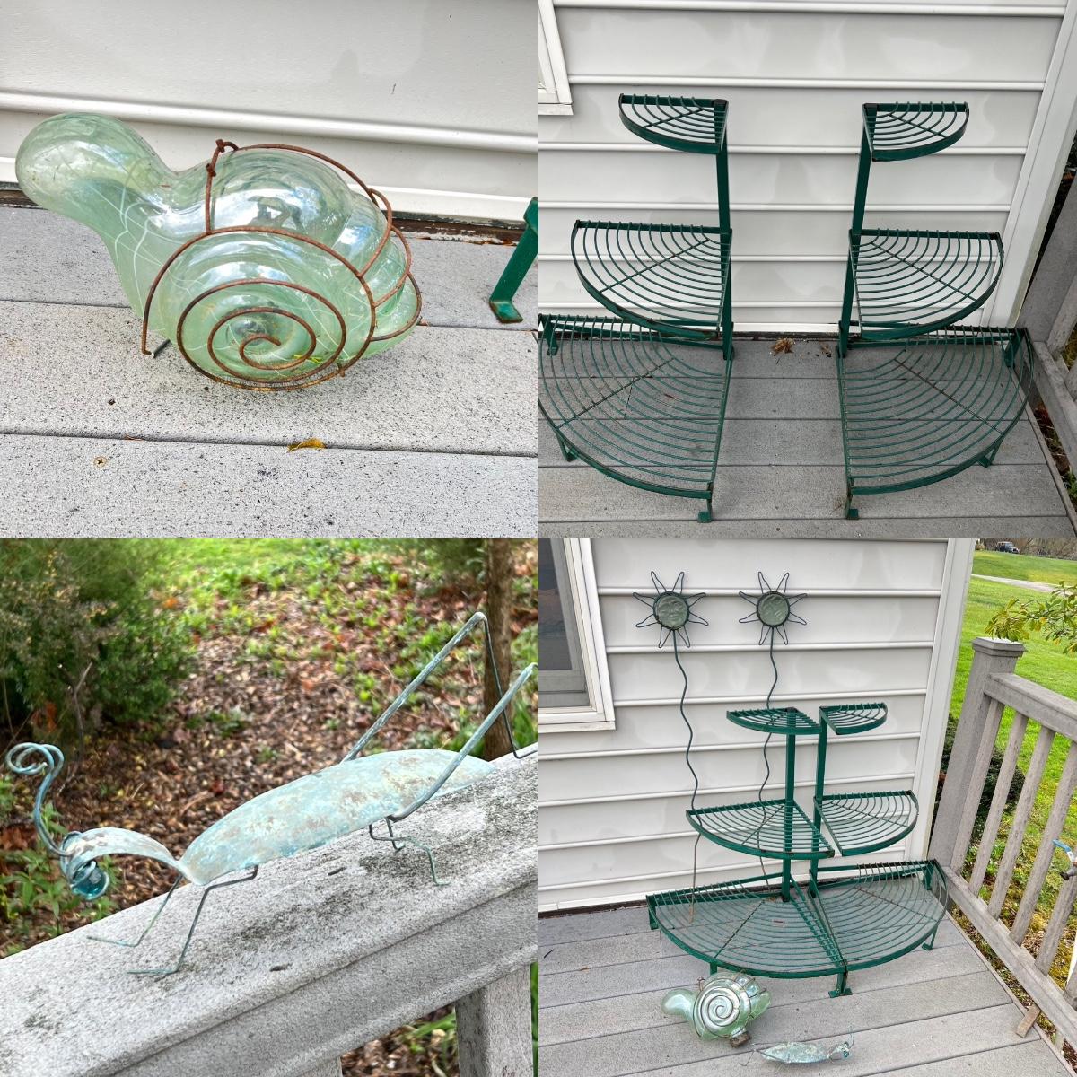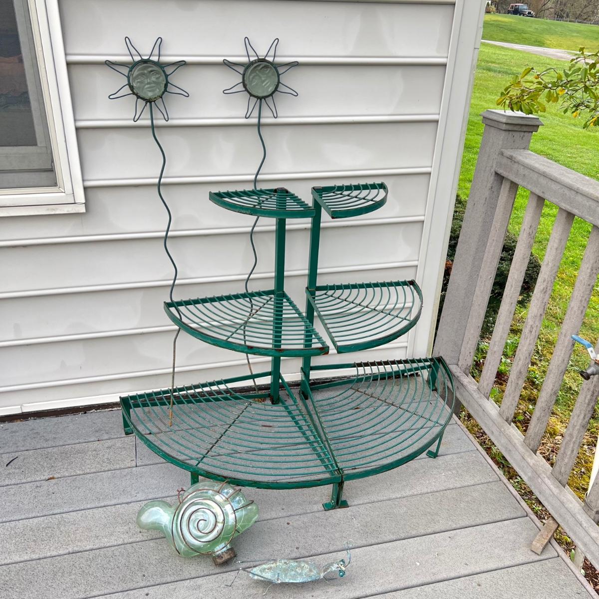 A pair of tiered metal plant stands that have a green coating, see images for measurements. Some of the coating has worn off with some rust on the metal. Also included are two similarly coated plant stakes with glass faces. The metal grasshopper has glass like plastic eyes and the turtle is also plastic that looks like glass; measures 13” x 6” x 11”H.