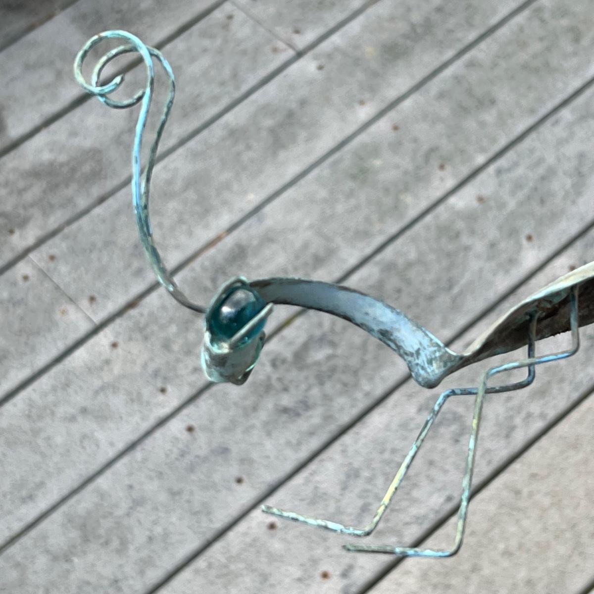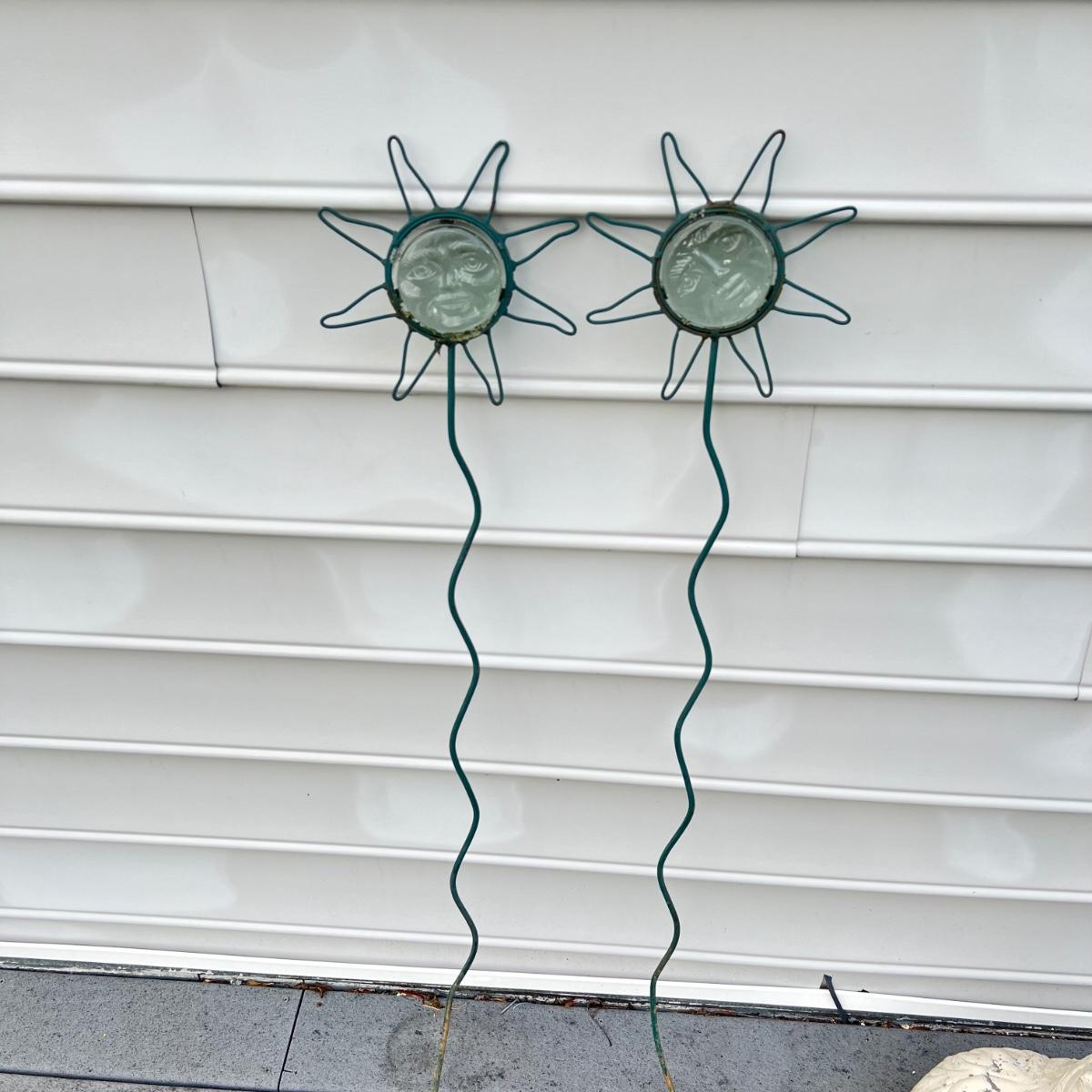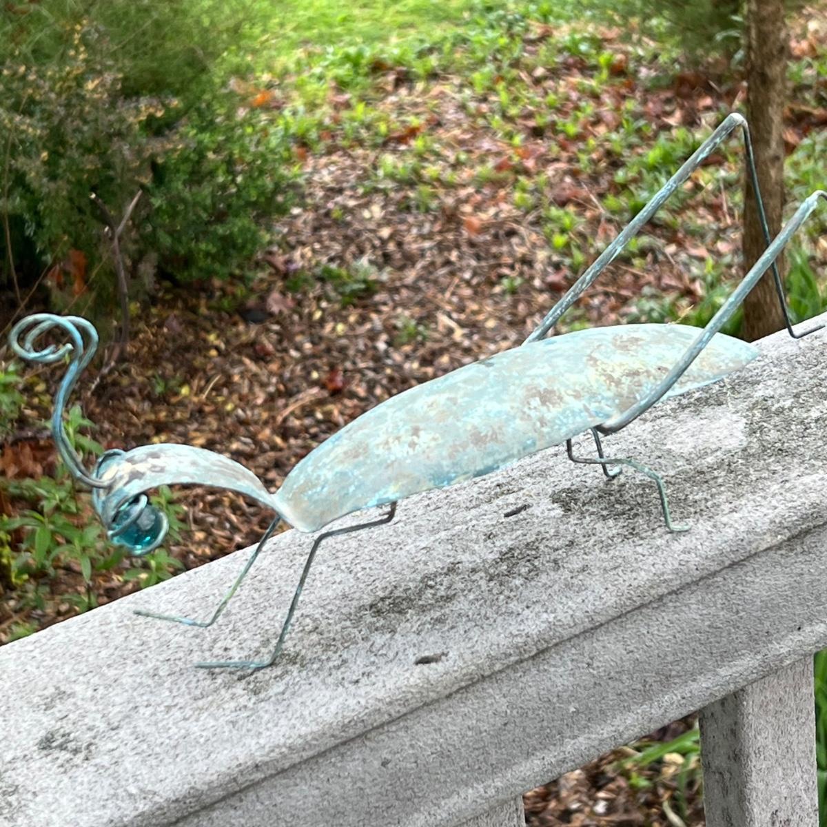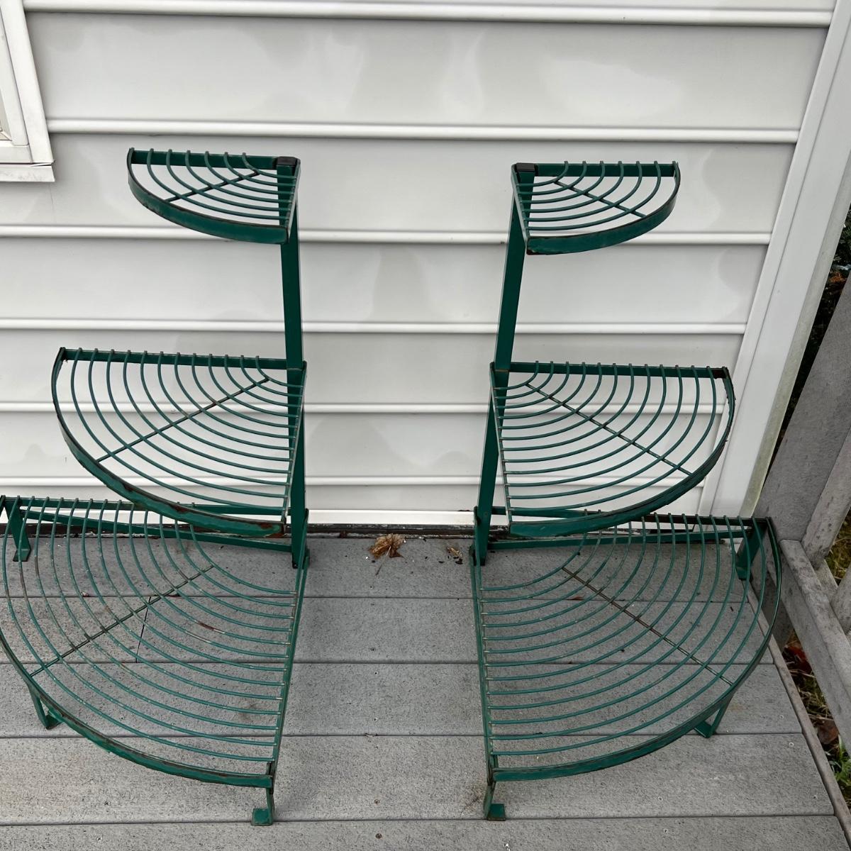 A pair of tiered metal plant stands that have a green coating, see images for measurements. Some of the coating has worn off with some rust on the metal. Also included are two similarly coated plant stakes with glass faces. The metal grasshopper has glass like plastic eyes and the turtle is also plastic that looks like glass; measures 13” x 6” x 11”H.
