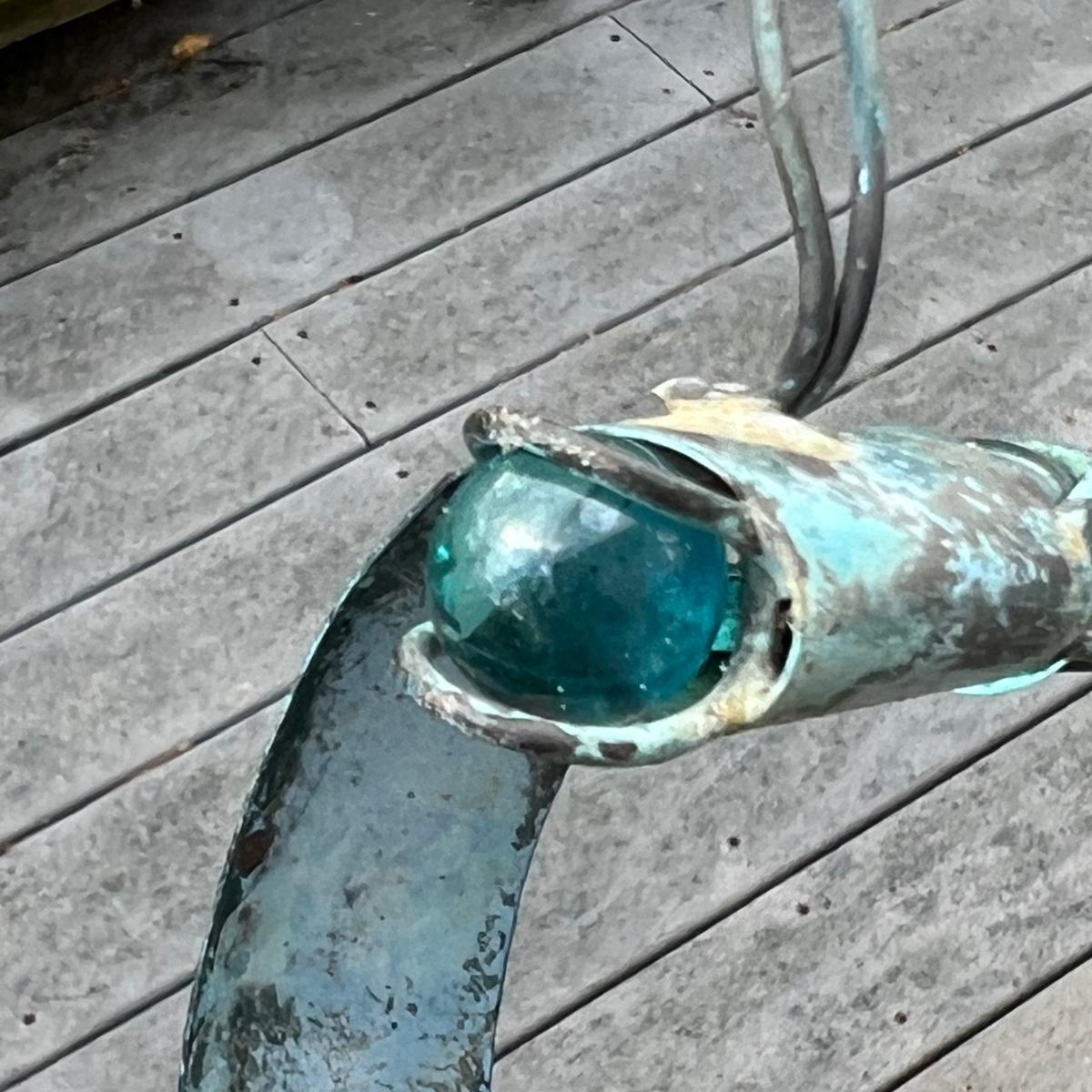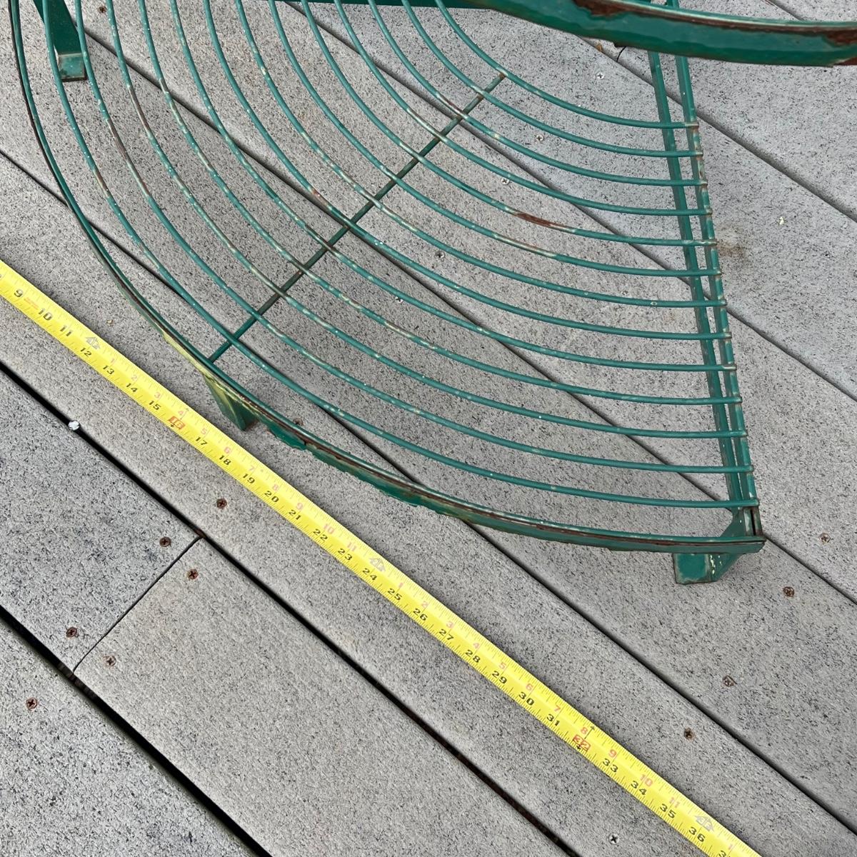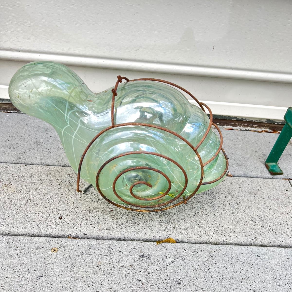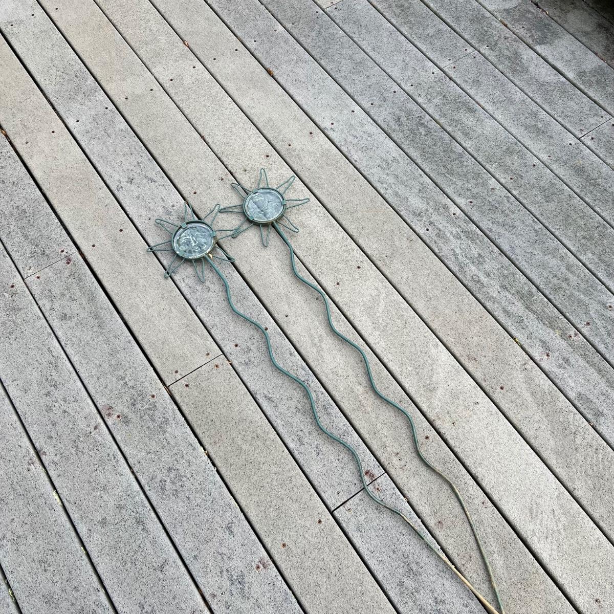 A pair of tiered metal plant stands that have a green coating, see images for measurements. Some of the coating has worn off with some rust on the metal. Also included are two similarly coated plant stakes with glass faces. The metal grasshopper has glass like plastic eyes and the turtle is also plastic that looks like glass; measures 13” x 6” x 11”H.