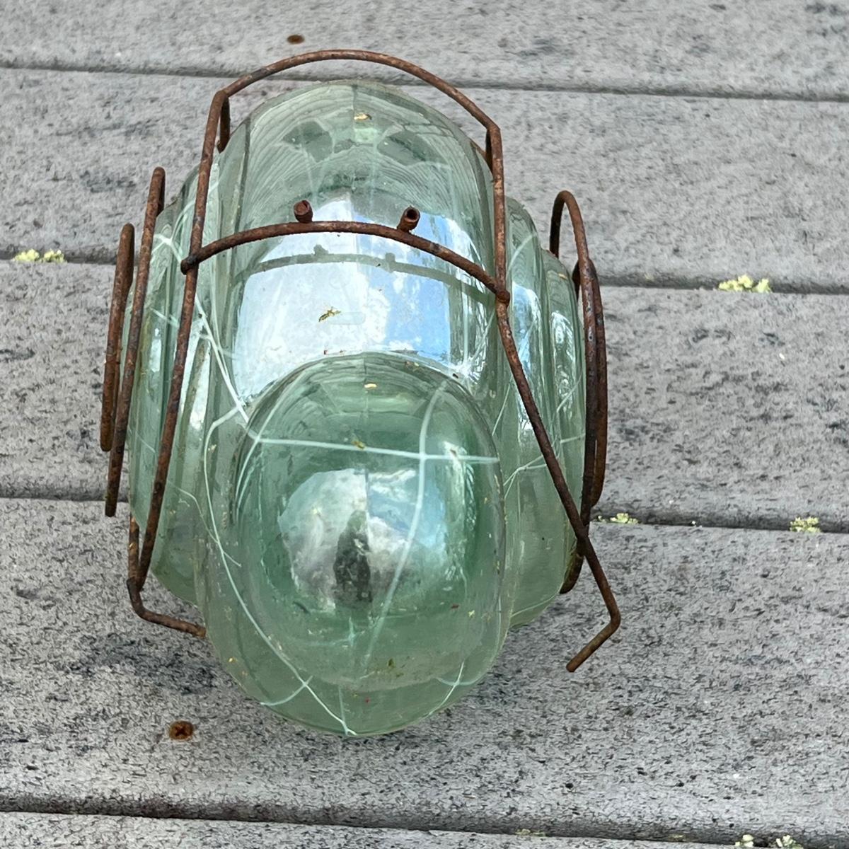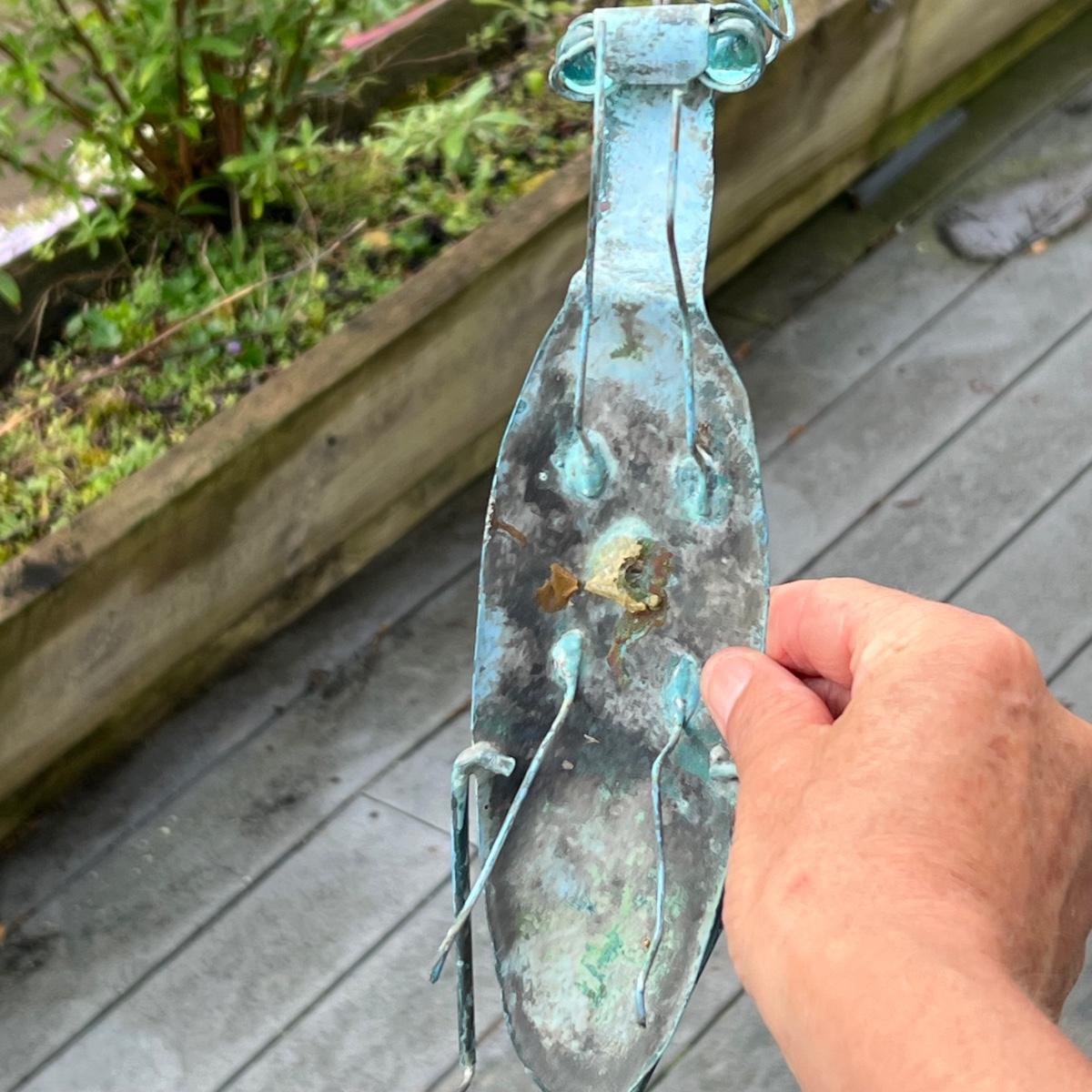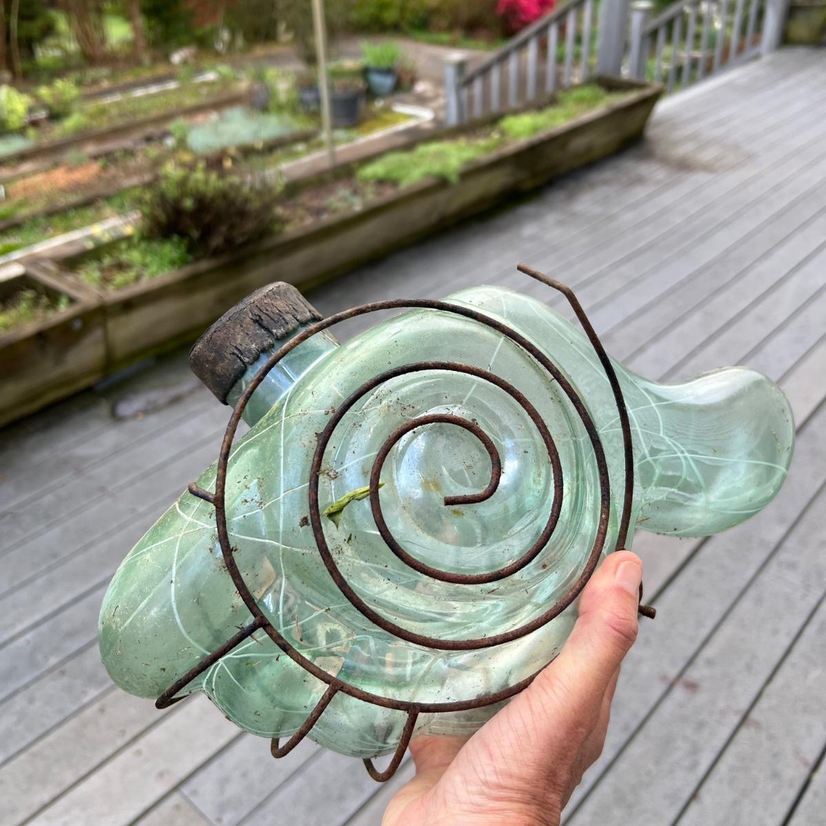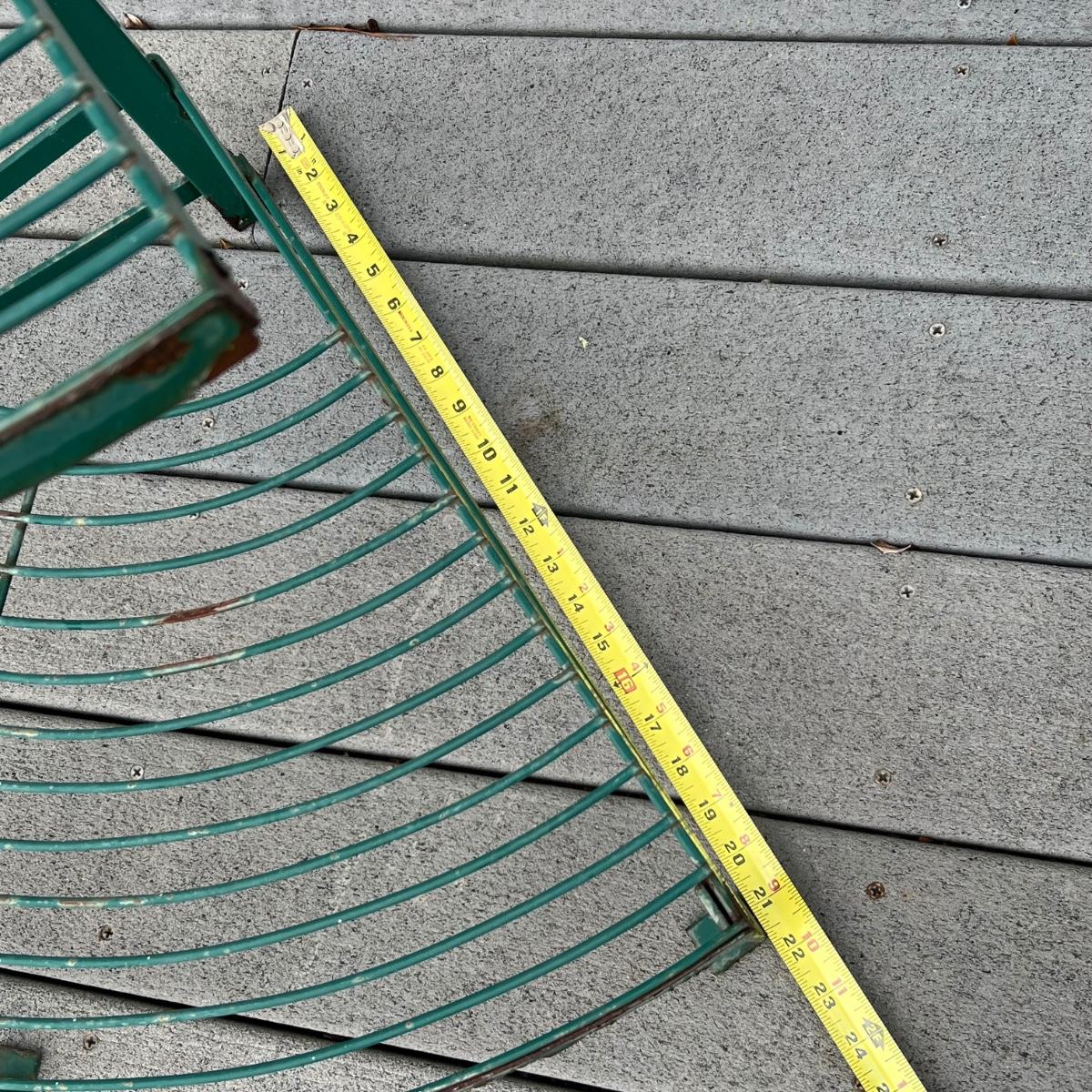 A pair of tiered metal plant stands that have a green coating, see images for measurements. Some of the coating has worn off with some rust on the metal. Also included are two similarly coated plant stakes with glass faces. The metal grasshopper has glass like plastic eyes and the turtle is also plastic that looks like glass; measures 13” x 6” x 11”H.
