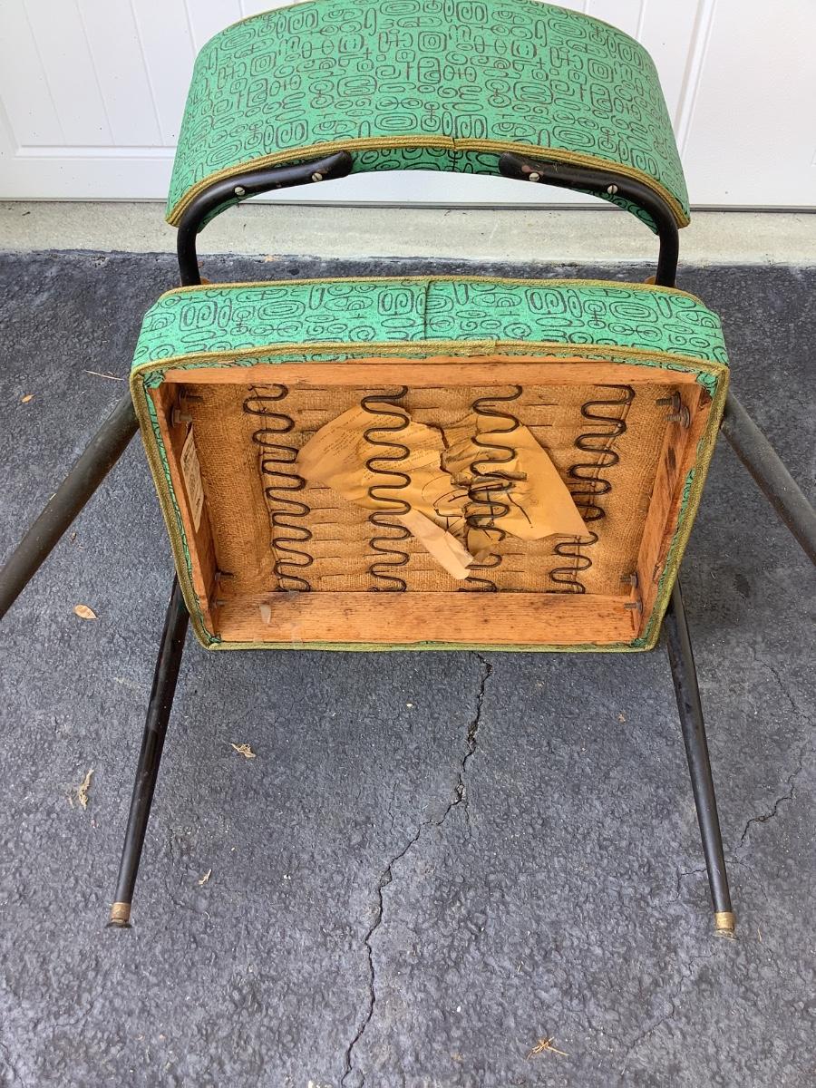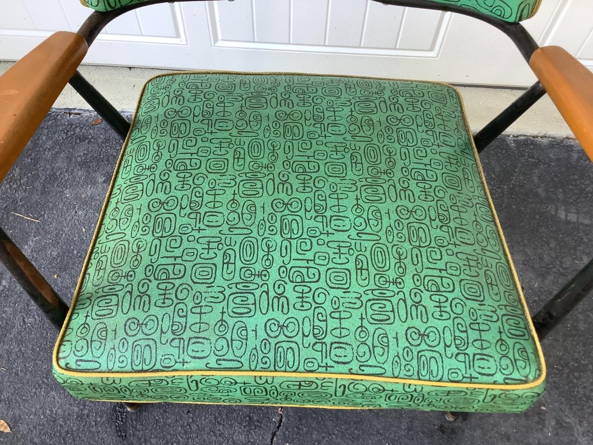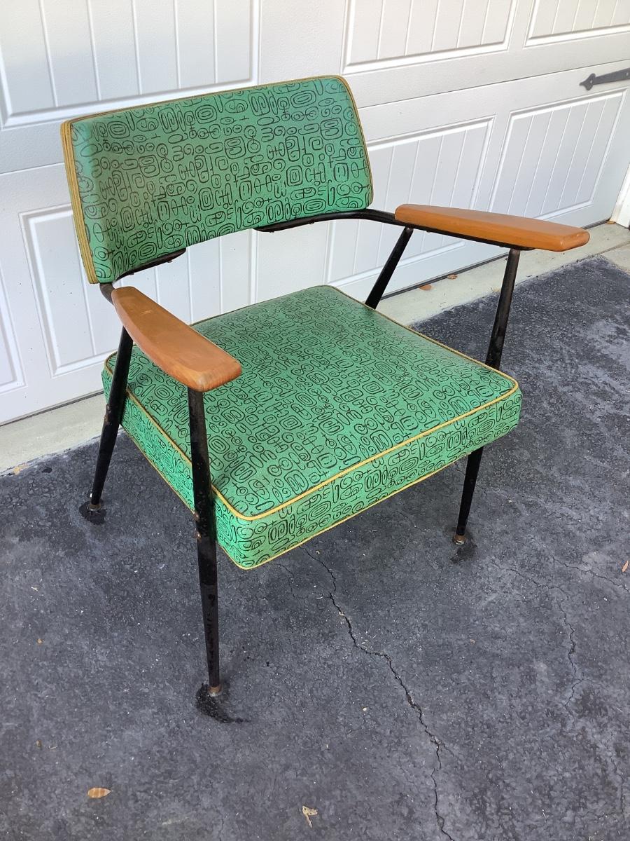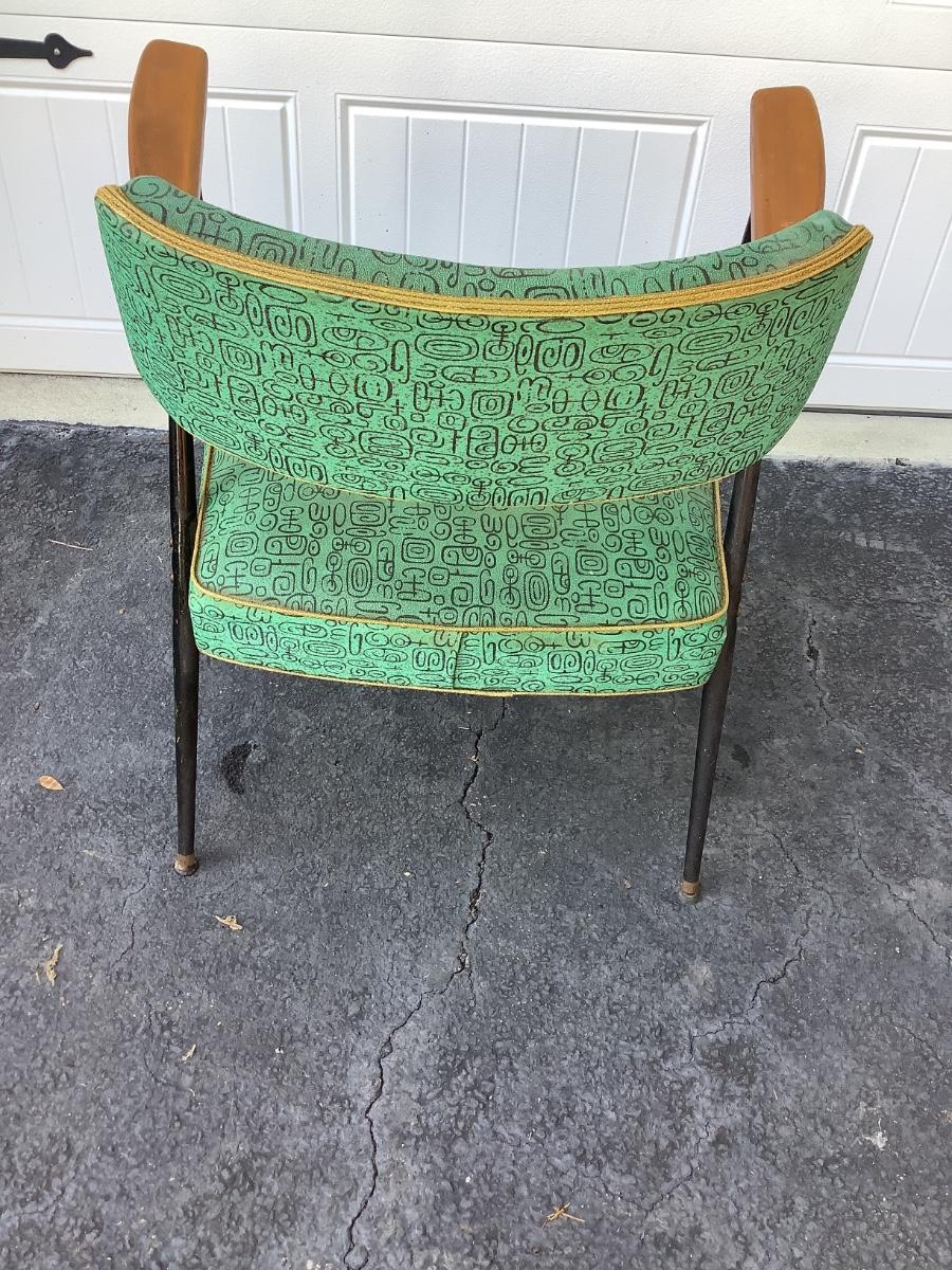 Green Mid-Century design padded chair with wooden arms, metal legs 29"H 25"W 19"seat depth