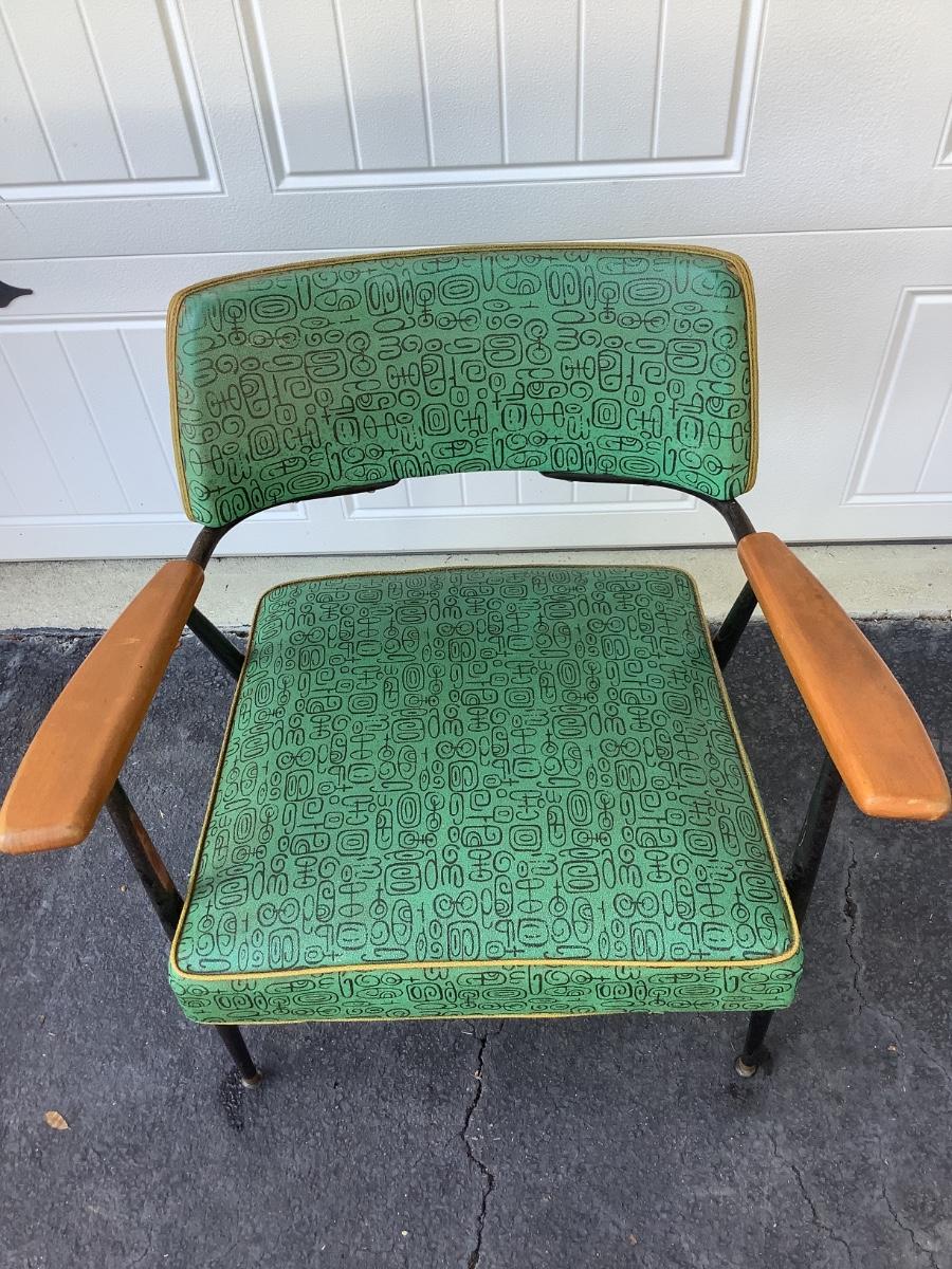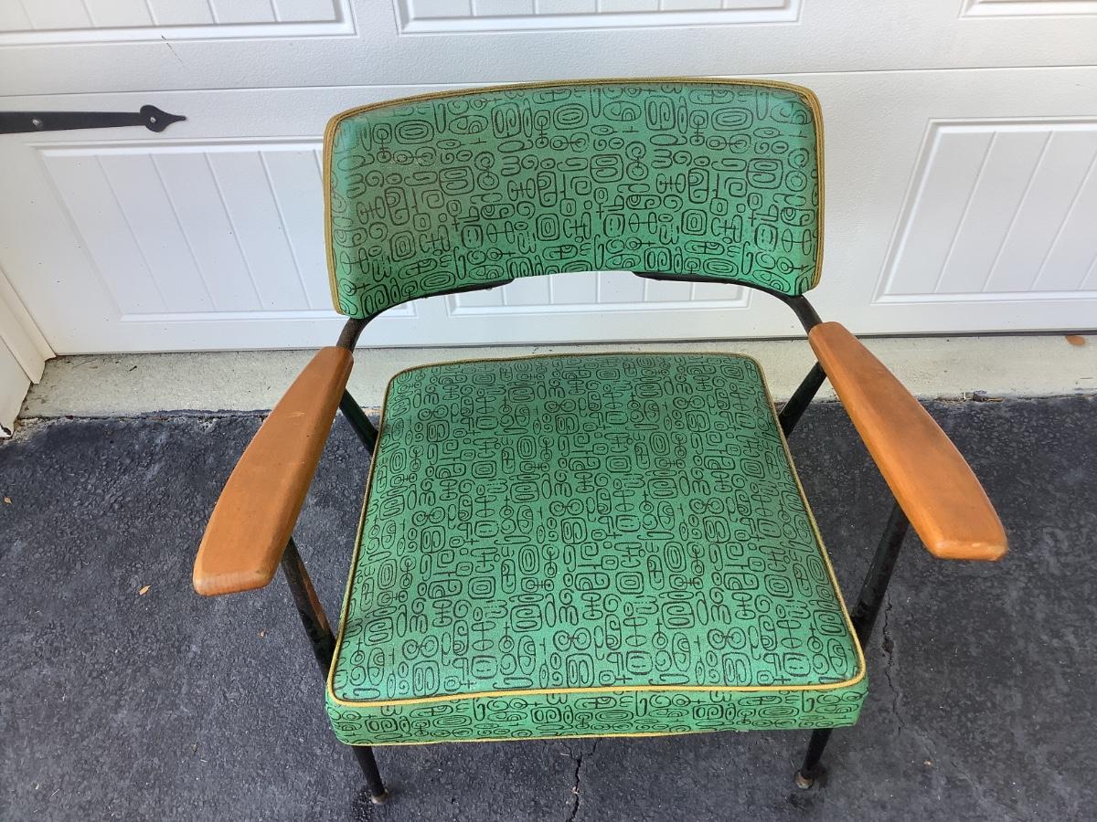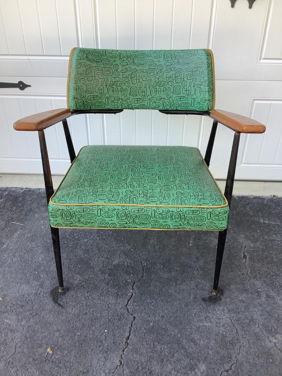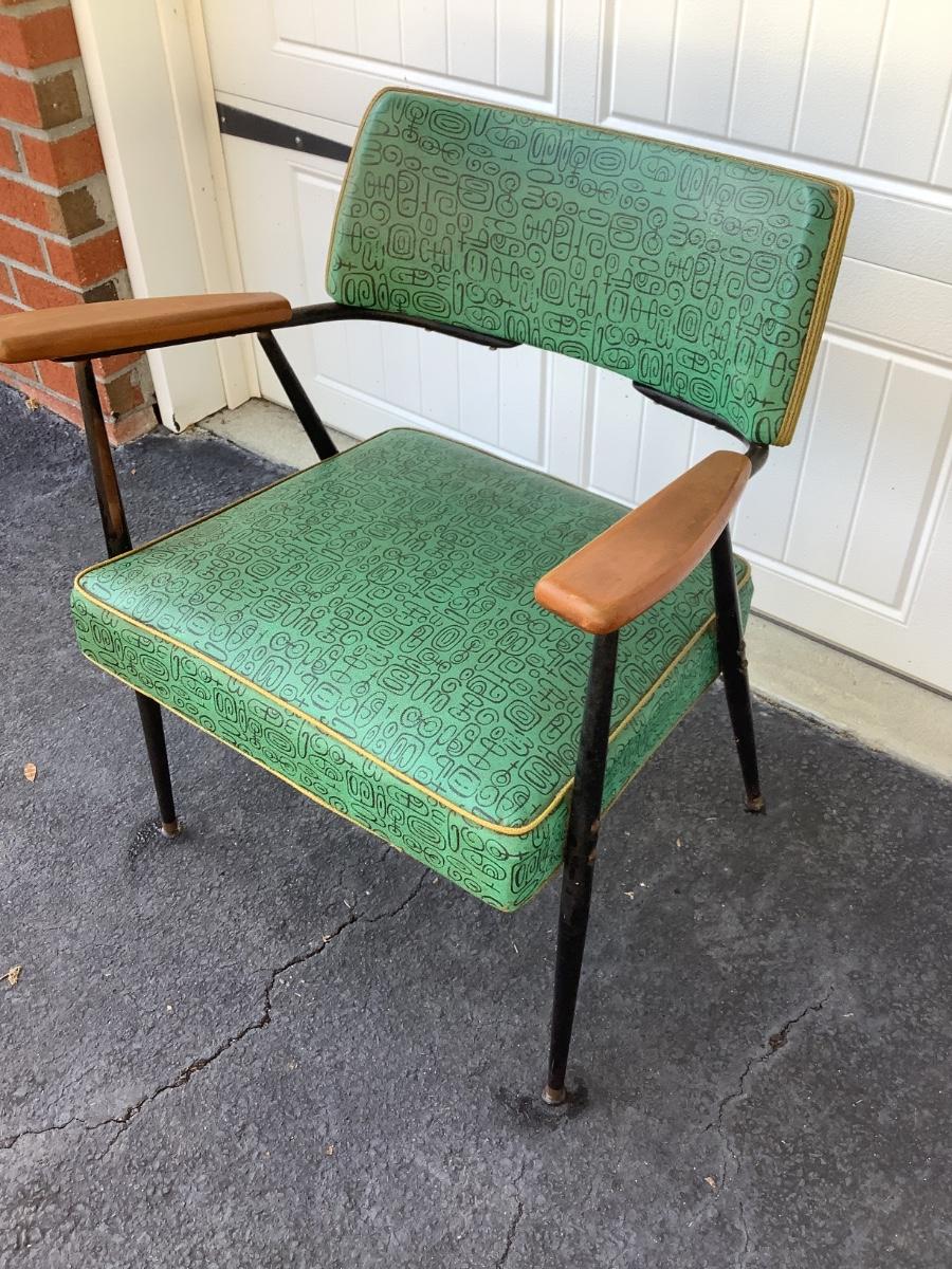 Green Mid-Century design padded chair with wooden arms, metal legs 29"H 25"W 19"seat depth