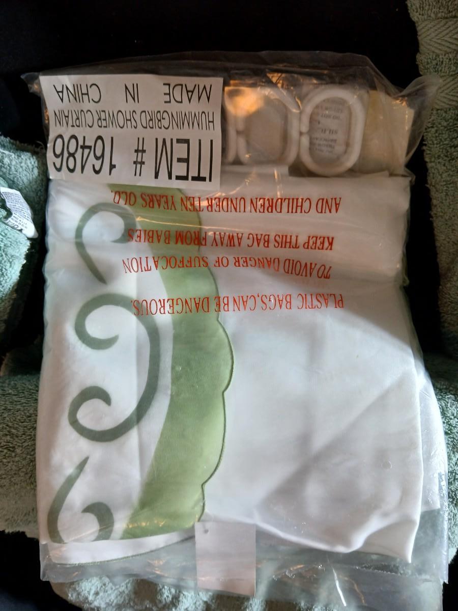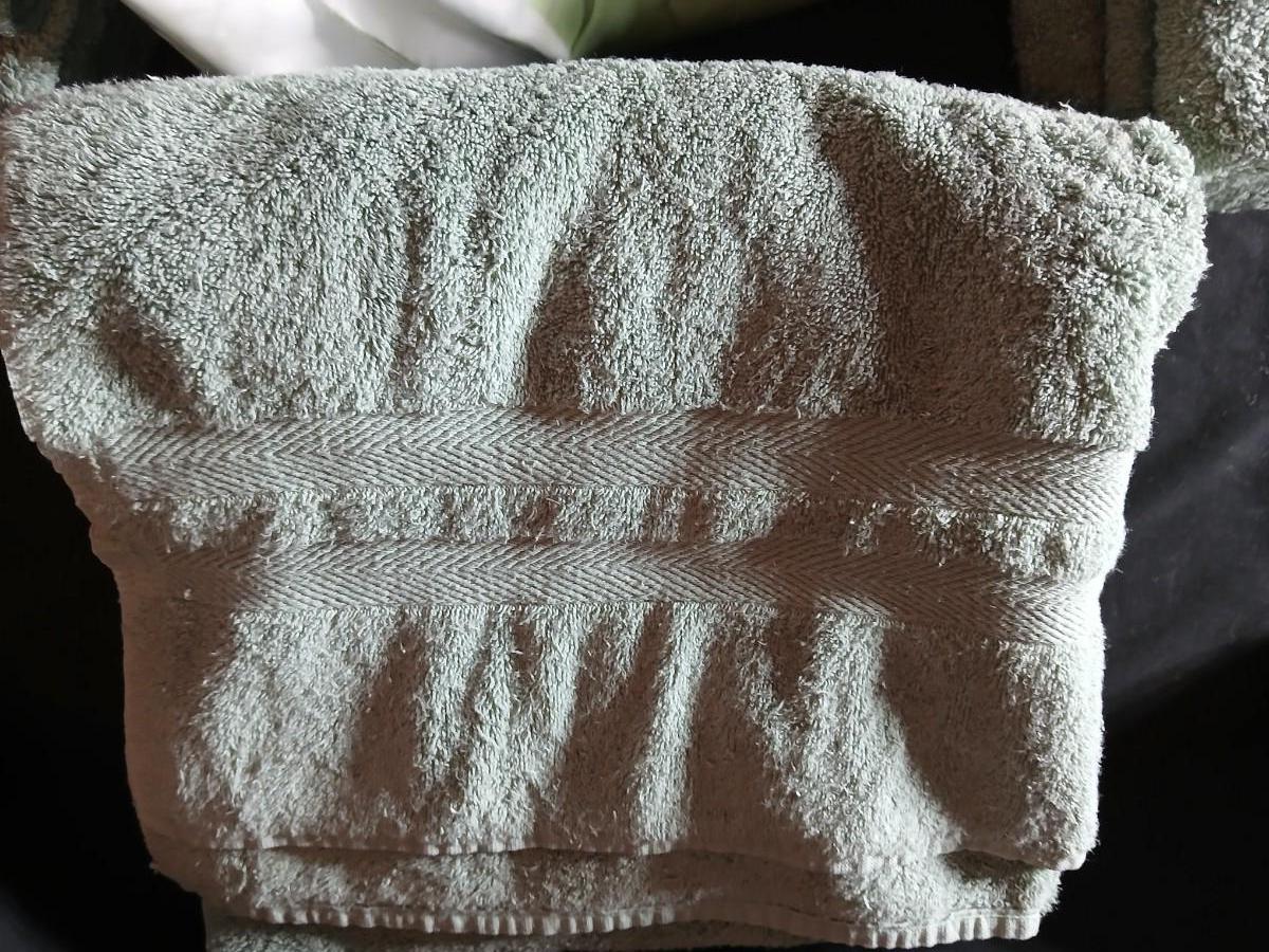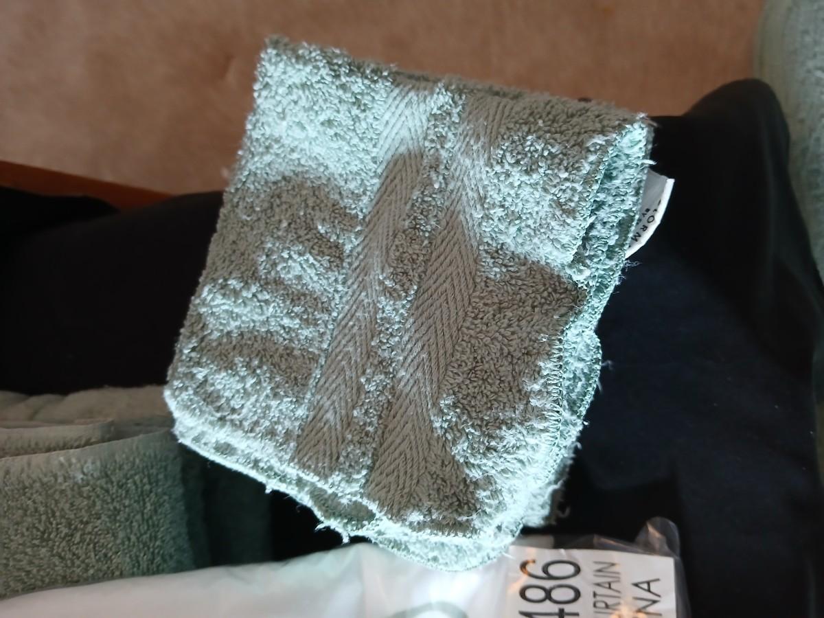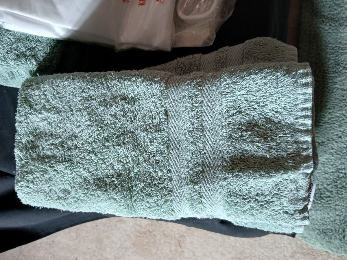Green Mist bathrug with matching towels and a shower curtain