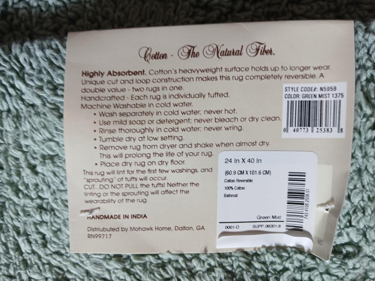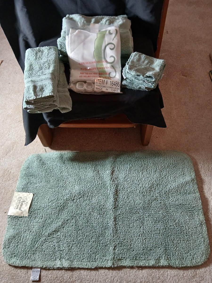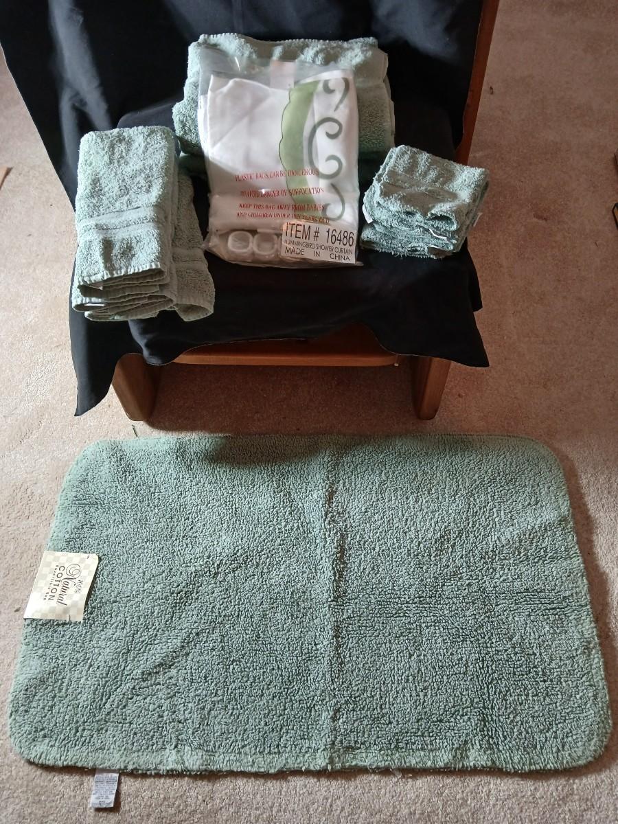 Green Mist bath rug with matching towels and a shower curtain