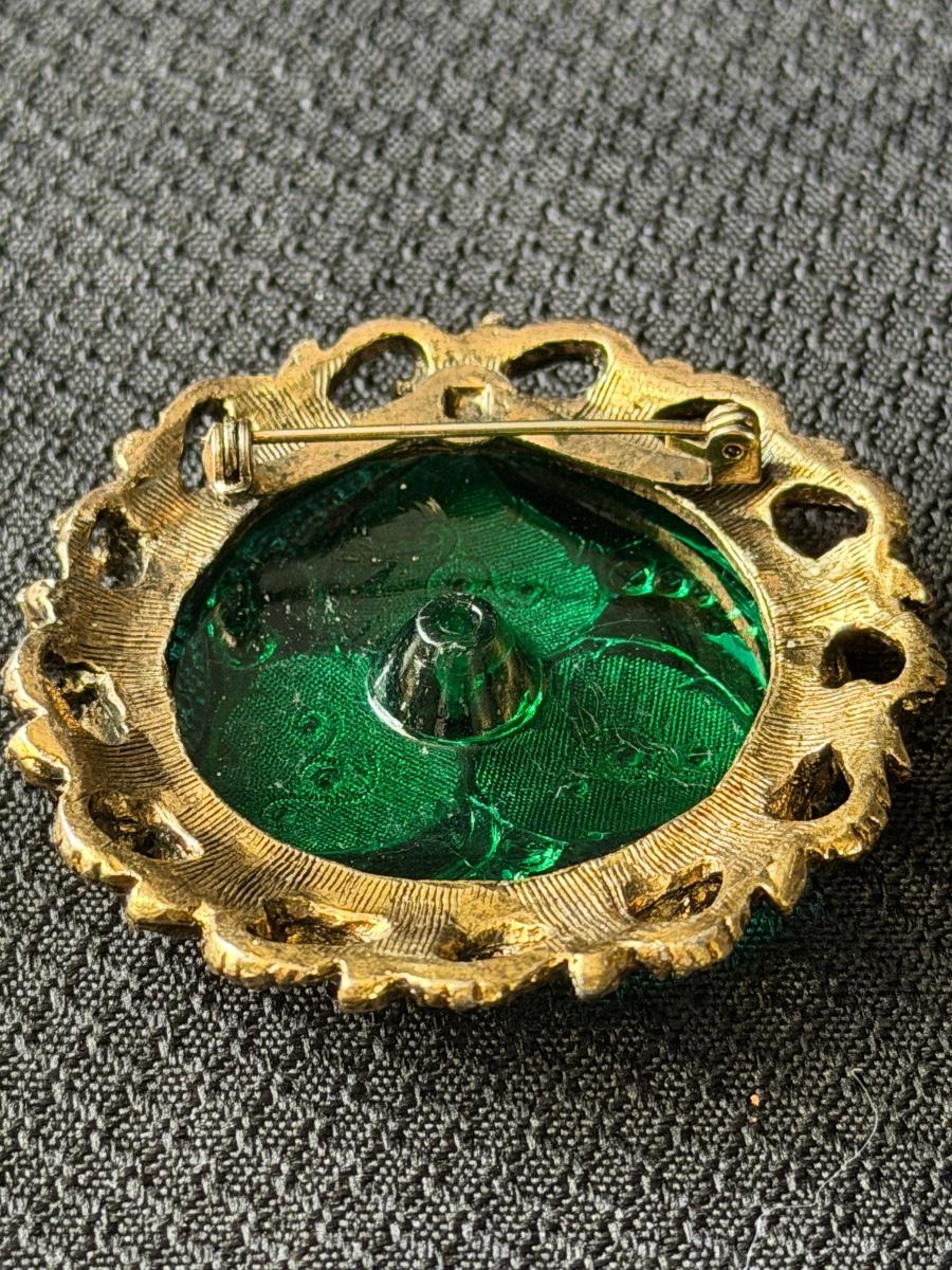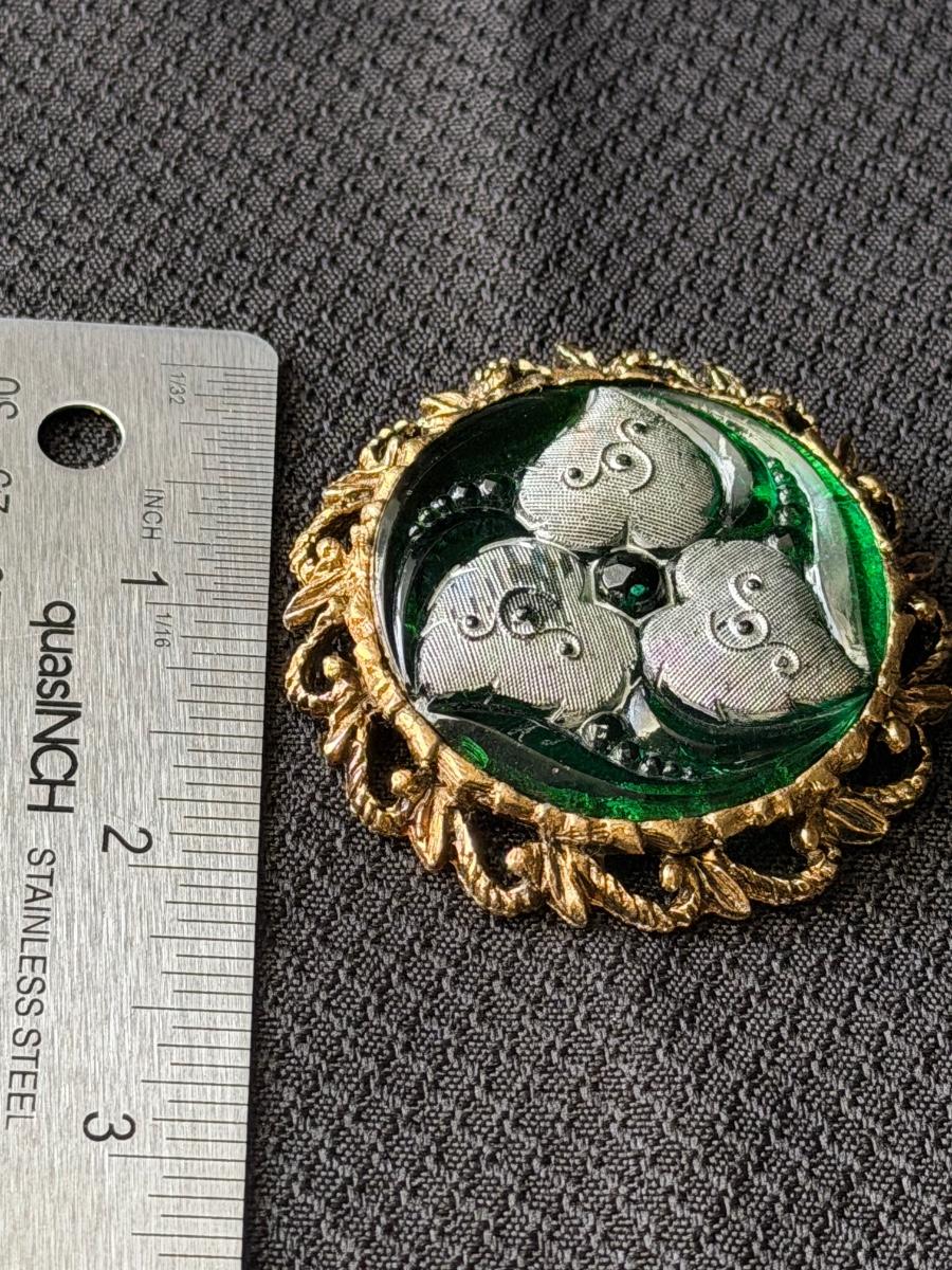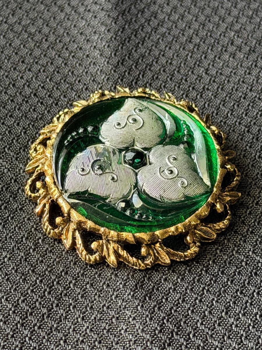 Green Molded Carnival Glass Heart Brooch. Unique Vintage