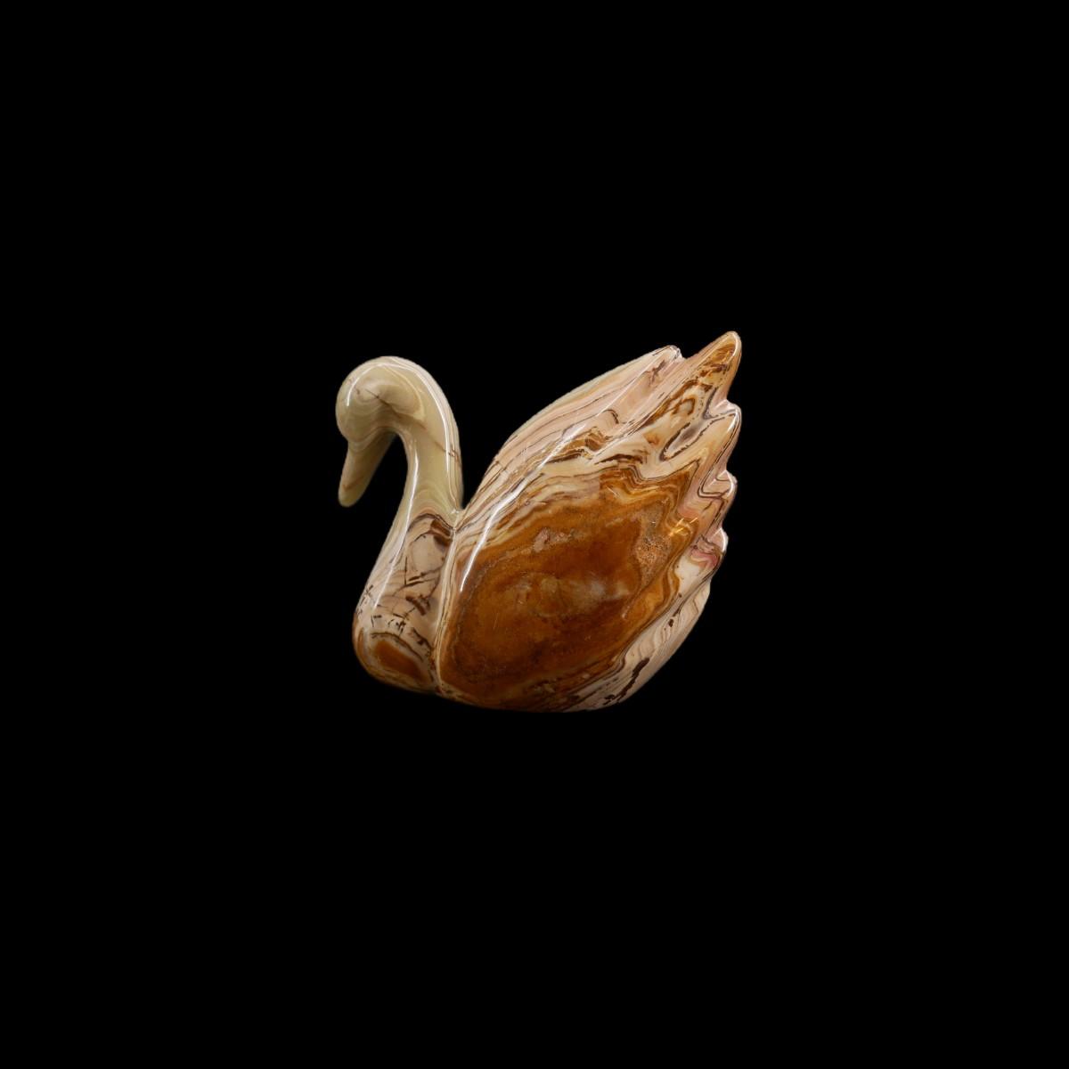 Hand carved solid green onyx stone swan. Gorgeous green, white, and brown striations. No issues found, superb condition! Measures L 6.5" x H 5.5" x W 2.5". Weighs 2 lb 11 oz. (D40)