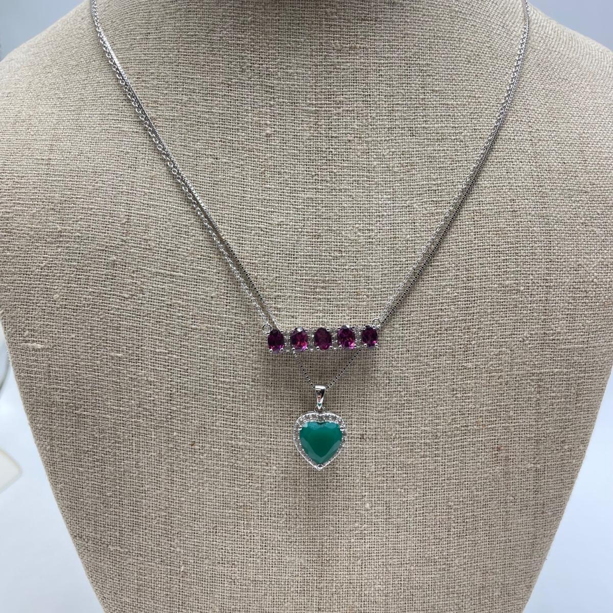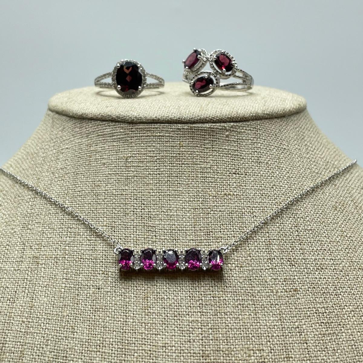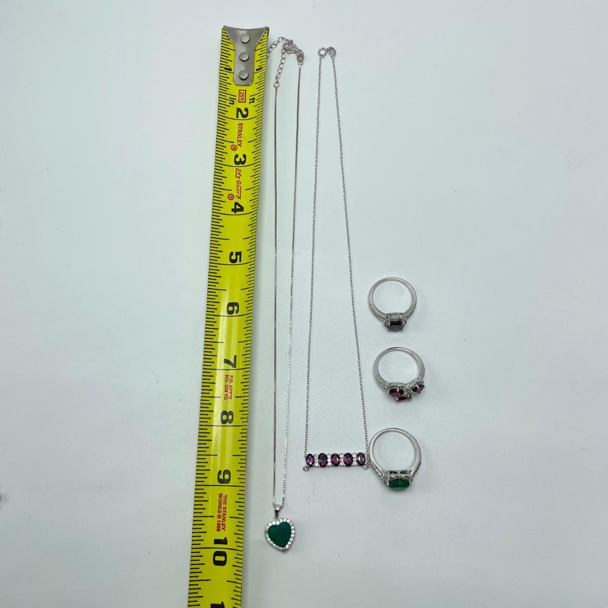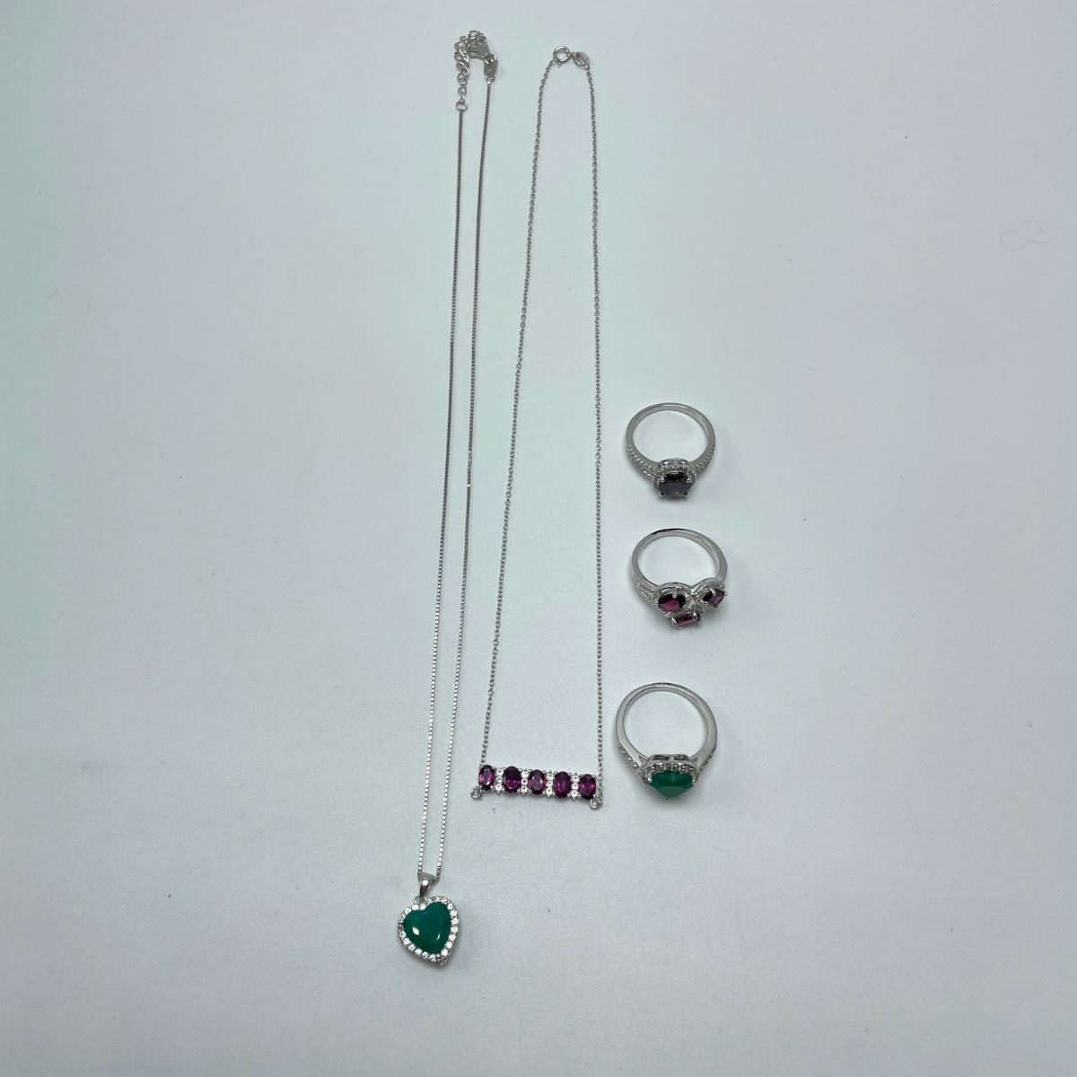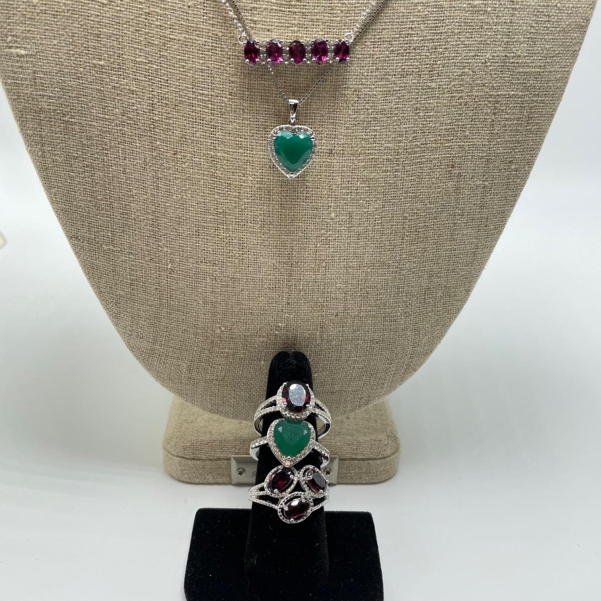 Lot holds a matching ring and necklace set, both marked 925 with heart shaped gems that look like green onyx. Also included are two rings and another necklace also marked 925. Note from the previous owner suggests the gems are red zircon and raspberry rhodolite. Please see photos for all markings found. We cannot guarantee the authenticity of the gemstones. All sales are final. No returns or refunds. Please bid accordingly.