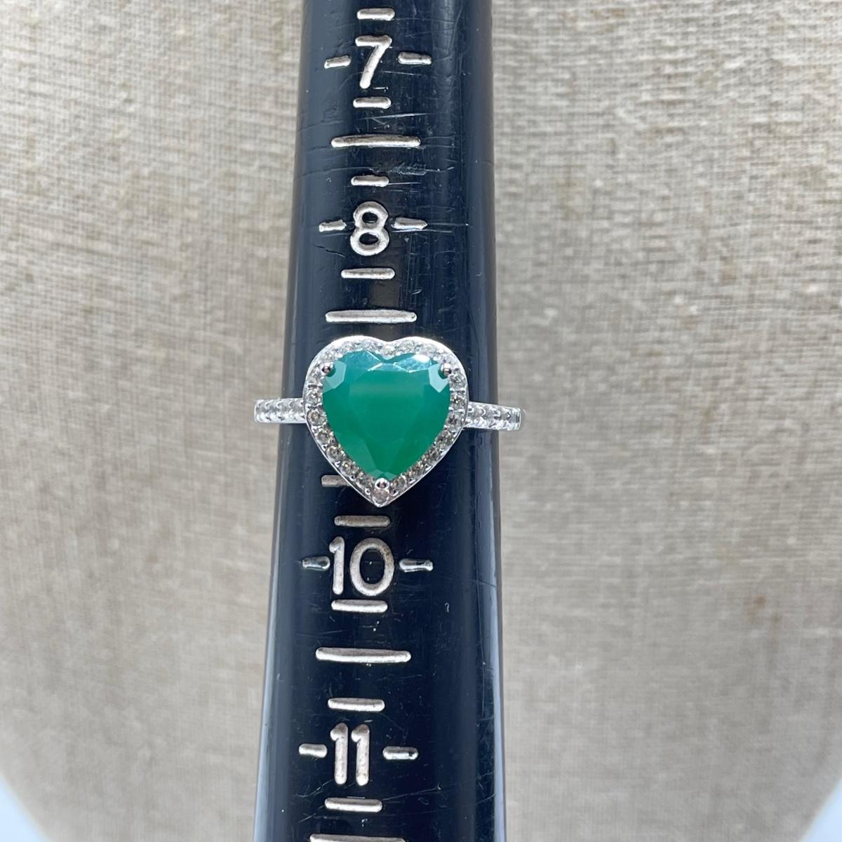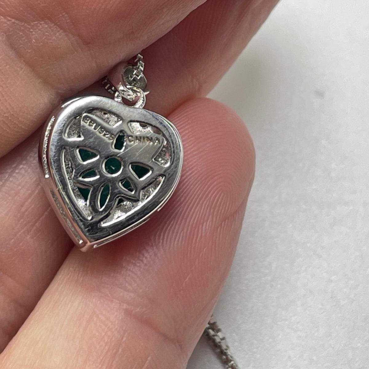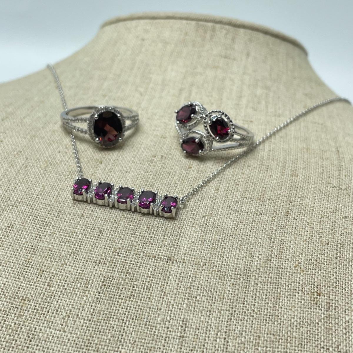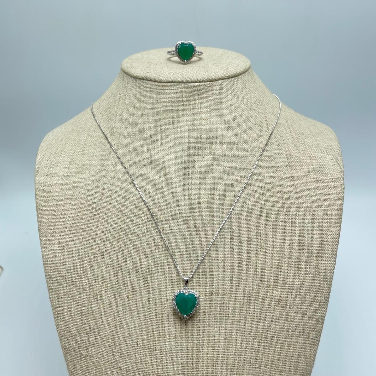 Lot holds a matching ring and necklace set, both marked 925 with heart shaped gems that look like green onyx. Also included are two rings and another necklace also marked 925. Note from the previous owner suggests the gems are red zircon and raspberry rhodolite. Please see photos for all markings found. We cannot guarantee the authenticity of the gemstones. All sales are final. No returns or refunds. Please bid accordingly.