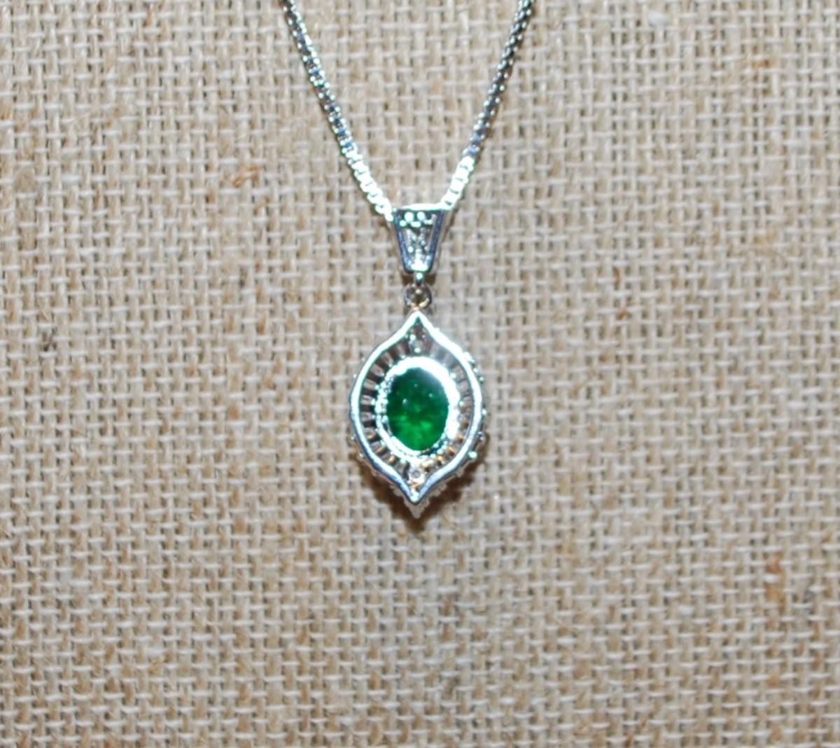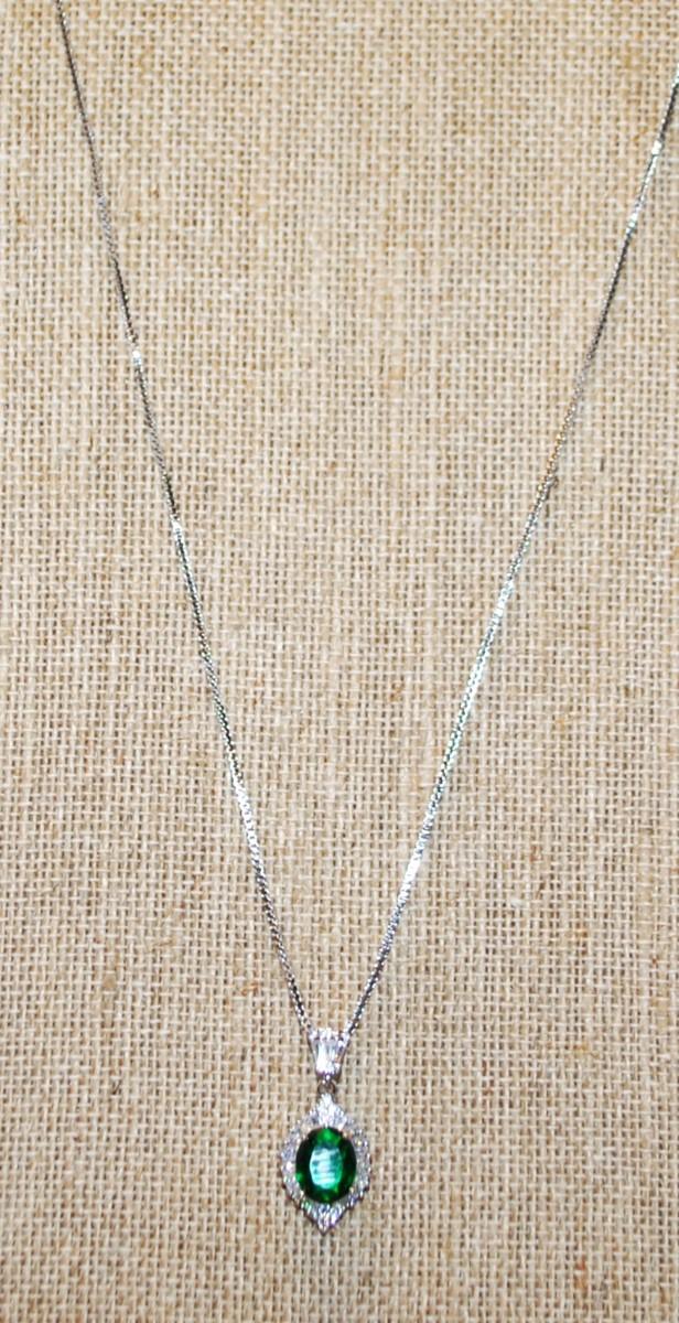 Green Oval Main Stone PENDANT (1" x ½") with Full Clear Stones Surround on a Silver Tone Necklace Chain 17" L