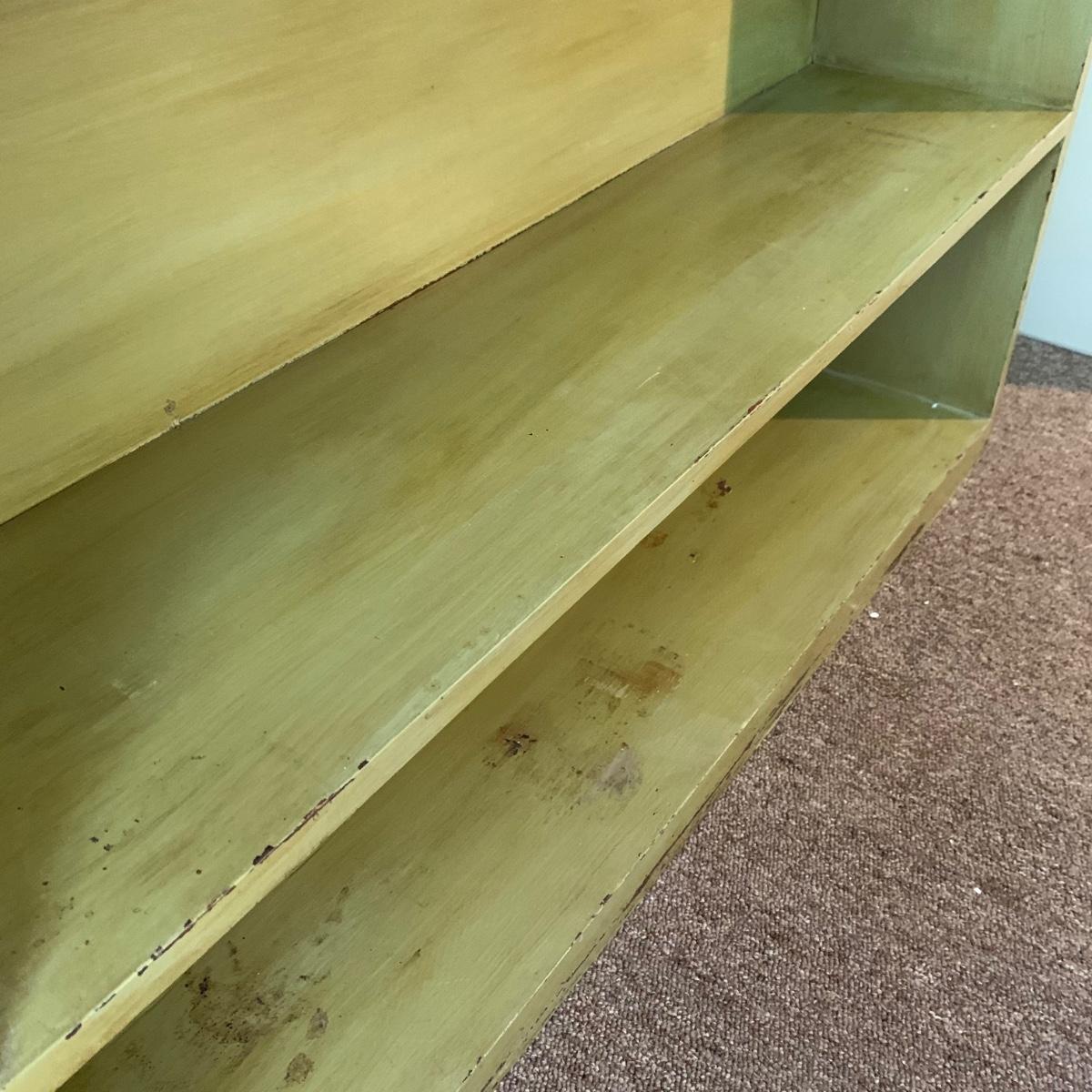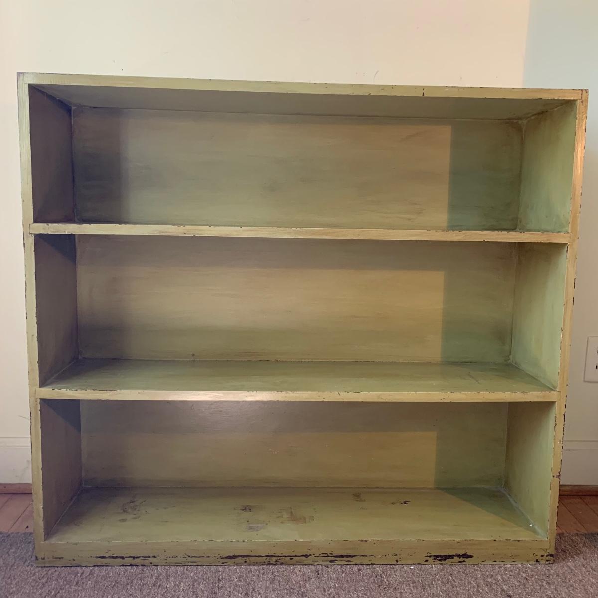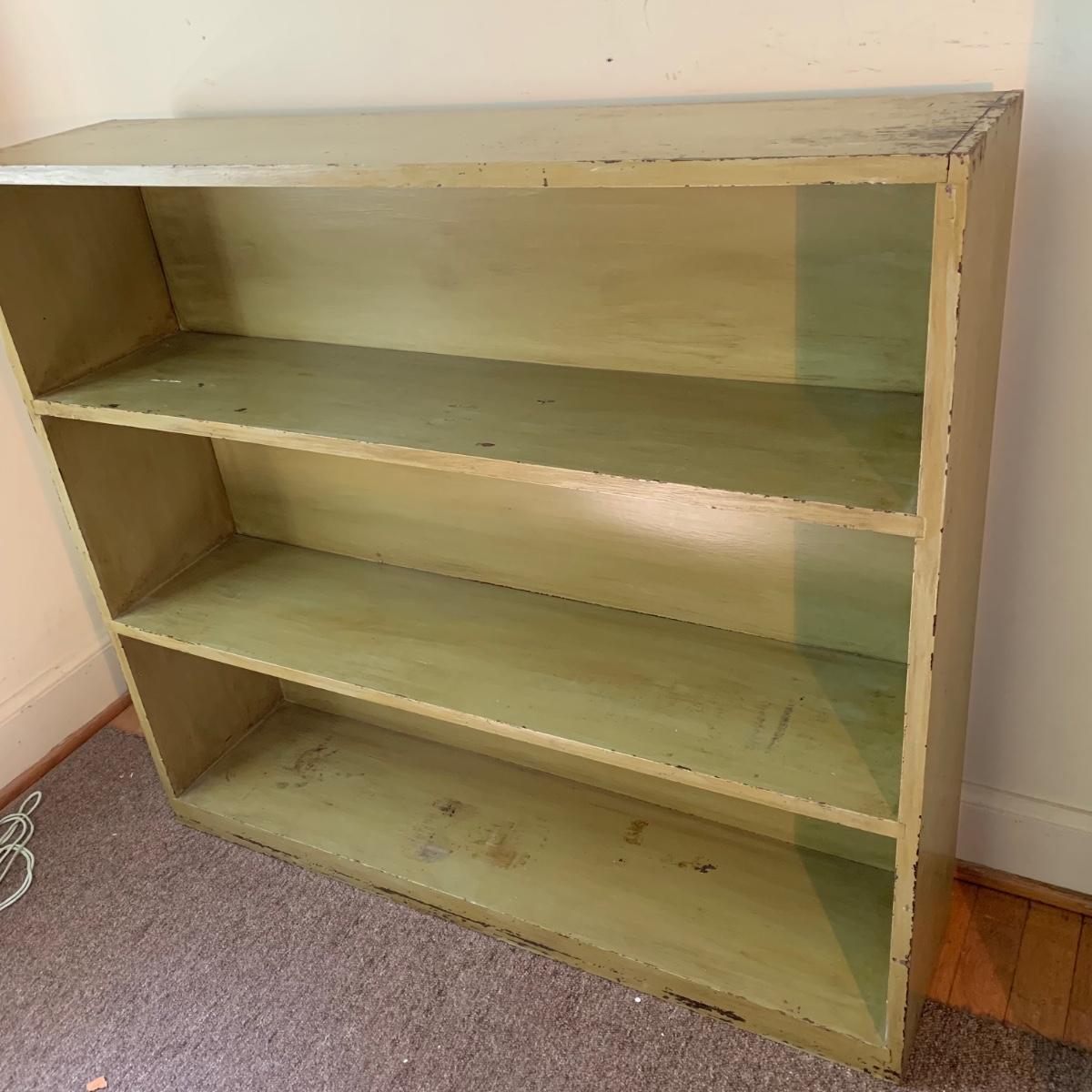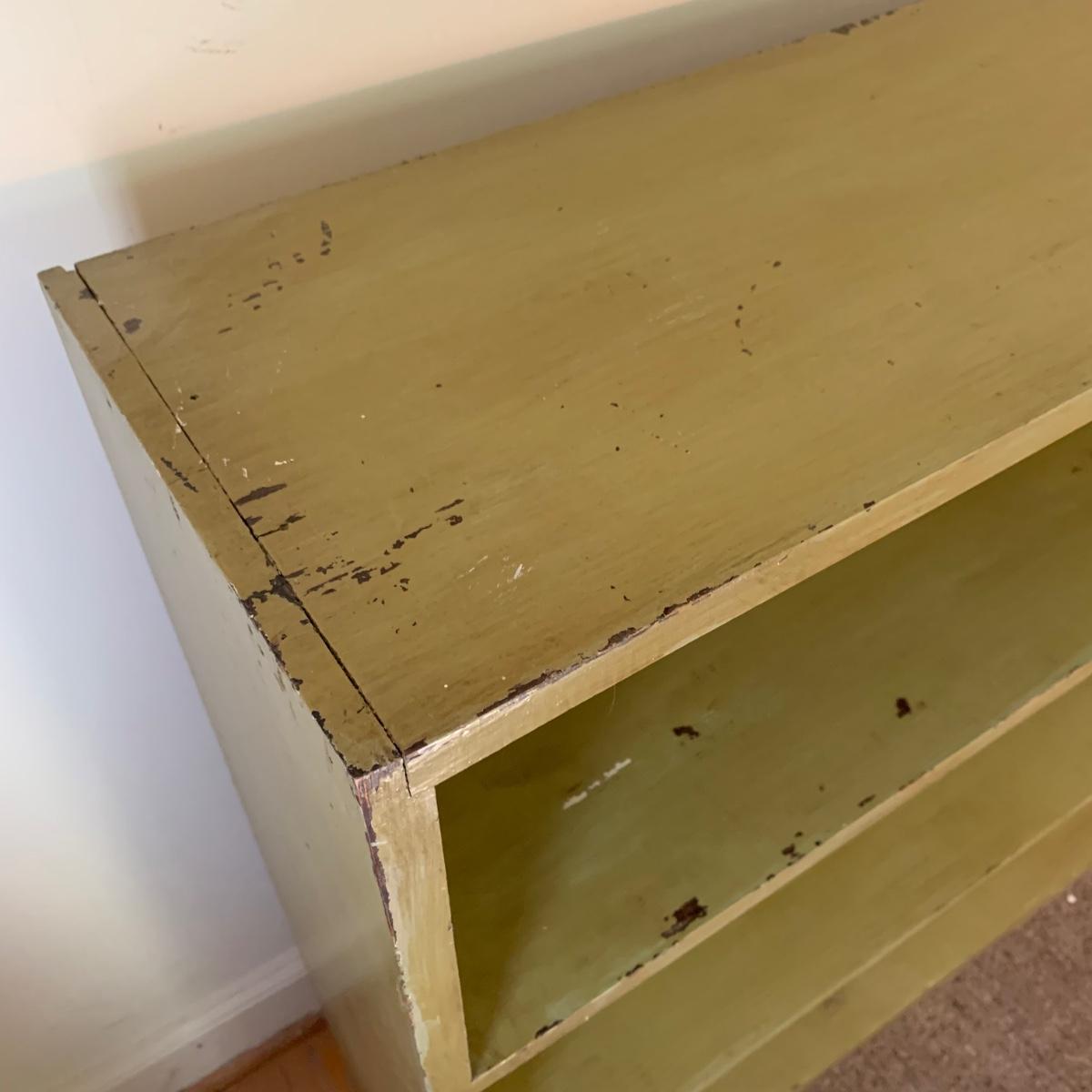 Bookshelf painted olive green. Shelves are made of solid wood with tempered wood backing. Shelf heights are not adjustable. The shelf is very sturdy, but the paint is quite worn. It measures 40.25”L x 9.5”W x 36”H. It is fairly lightweight, but note that it will need to be moved down a flight of stairs by the winning bidder. Local pickup only.