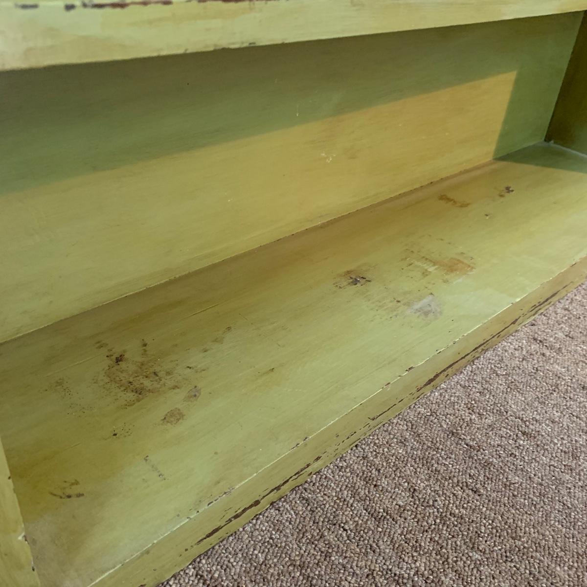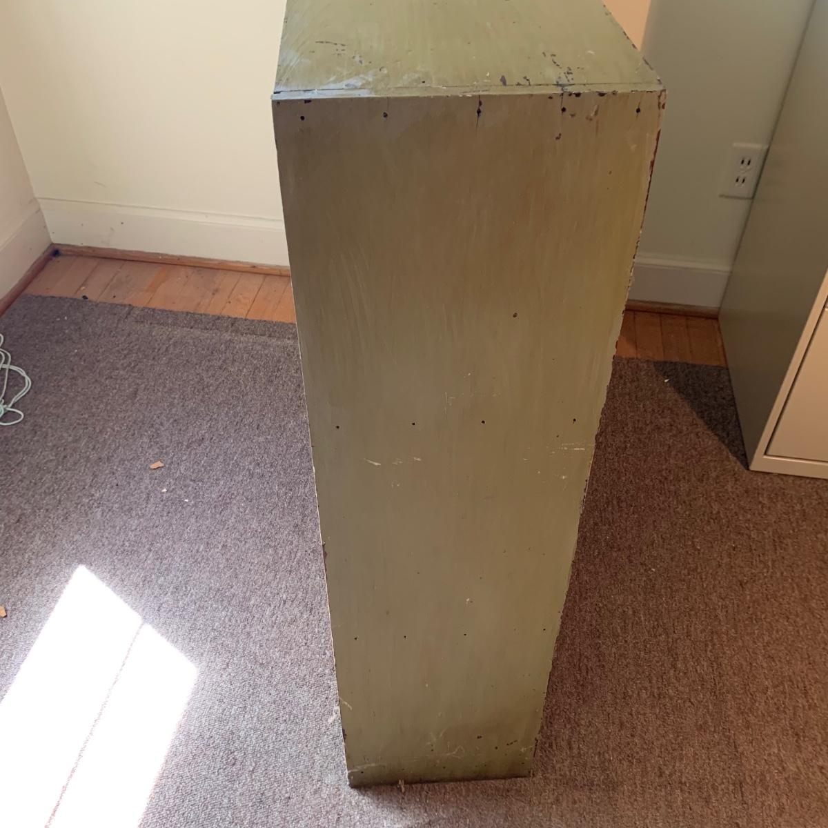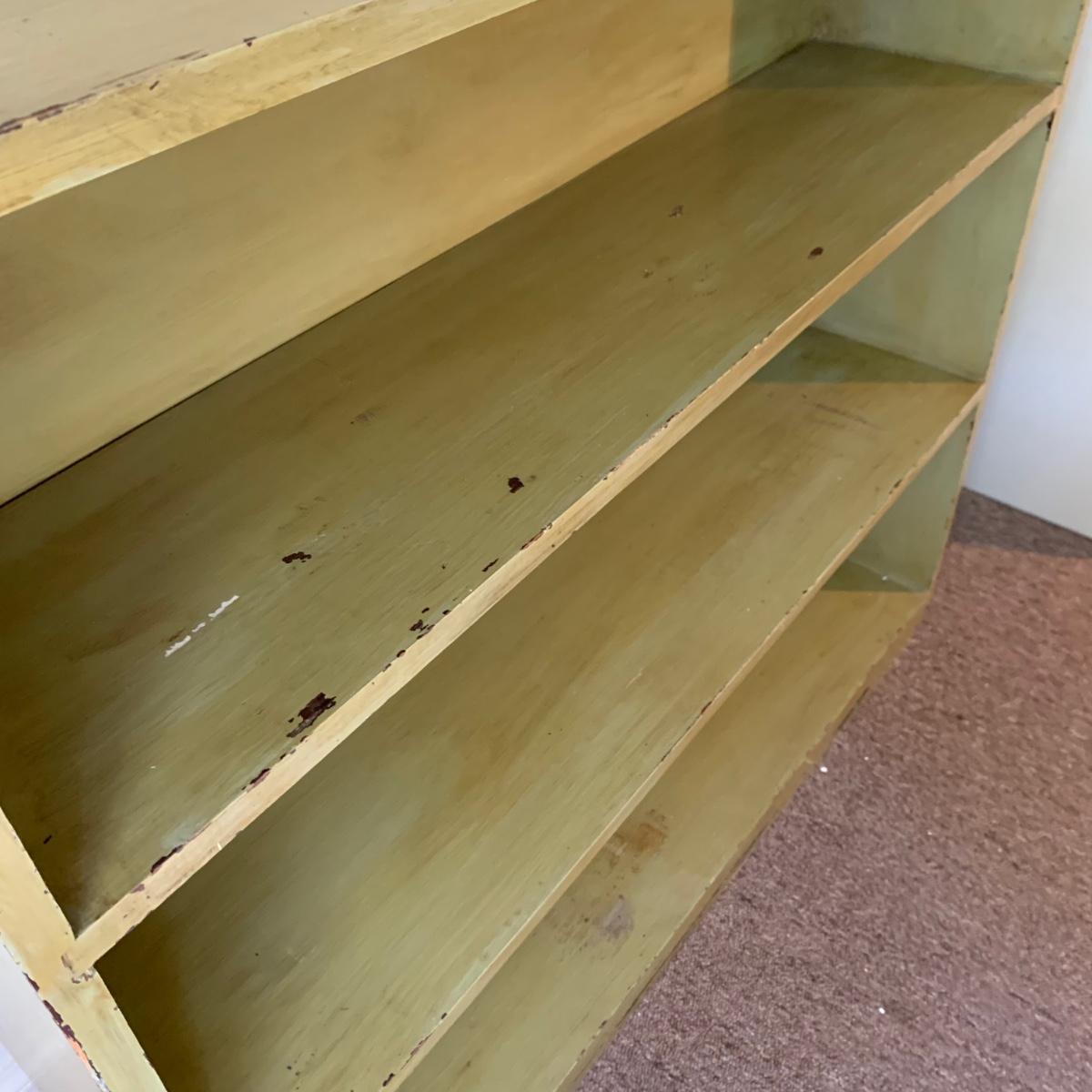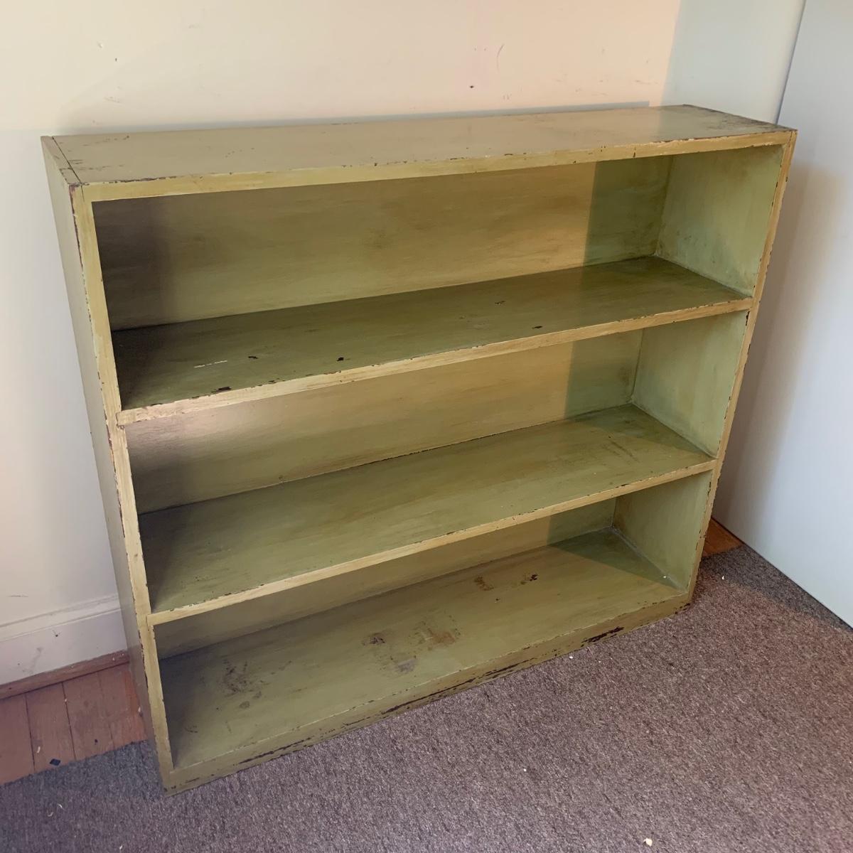 Bookshelf painted olive green. Shelves are made of solid wood with tempered wood backing. Shelf heights are not adjustable. The shelf is very sturdy, but the paint is quite worn. It measures 40.25”L x 9.5”W x 36”H. It is fairly lightweight, but note that it will need to be moved down a flight of stairs by the winning bidder. Local pickup only.