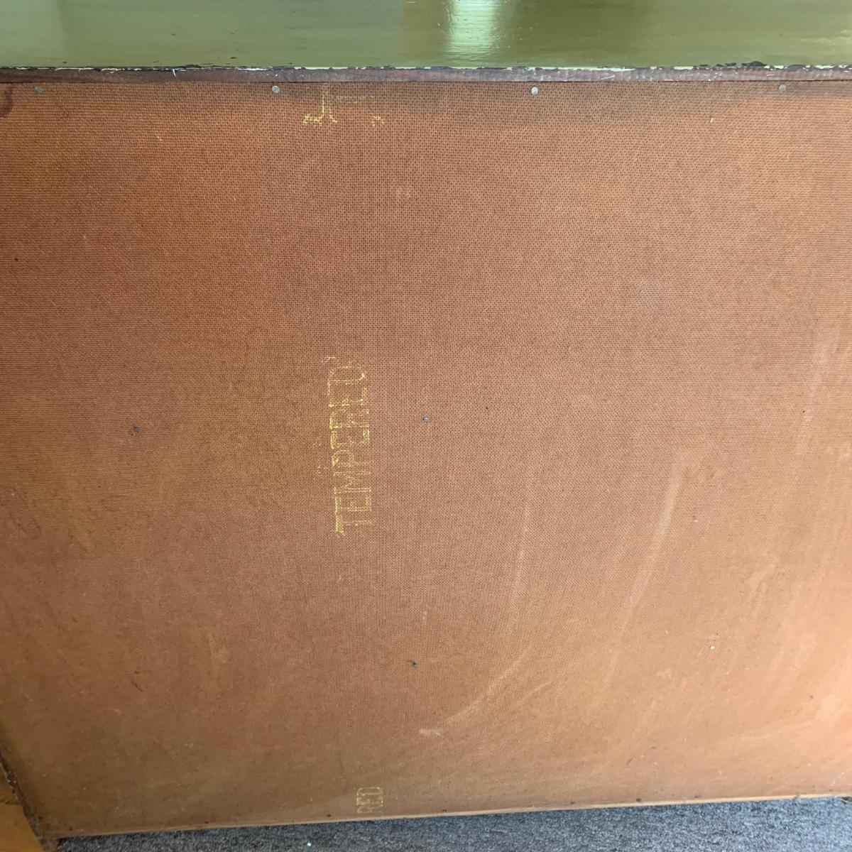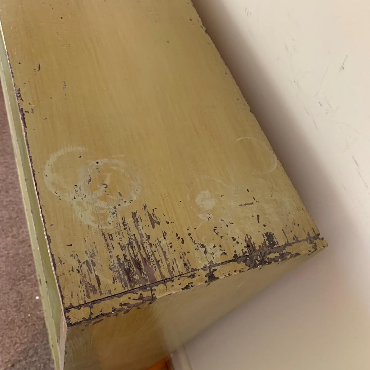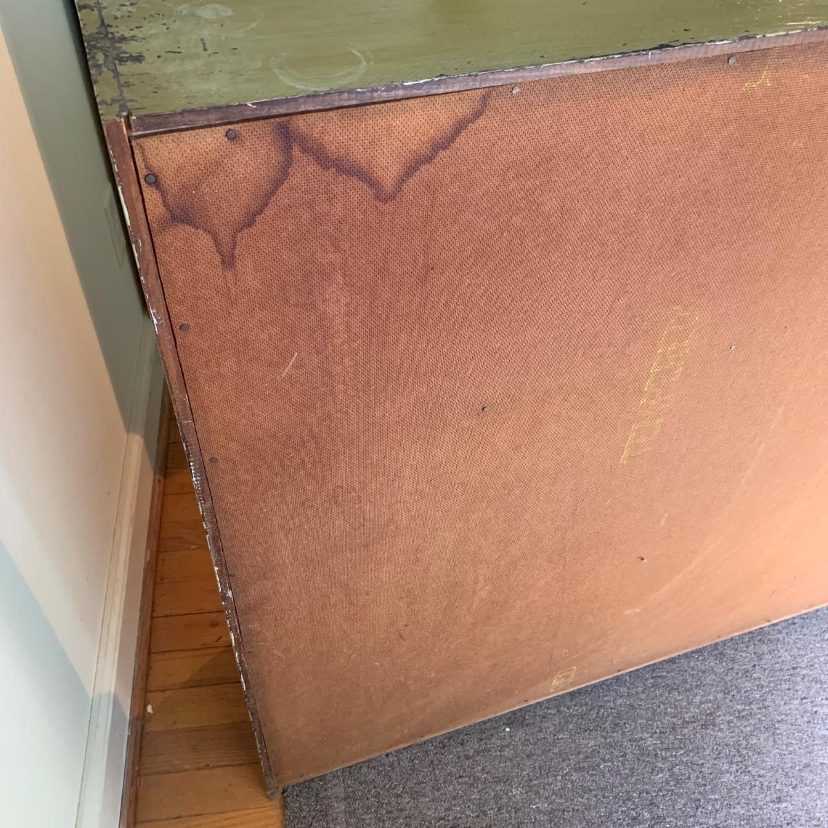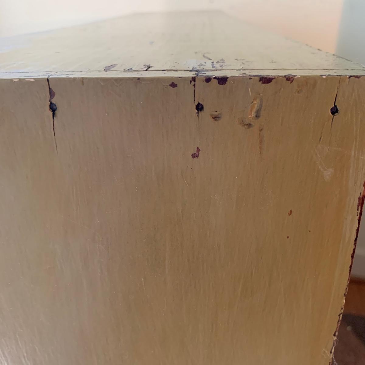 Bookshelf painted olive green. Shelves are made of solid wood with tempered wood backing. Shelf heights are not adjustable. The shelf is very sturdy, but the paint is quite worn. It measures 40.25”L x 9.5”W x 36”H. It is fairly lightweight, but note that it will need to be moved down a flight of stairs by the winning bidder. Local pickup only.