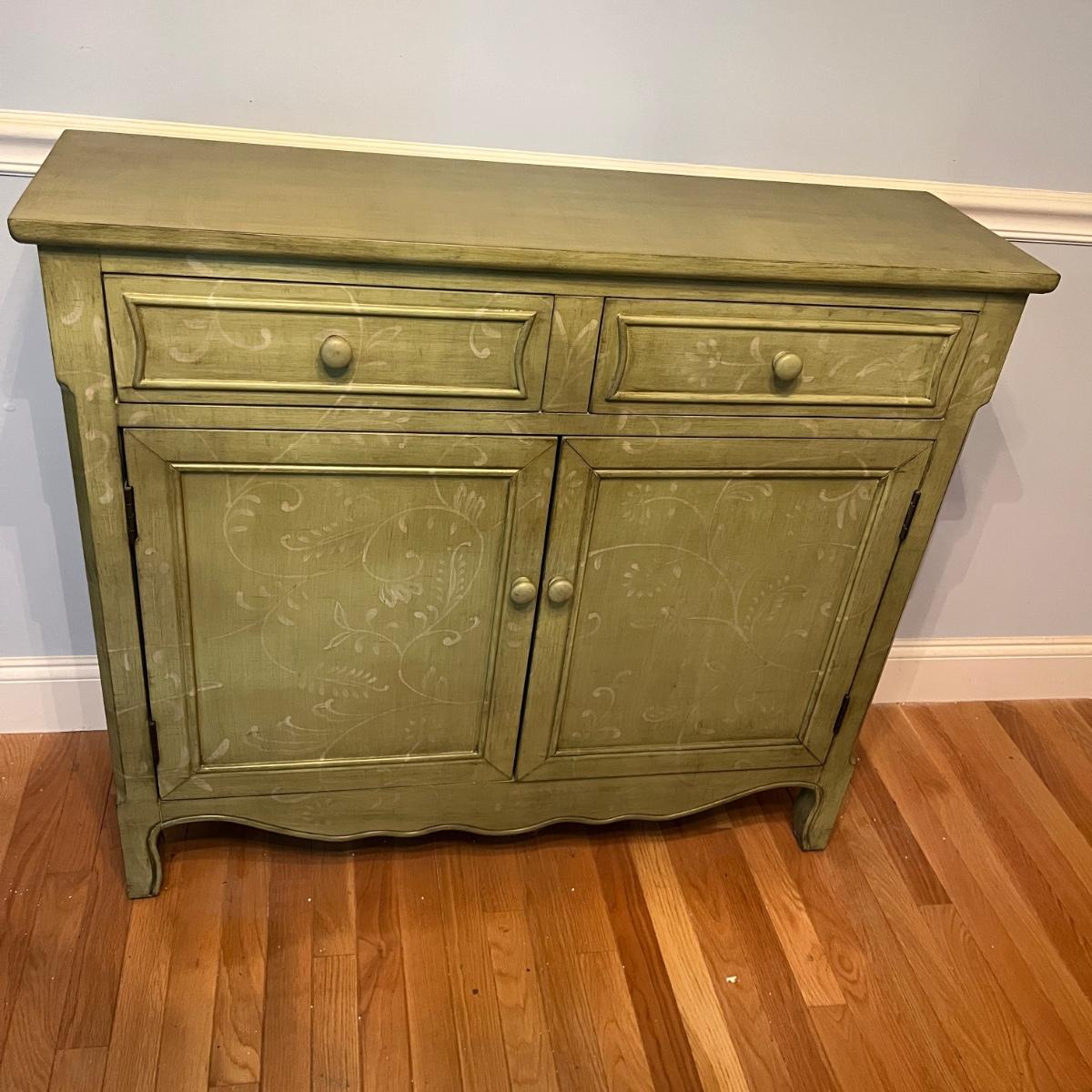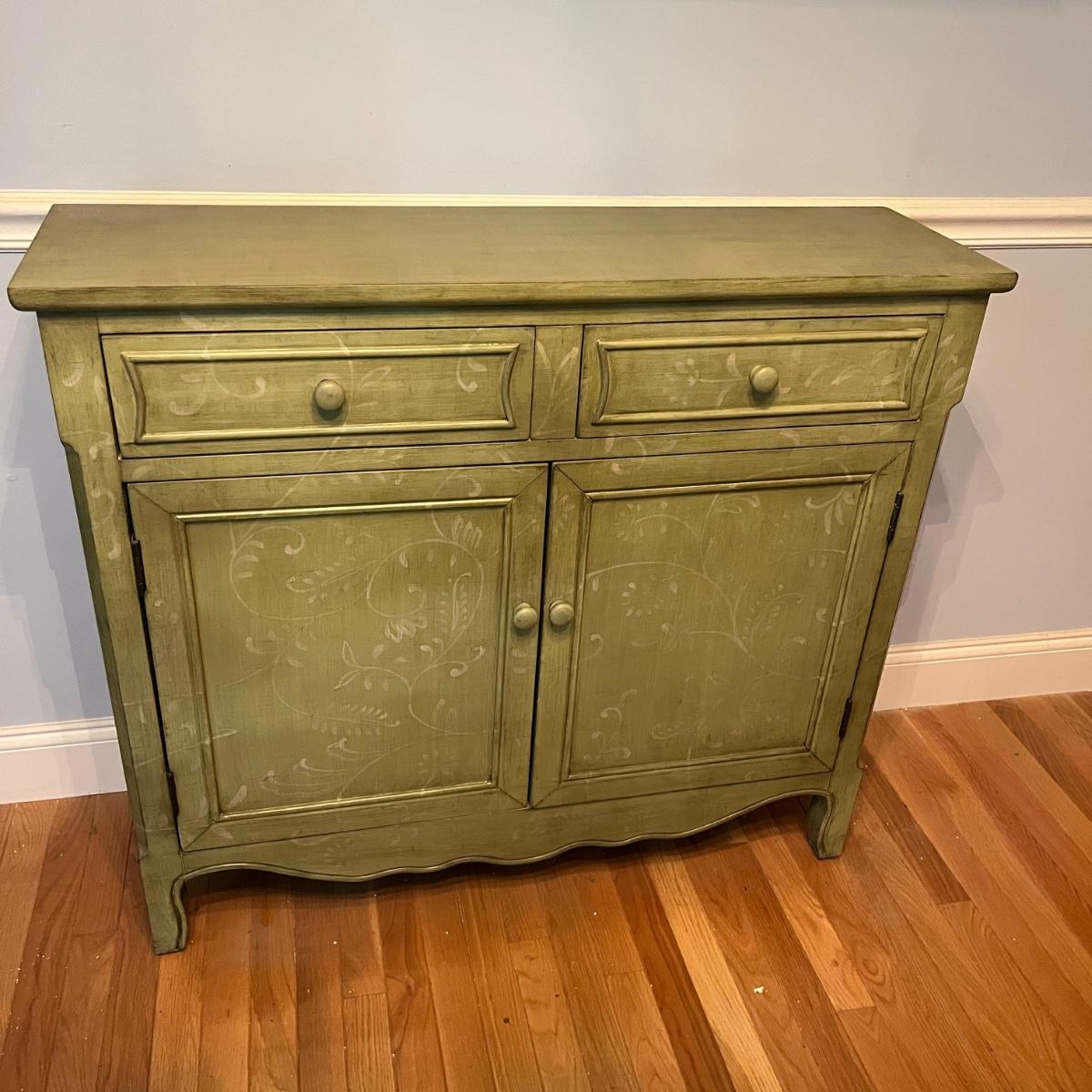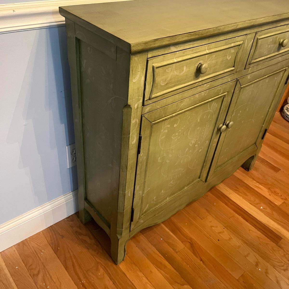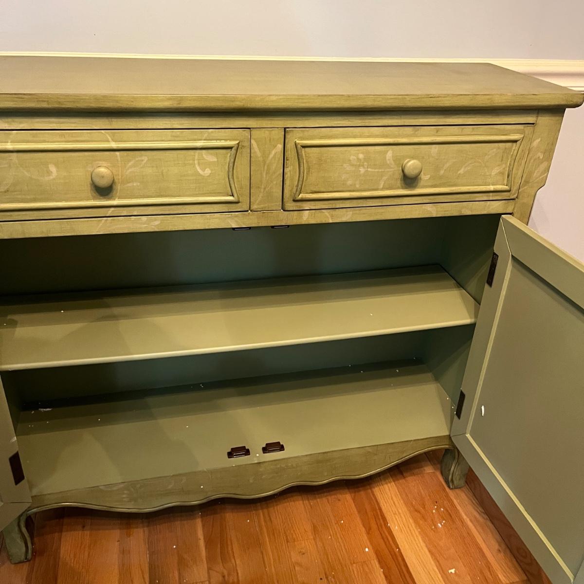 Lot includes a green painted buffet cabinet with two drawers and two doors with shelves underneath. There is what appears to be light stenciling on the piece, see pictures. Cabinet measures 40” x 12” x 36”H.