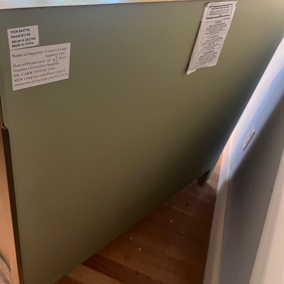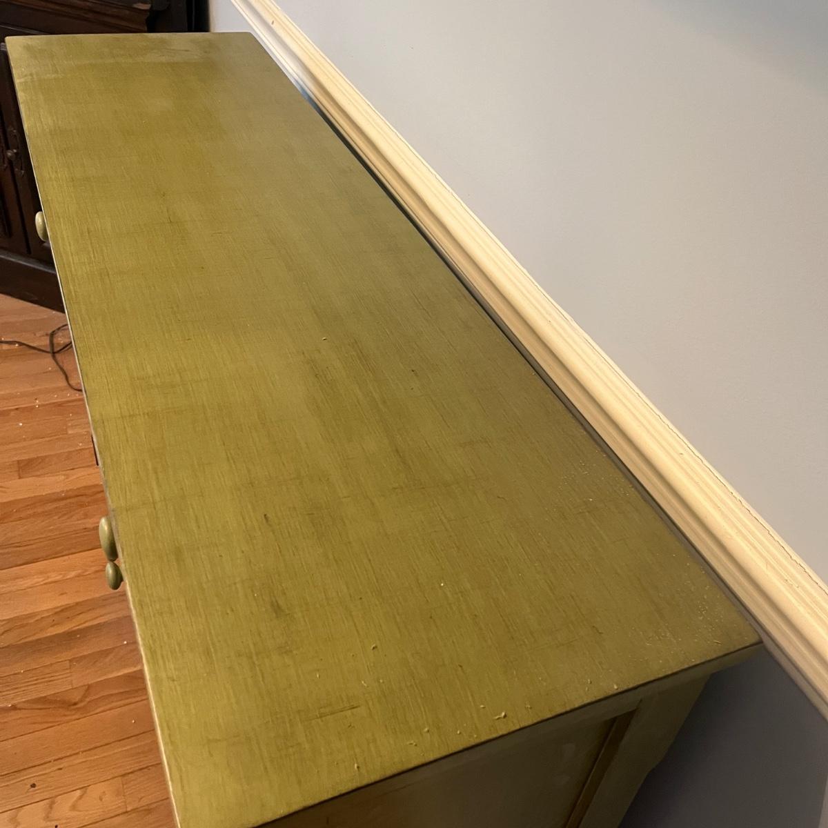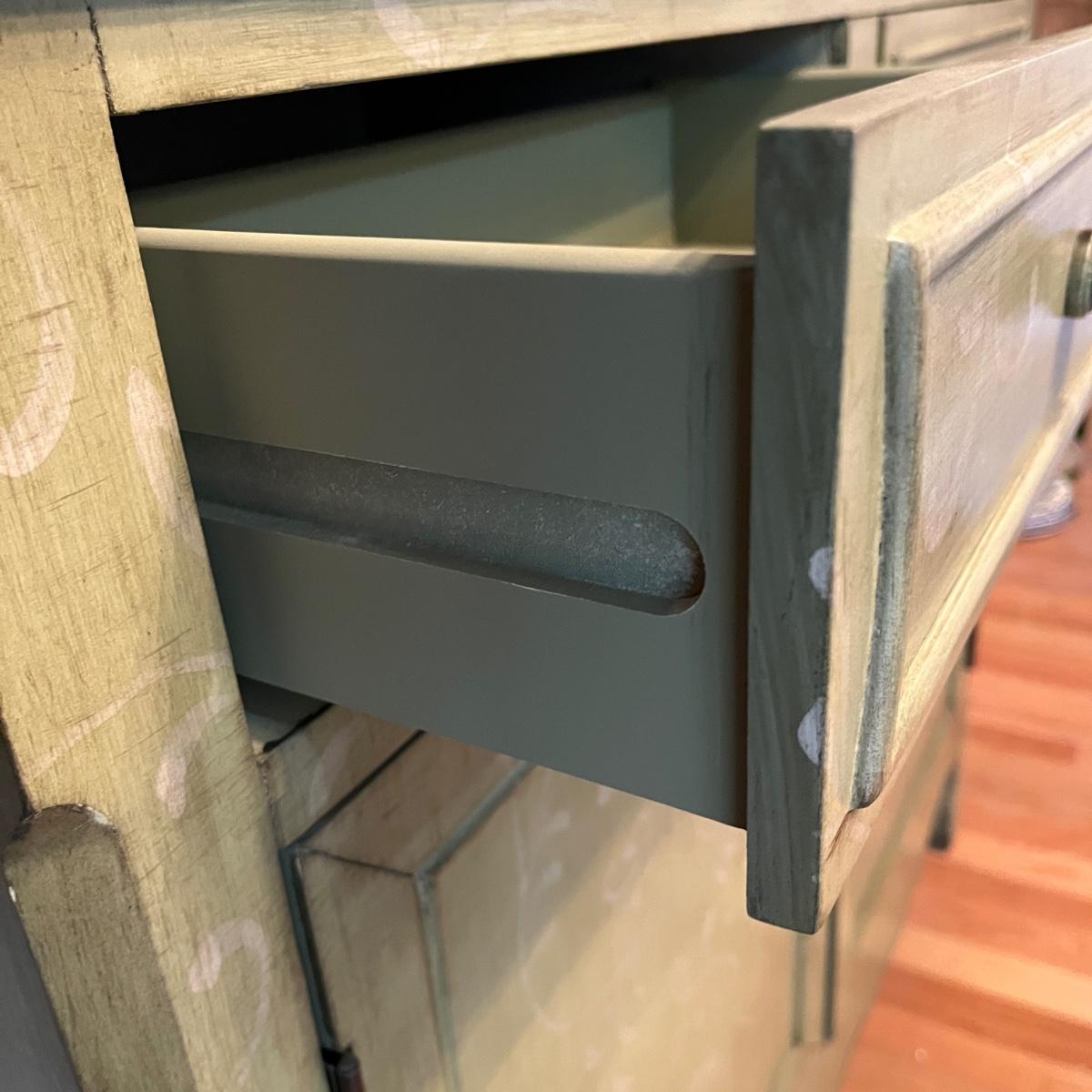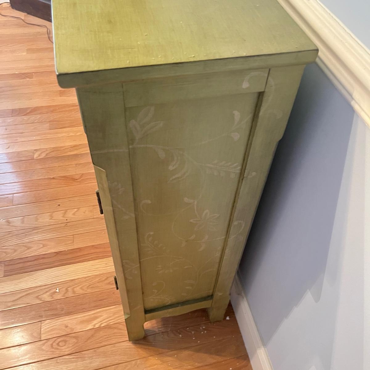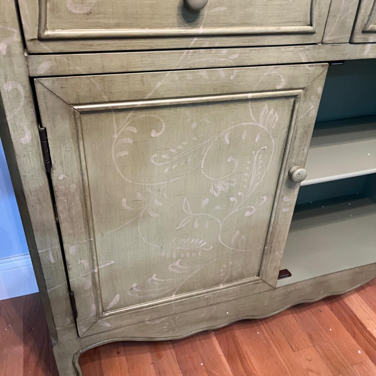 Lot includes a green painted buffet cabinet with two drawers and two doors with shelves underneath. There is what appears to be light stenciling on the piece, see pictures. Cabinet measures 40” x 12” x 36”H.