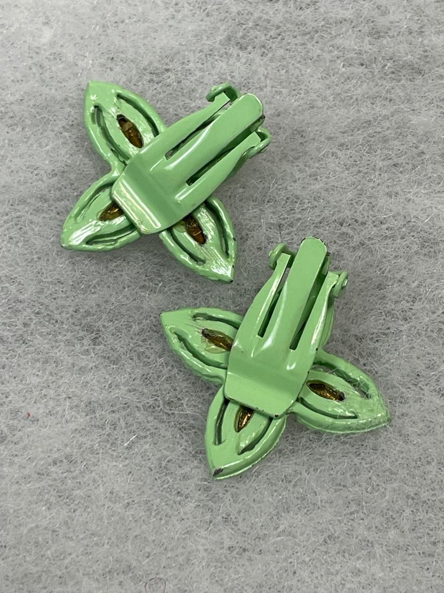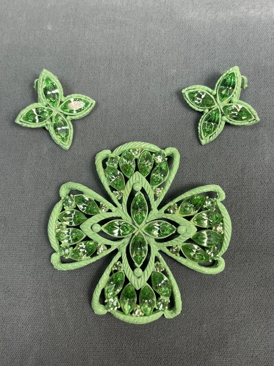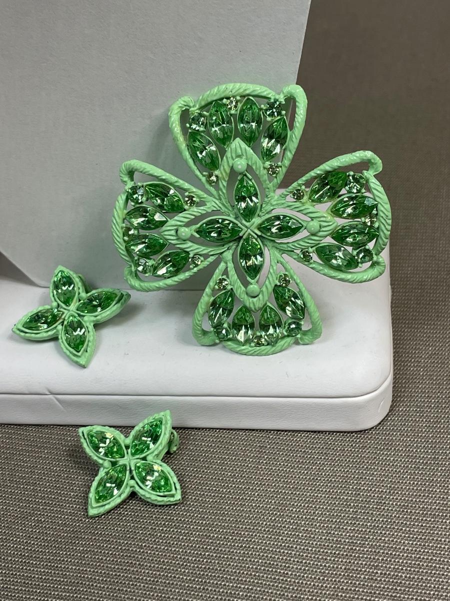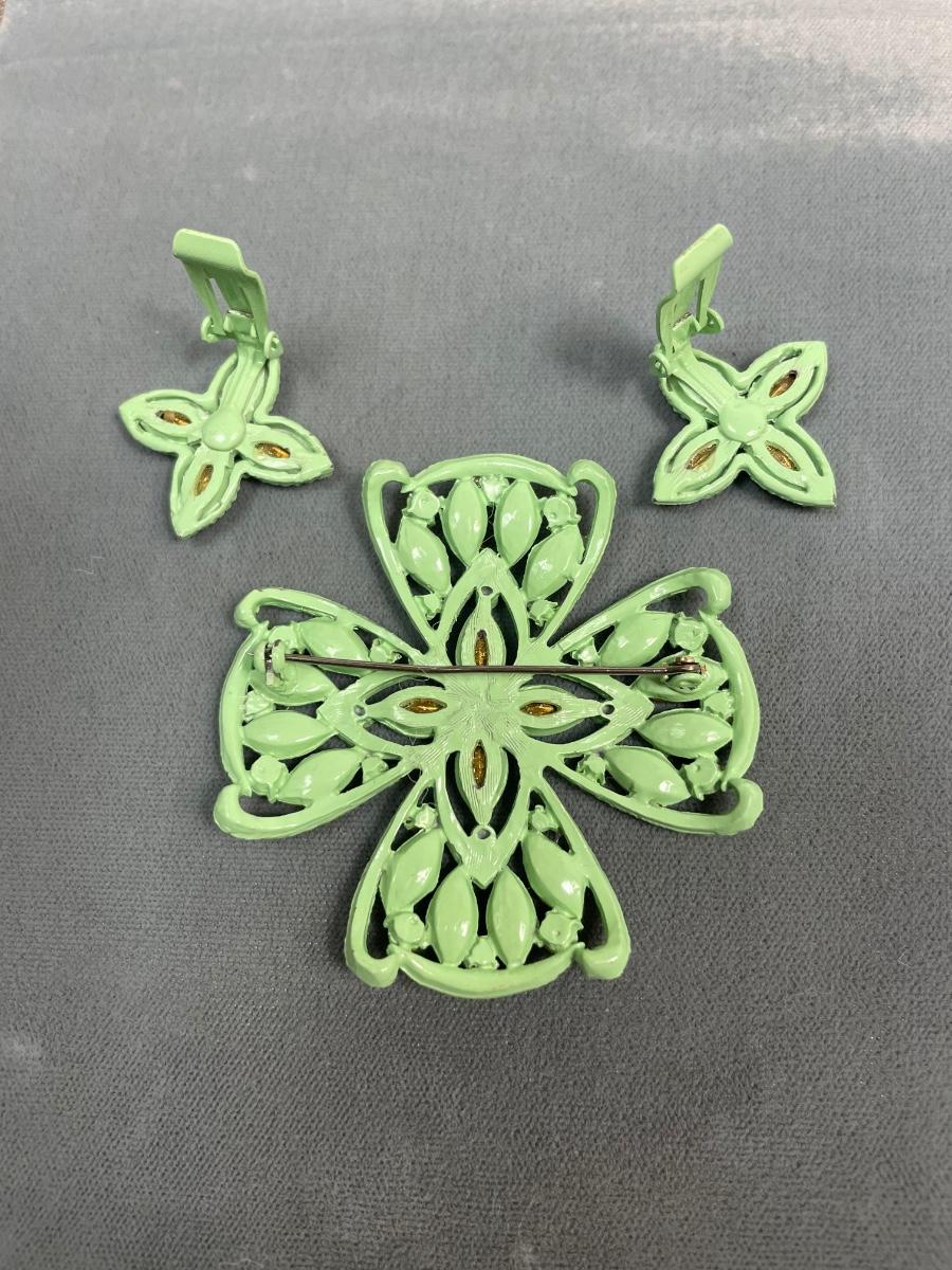 Green Painted metal rhinestone pin and earrings set