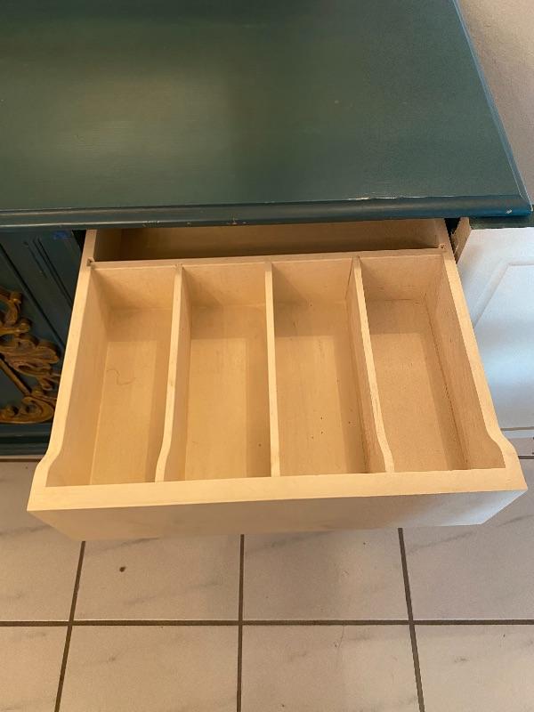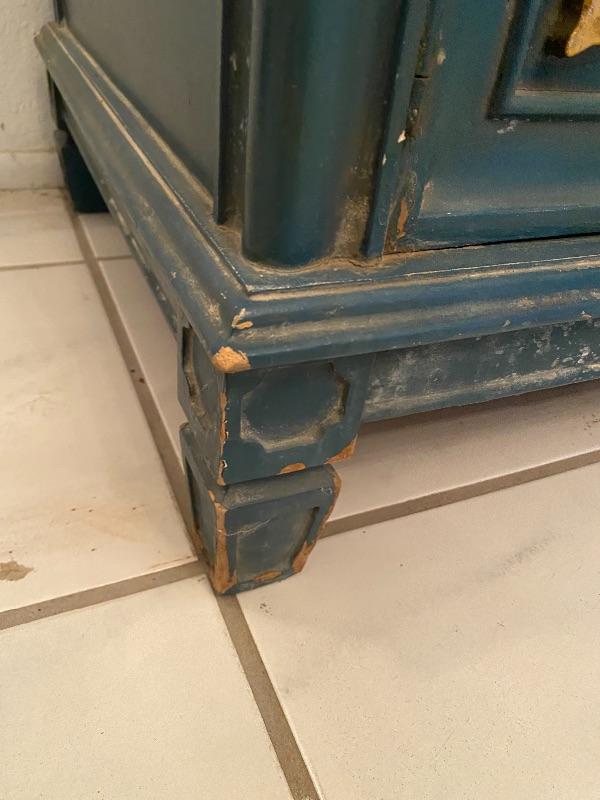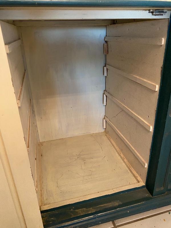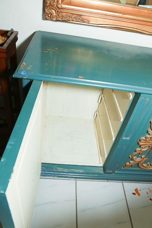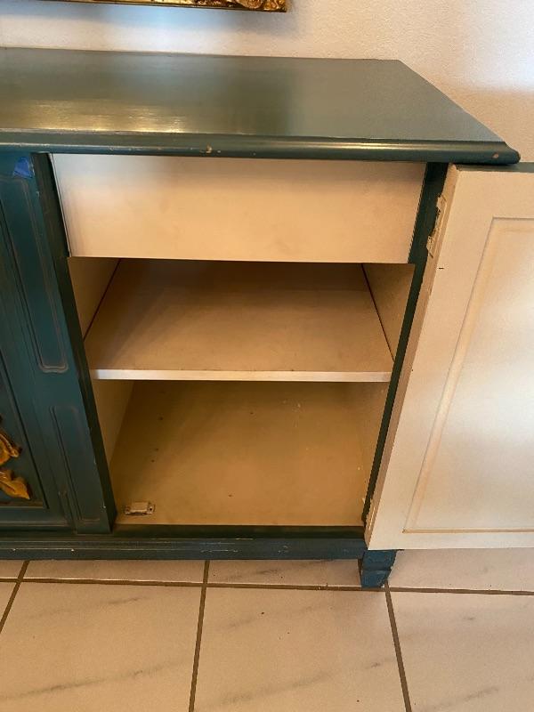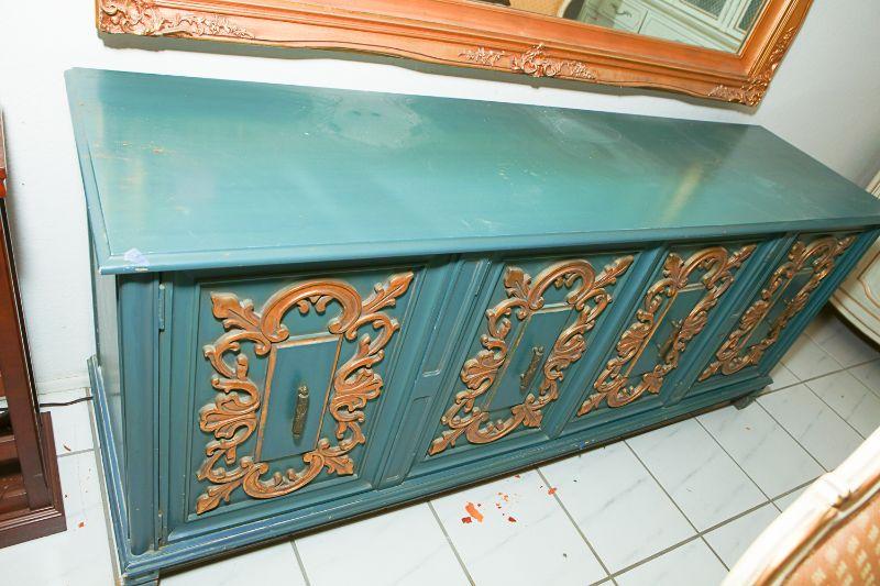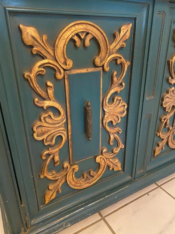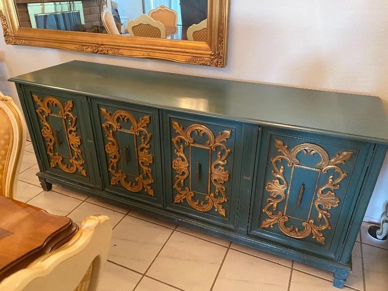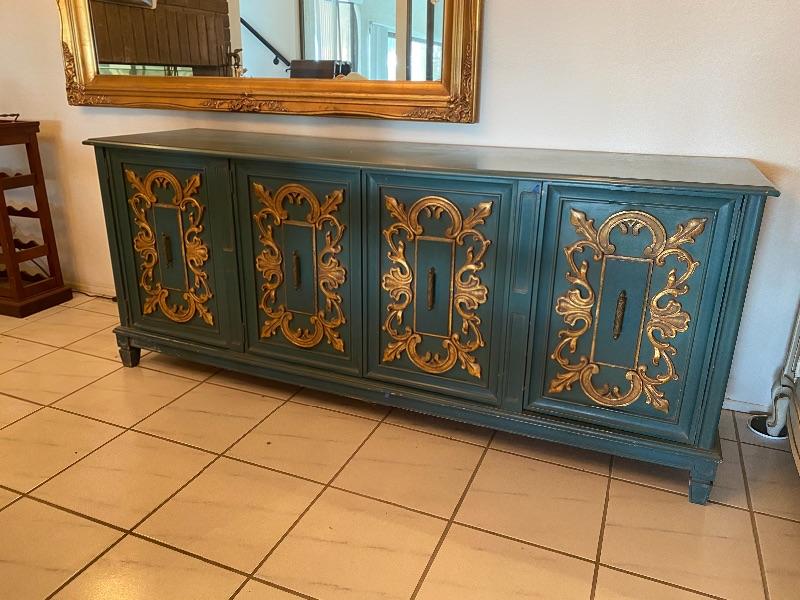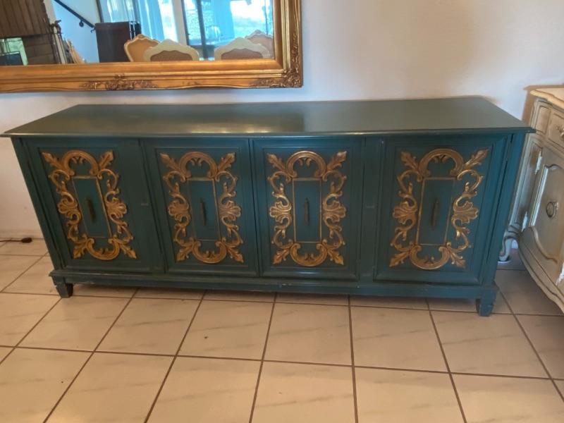 Vintage wood sideboard buffet. Painted a wonderful teal green and gold. Four cabinet doors with shelves on one side. Measures about 77"l x 32"h x 21"d. Does have a scuff in the edge but in otherwise good condition.