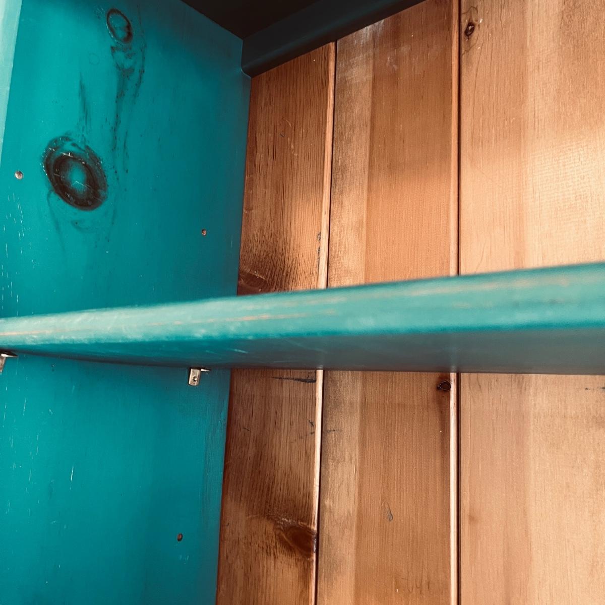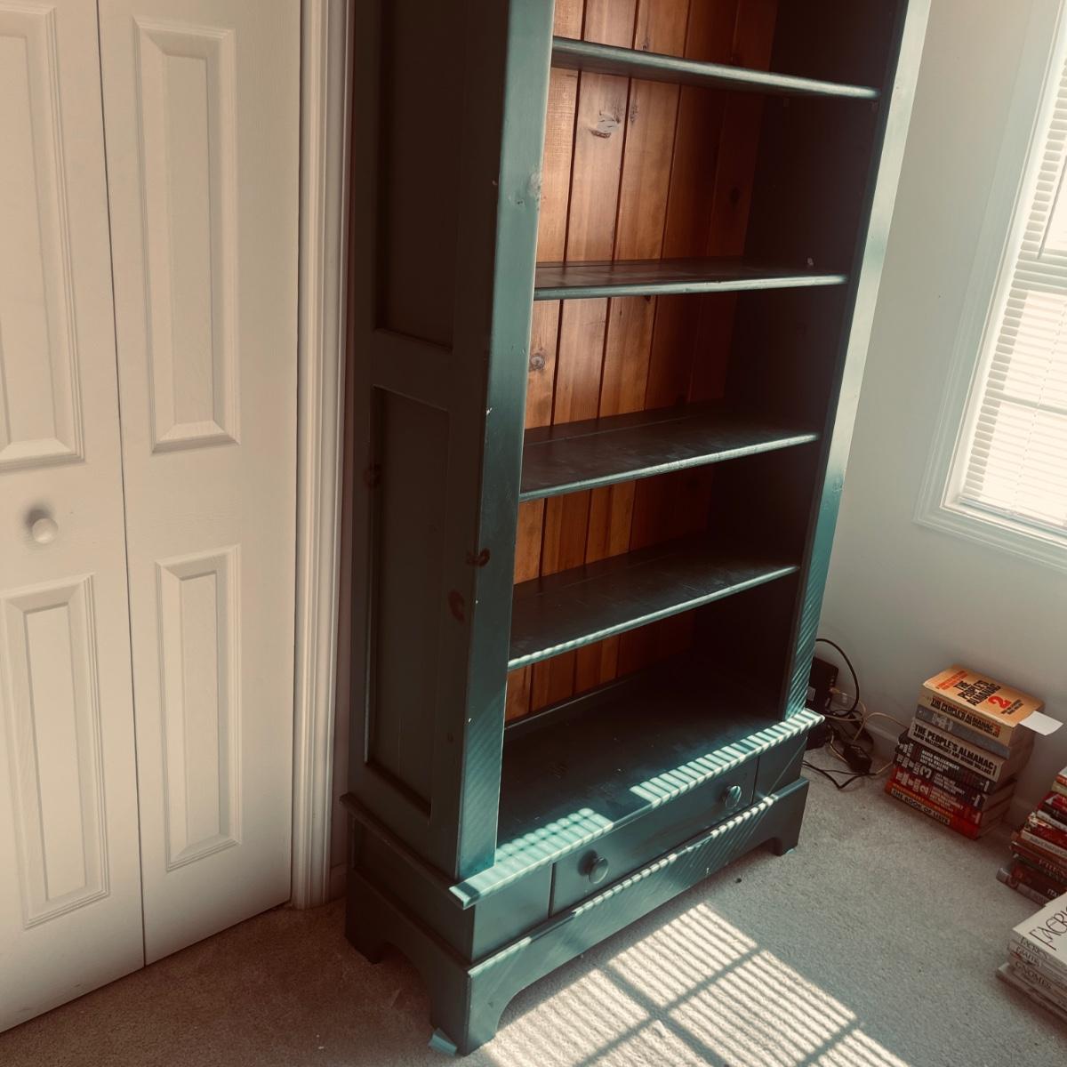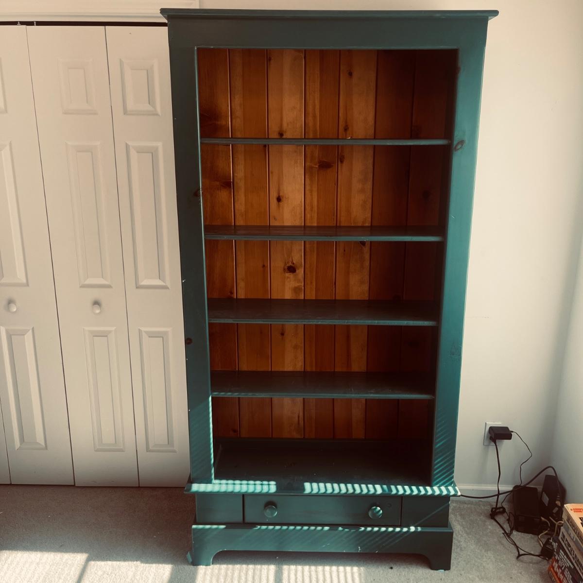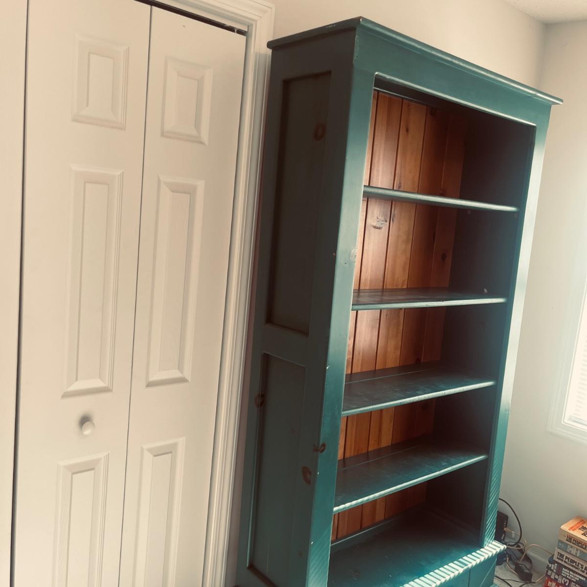Lot includes teal painted bookcase with a natural colored back and four adjustable shelves. Bookcase measures 41” x 14” x 78”H. Bookcase has scratches and resin from the knots has bled through the paint, see pictures. Item is up one flight of stairs.
