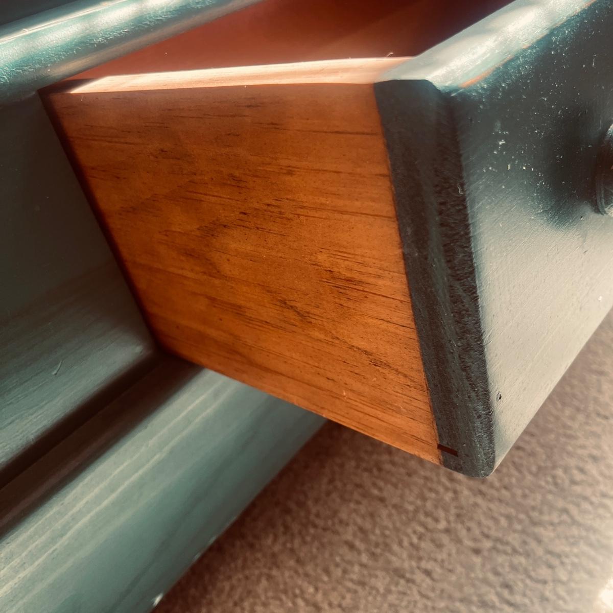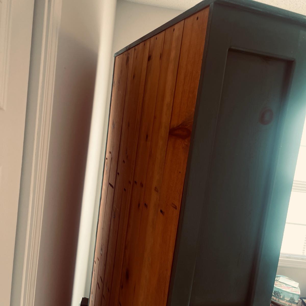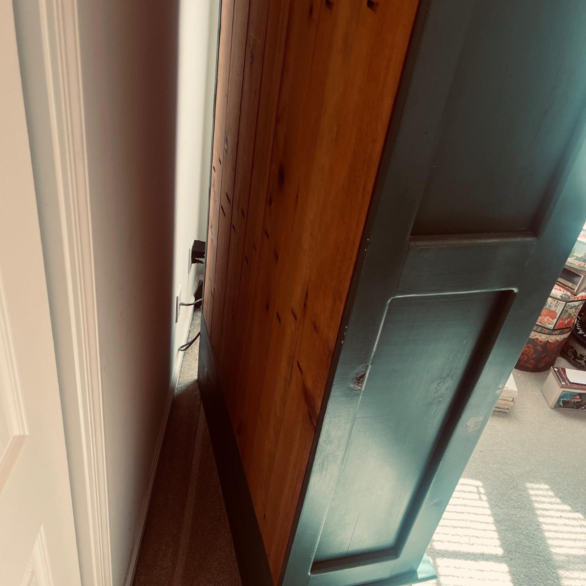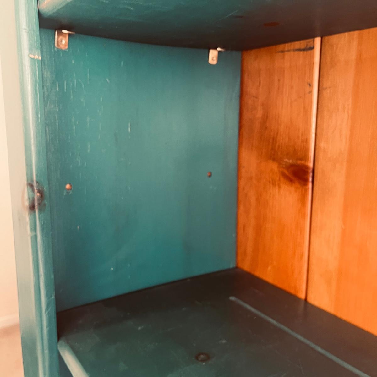 Lot includes teal painted bookcase with a natural colored back and four adjustable shelves. Bookcase measures 41” x 14” x 78”H. Bookcase has scratches and resin from the knots has bled through the paint, see pictures. Item is up one flight of stairs.