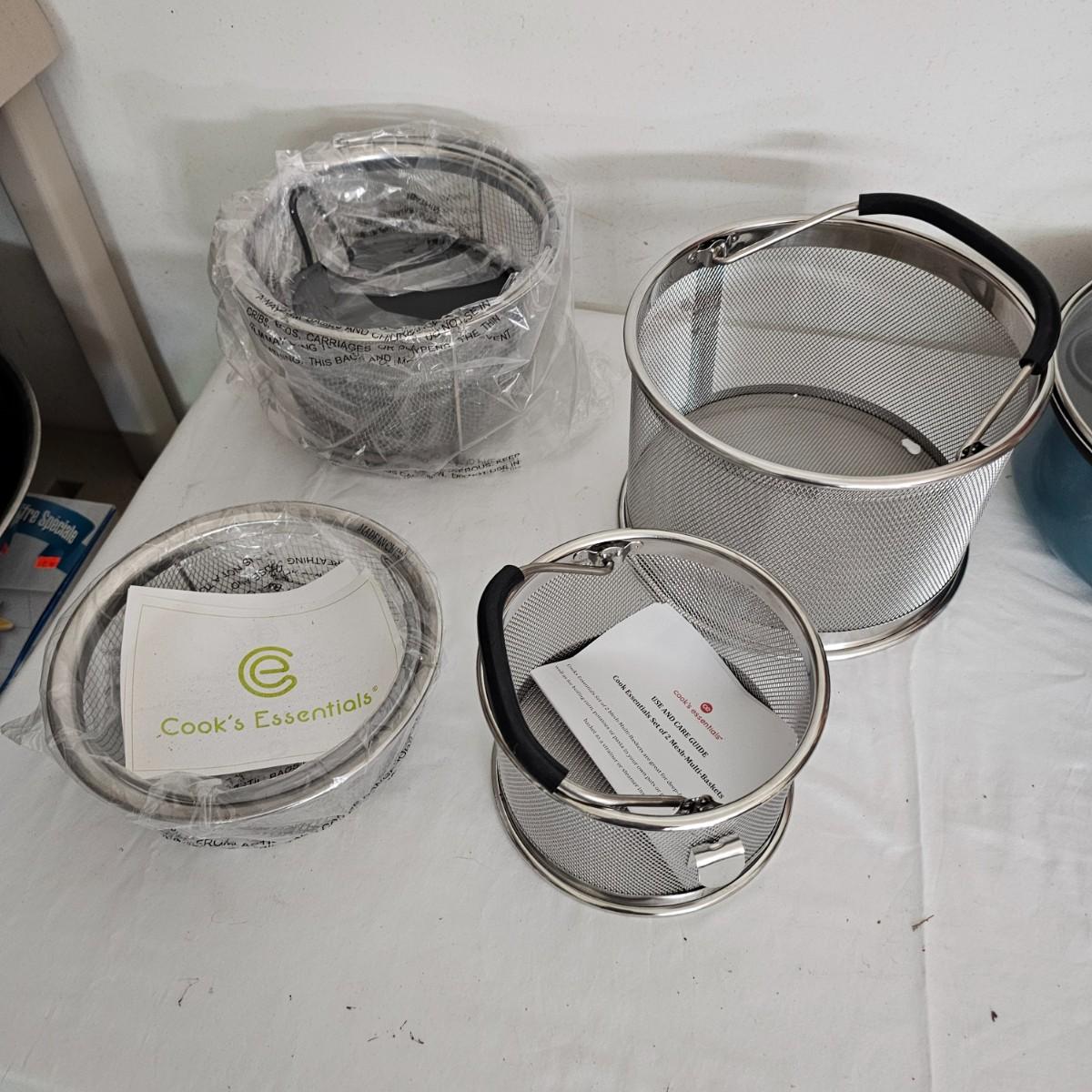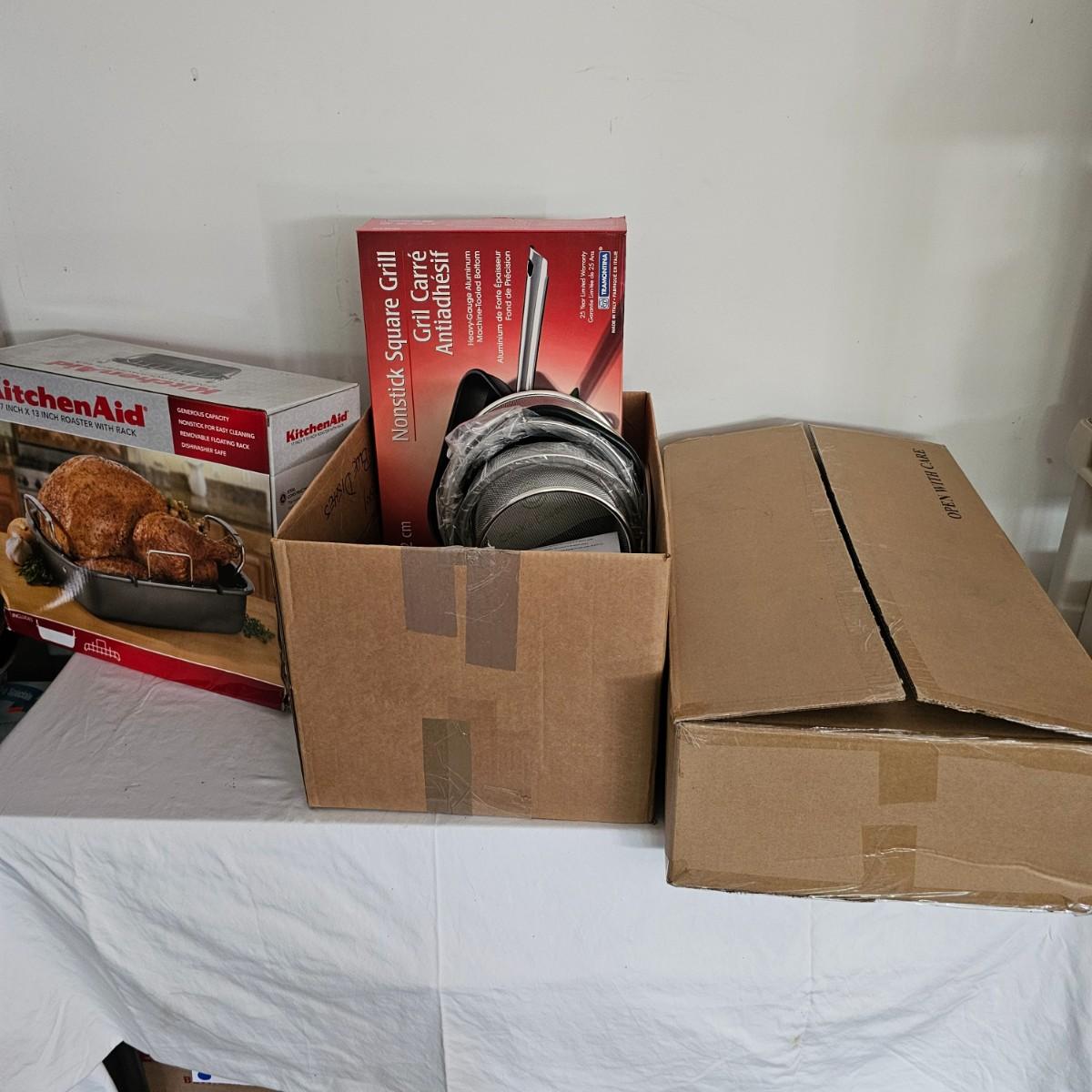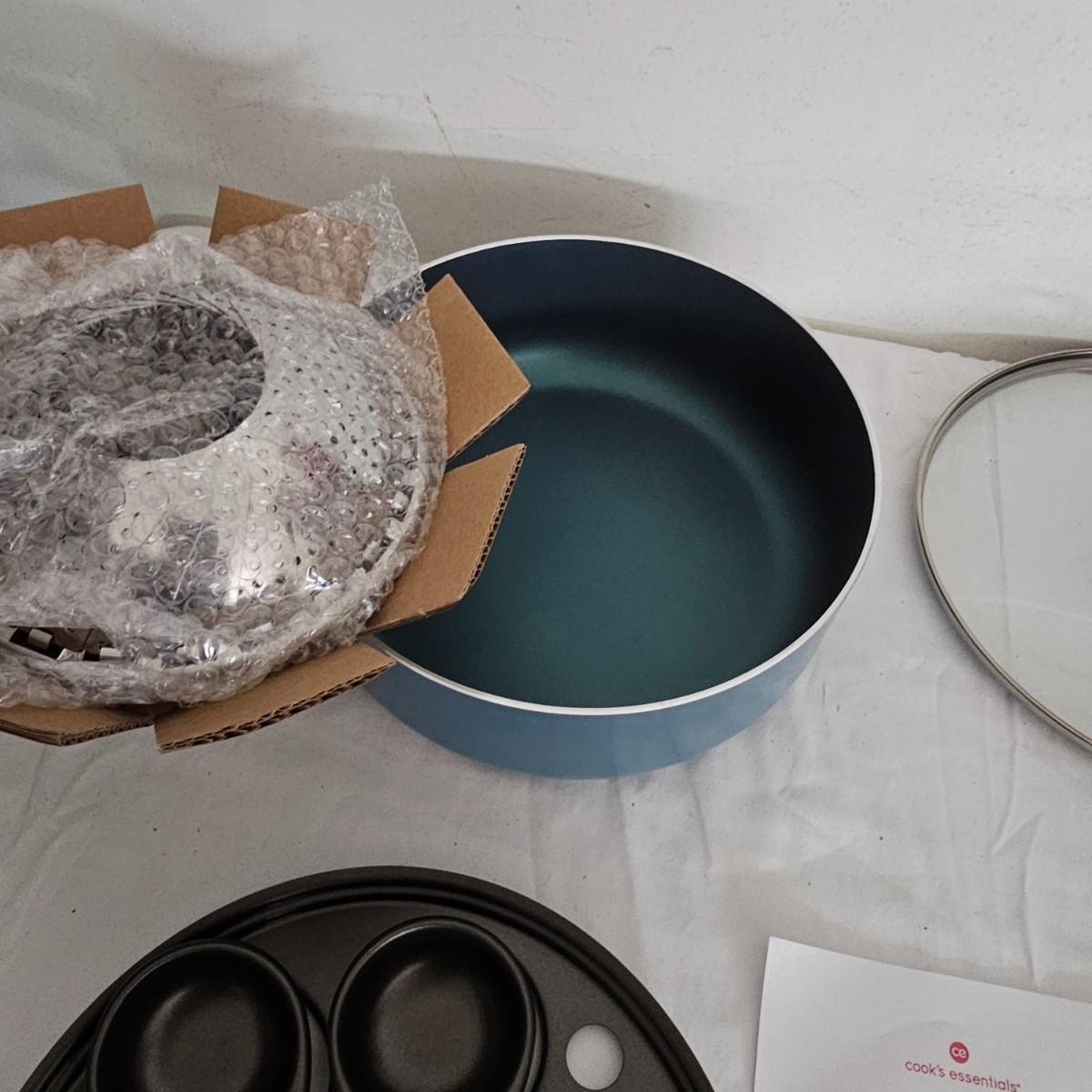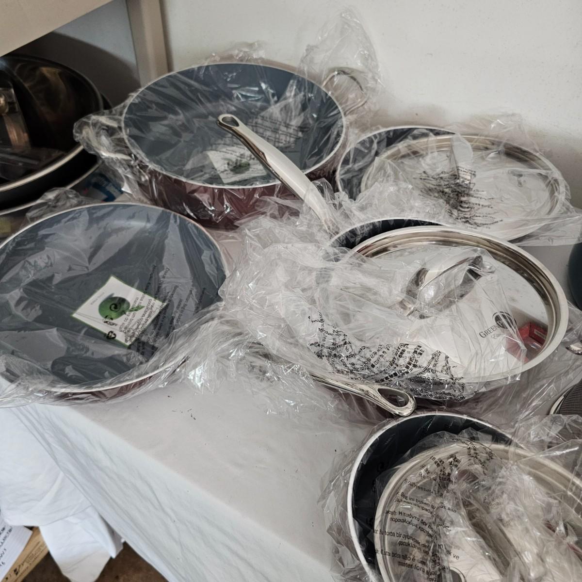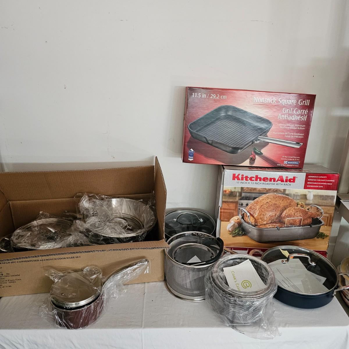 Name brand items of non-stick cooking surfaces. Set of six Green Pan skillets, fryers, pots and lids. 10", 10.5" and 12"D skillets and 6" and 8"D pots. A set of four Cooks Essentials strainer baskets, largest is 9"D. Also a 10" and 10.5"D fry pan, one with an egg cooking top and a vegetable steamer basket. One Tramontina 11.5"SQ grill and a Kitchen Aid 17" x 13" roaster with rack. All items appear to be new in box. See photos for details. Local pickup only.