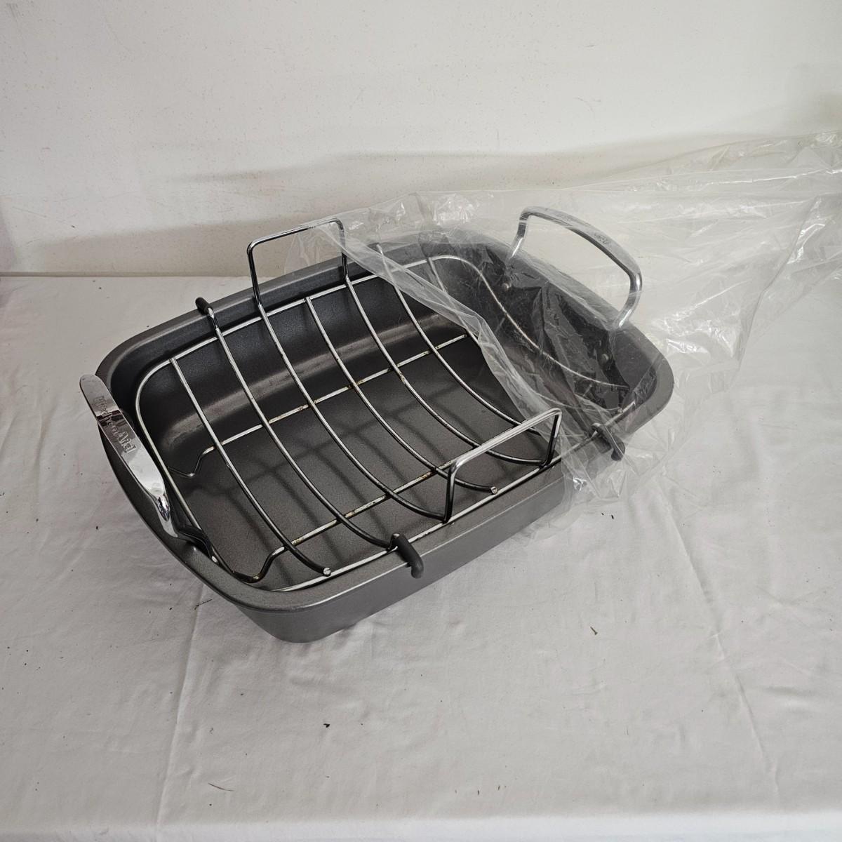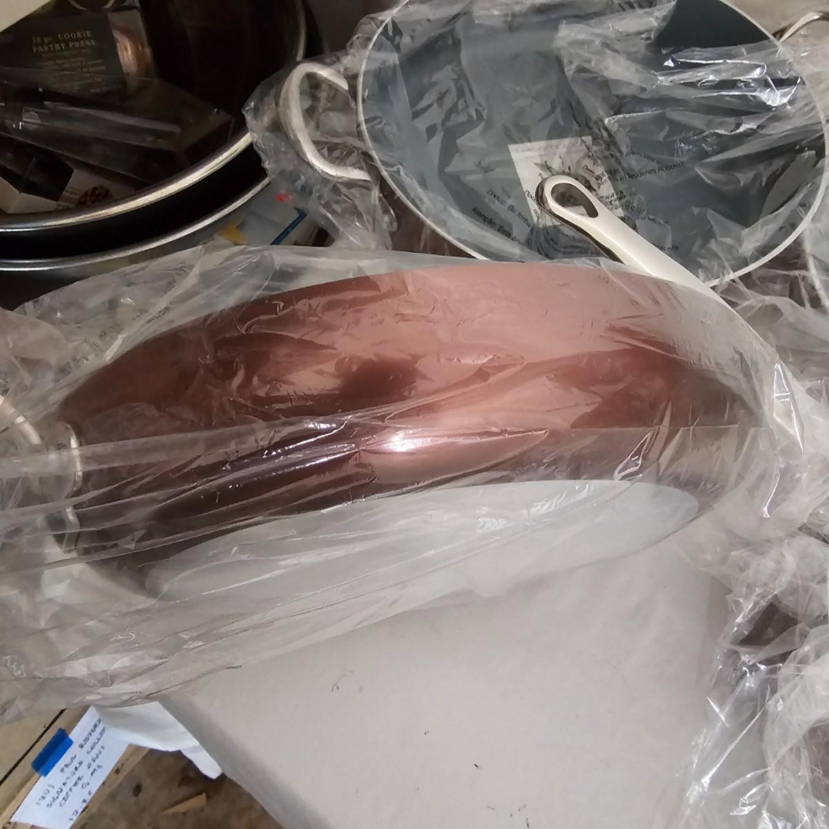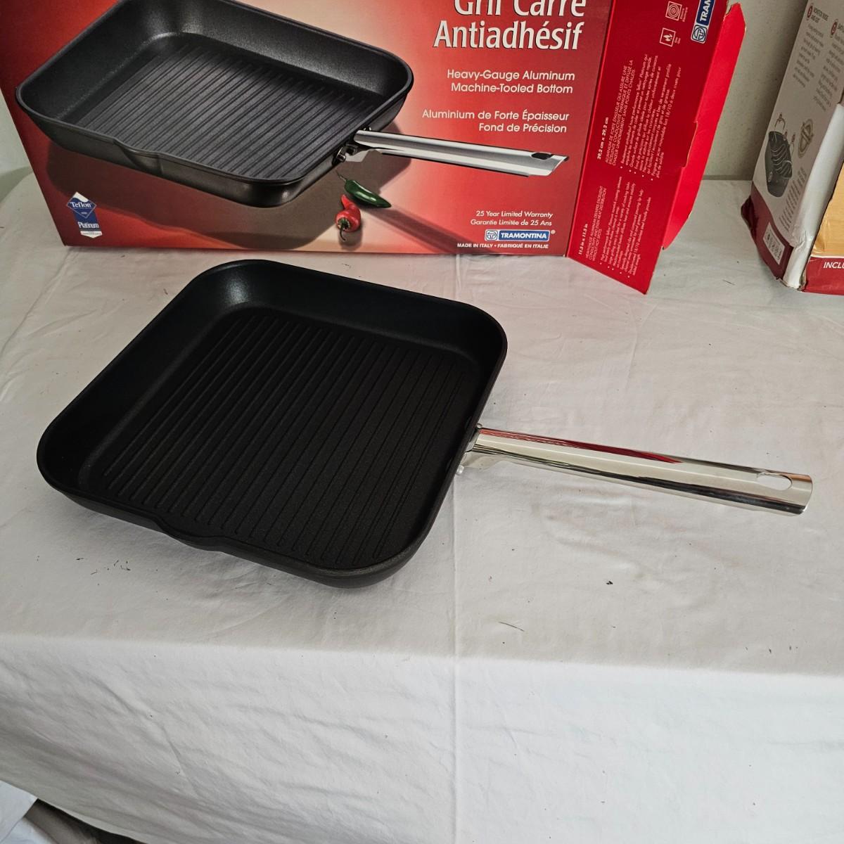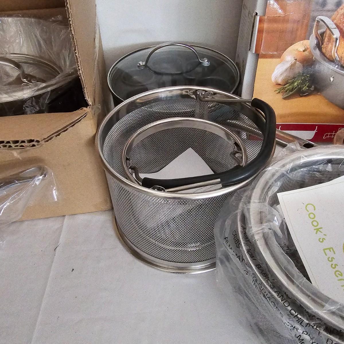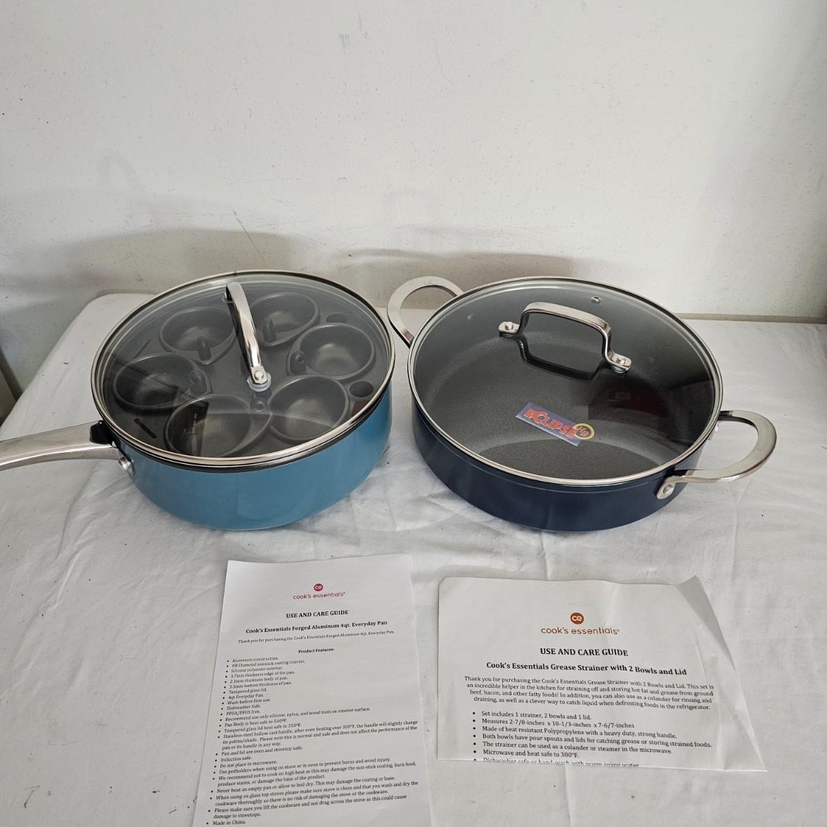 Name brand items of non-stick cooking surfaces. Set of six Green Pan skillets, fryers, pots and lids. 10", 10.5" and 12"D skillets and 6" and 8"D pots. A set of four Cooks Essentials strainer baskets, largest is 9"D. Also a 10" and 10.5"D fry pan, one with an egg cooking top and a vegetable steamer basket. One Tramontina 11.5"SQ grill and a Kitchen Aid 17" x 13" roaster with rack. All items appear to be new in box. See photos for details. Local pickup only.