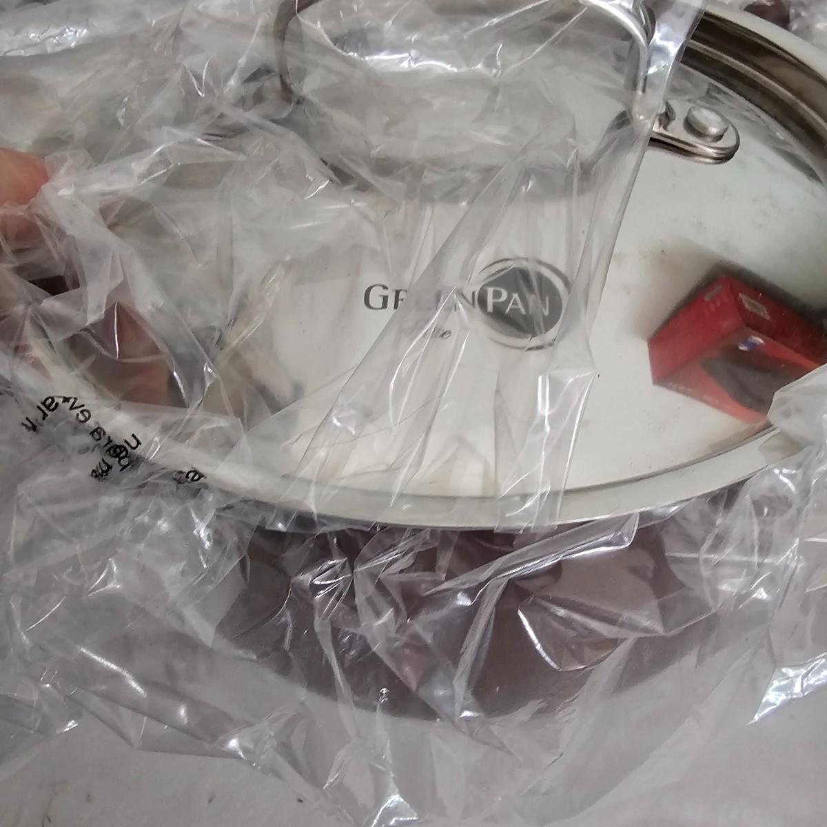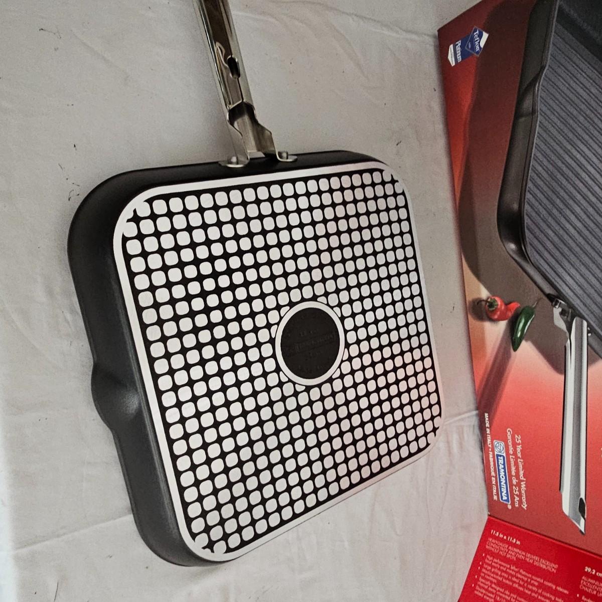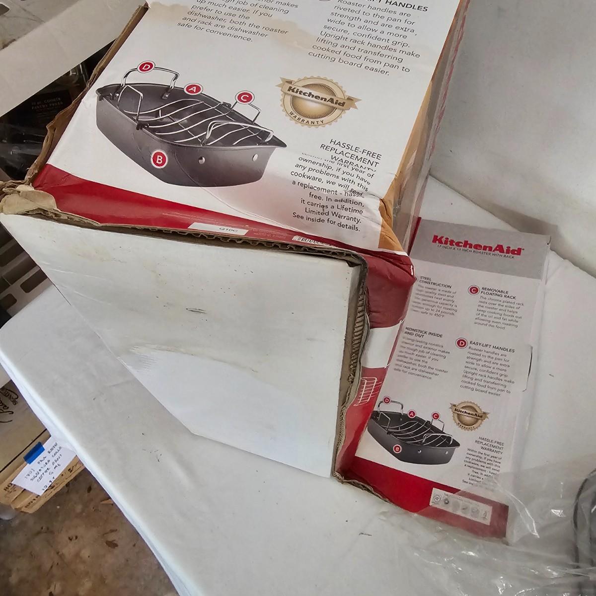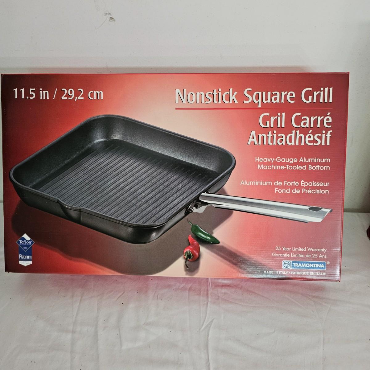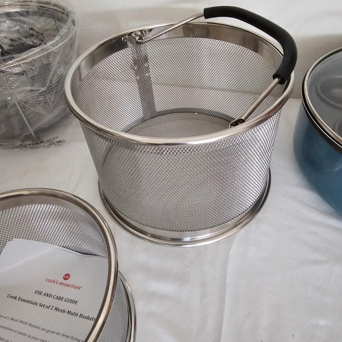 Name brand items of non-stick cooking surfaces. Set of six Green Pan skillets, fryers, pots and lids. 10", 10.5" and 12"D skillets and 6" and 8"D pots. A set of four Cooks Essentials strainer baskets, largest is 9"D. Also a 10" and 10.5"D fry pan, one with an egg cooking top and a vegetable steamer basket. One Tramontina 11.5"SQ grill and a Kitchen Aid 17" x 13" roaster with rack. All items appear to be new in box. See photos for details. Local pickup only.