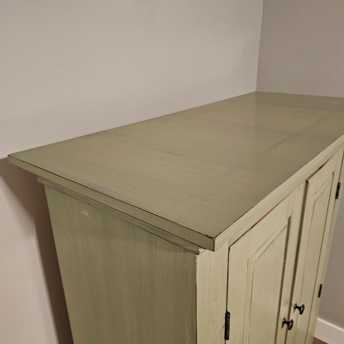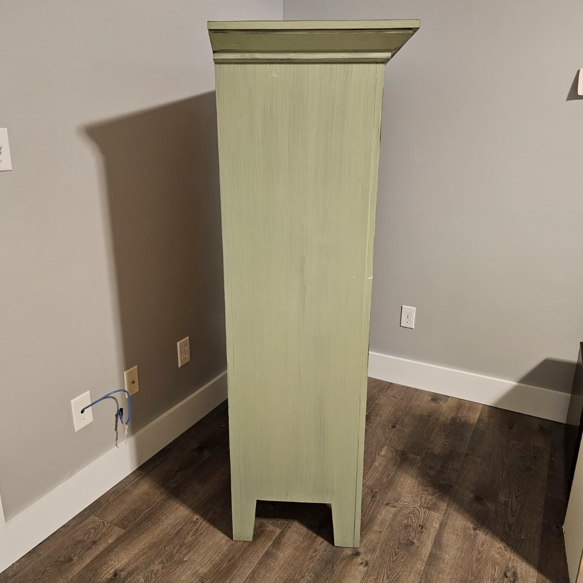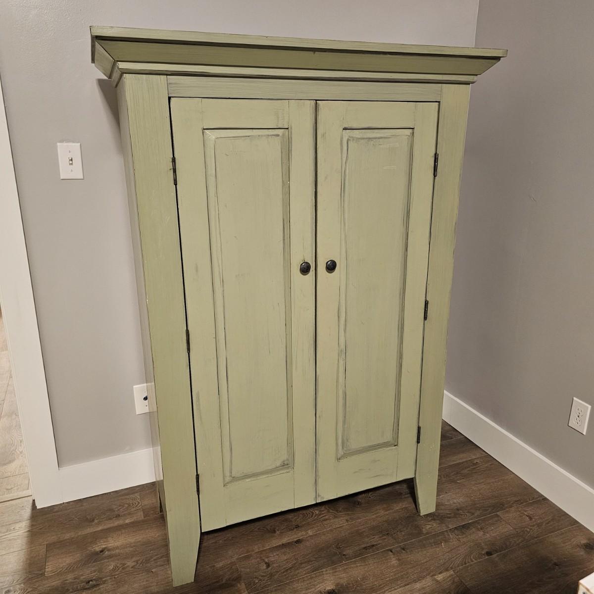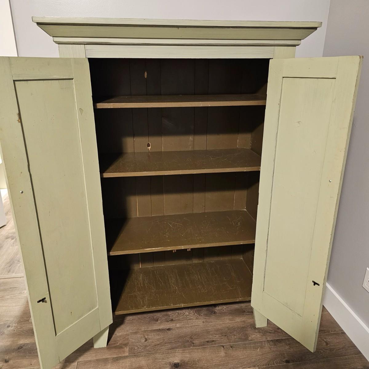 An antique looking storage cabinet with two doors and four shelves inside. The wood appears to be pine. Unit is painted a sage green, measures 42.5" x 19" x 61.5"H. Pedestal style legs. See photos for details. Local pickup only.