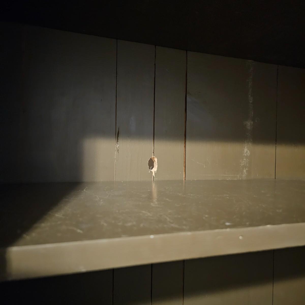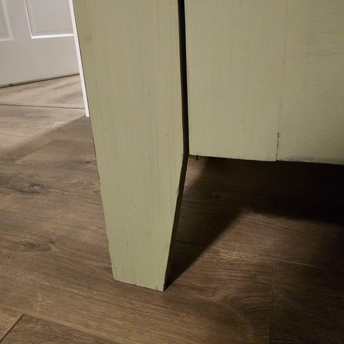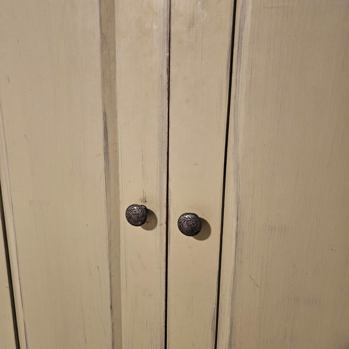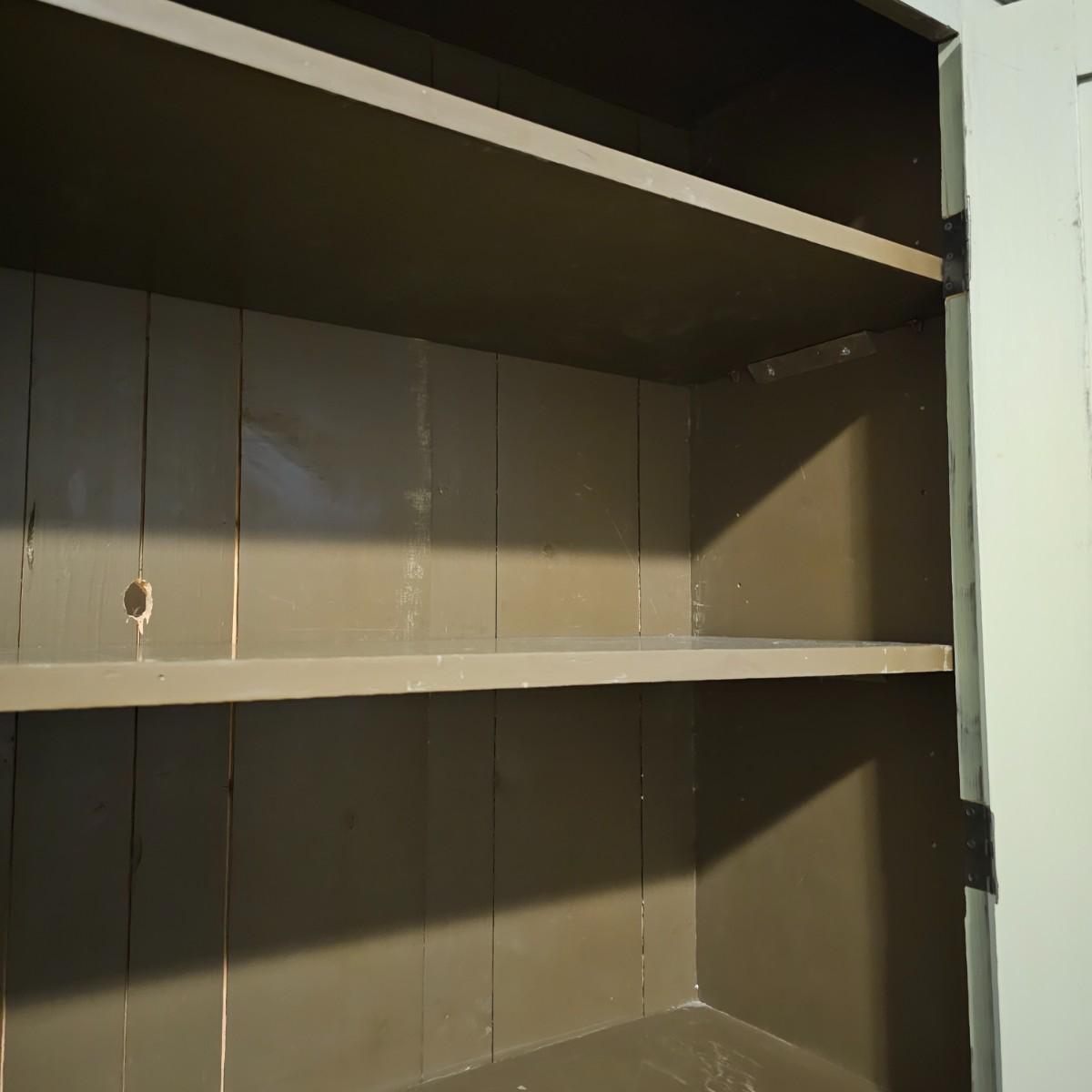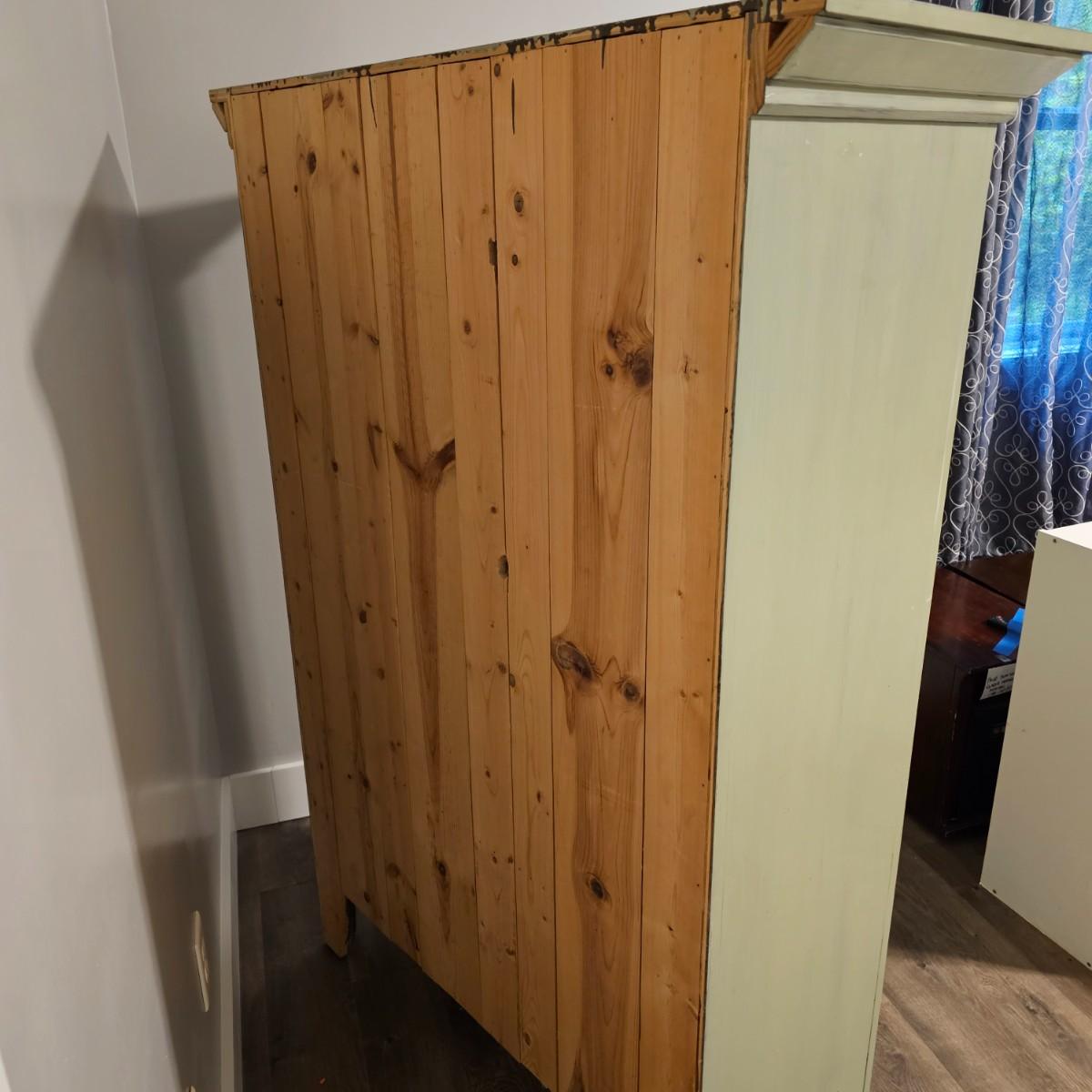 An antique looking storage cabinet with two doors and four shelves inside. The wood appears to be pine. Unit is painted a sage green, measures 42.5" x 19" x 61.5"H. Pedestal style legs. See photos for details. Local pickup only.