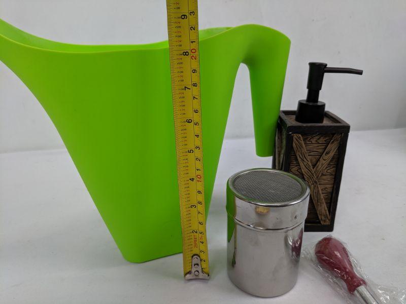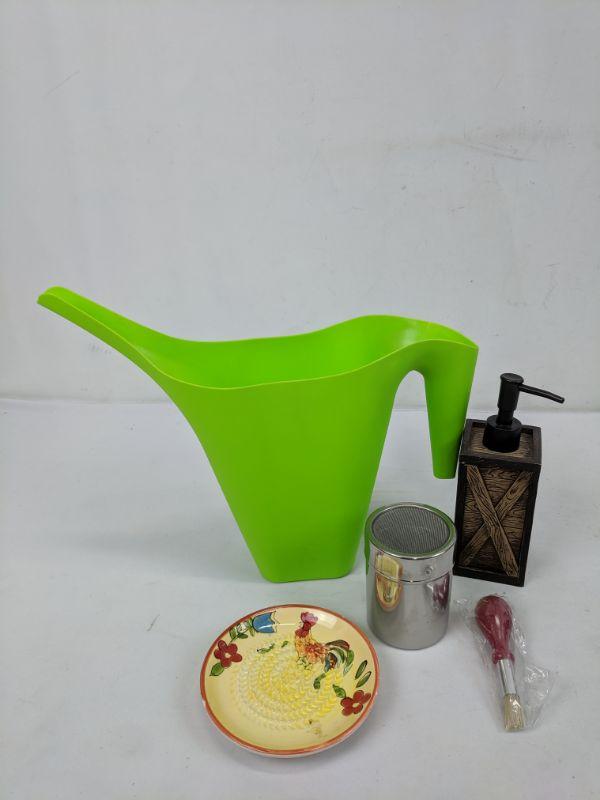 Green Plastic Pitcher, Rooster Small Plate, Wooden Soap Dispenser, Etc...