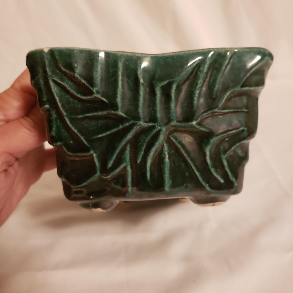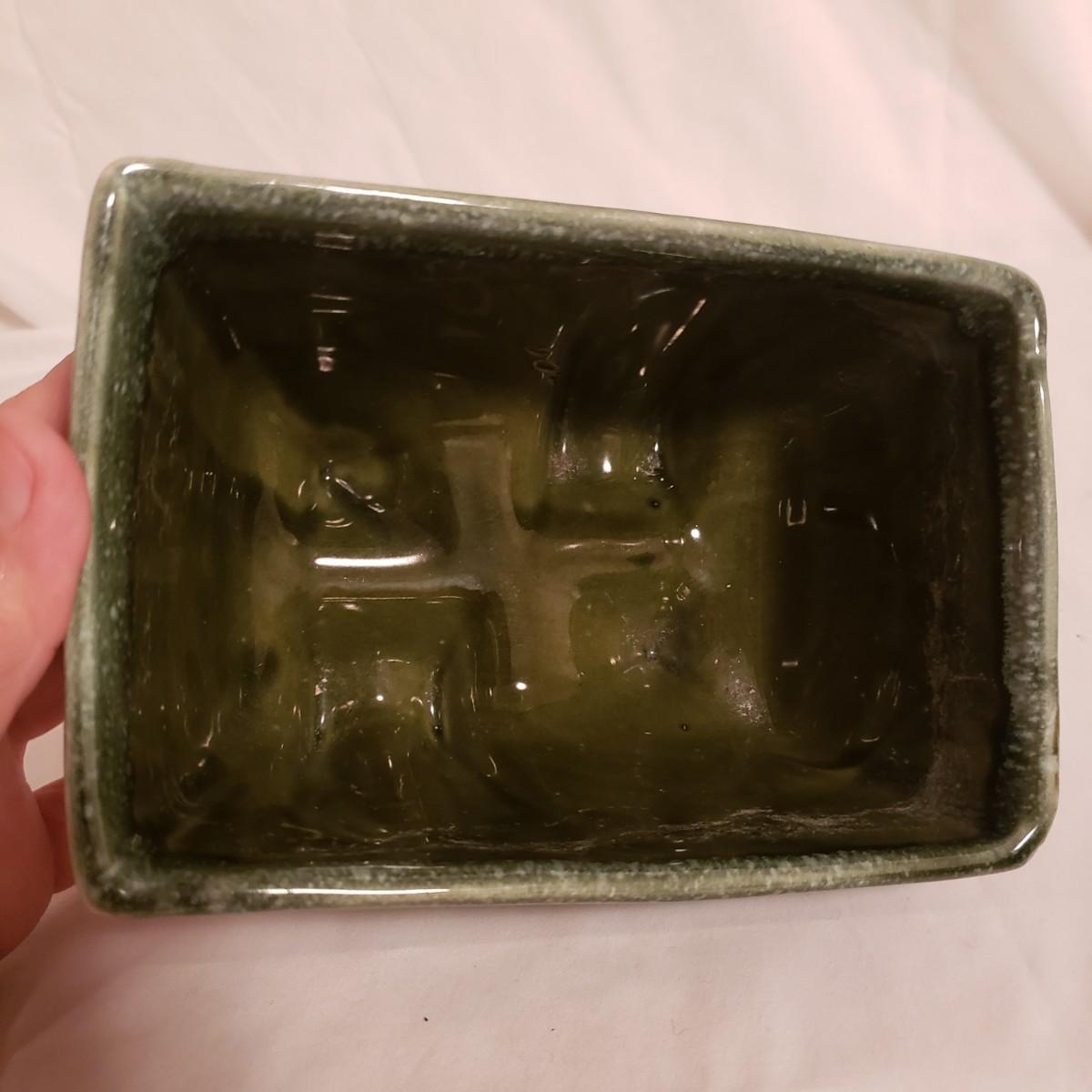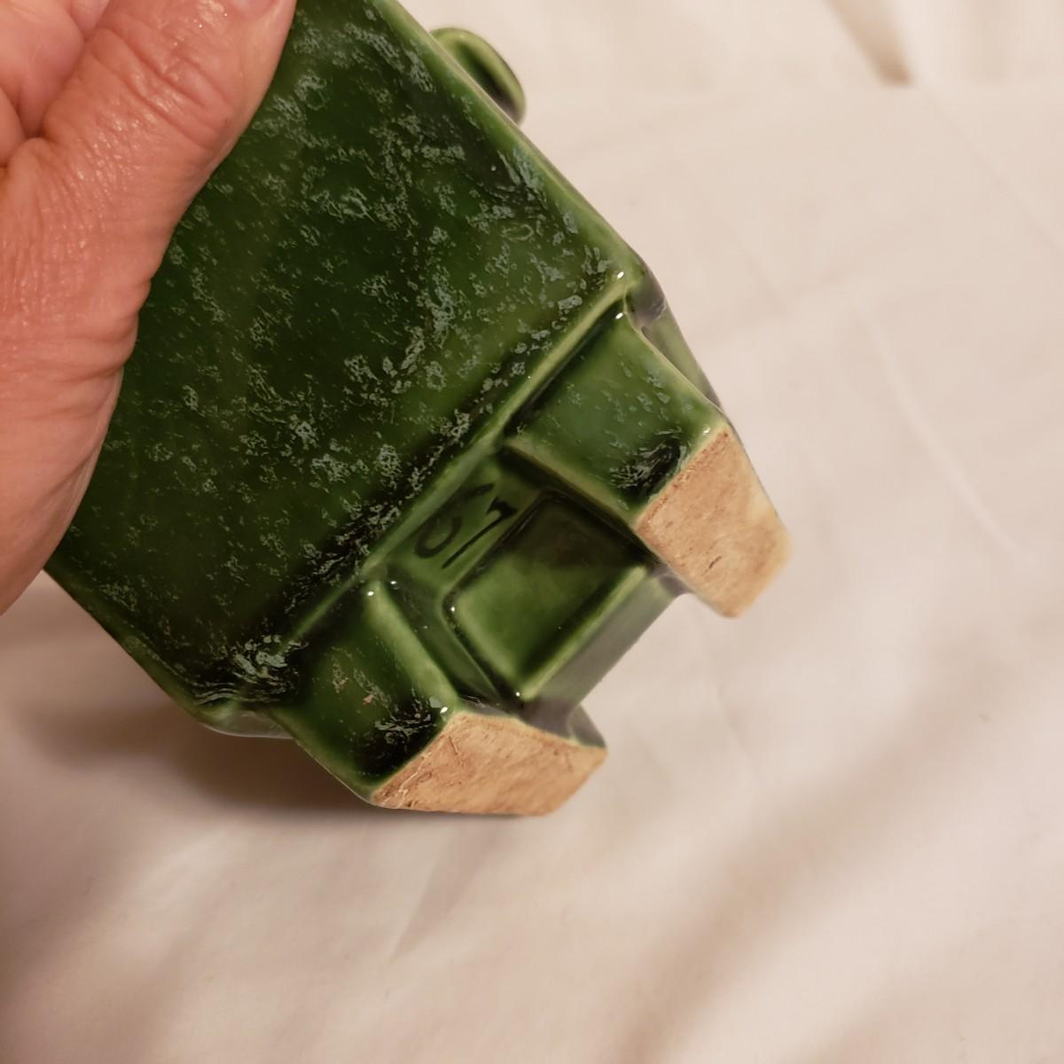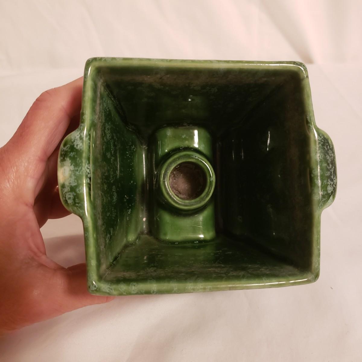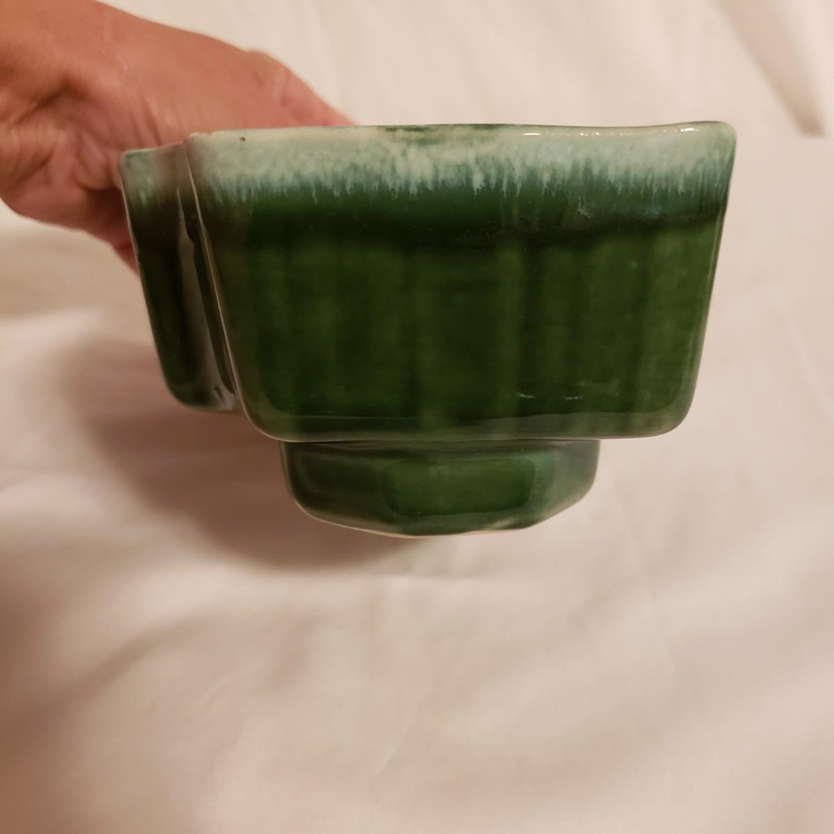 This green glazed pottery lot features several small planters and a candle holder made by Hull marked 67 USA. One planter made by UPCO or Ungemach Pottery Company is marked form 483. This pot with a leaf like pattern measures 8.5" x 5" x 3"H. The pot marked CP1266 appears to be a 1950's Cookson Potters piece. Please see photos for details.