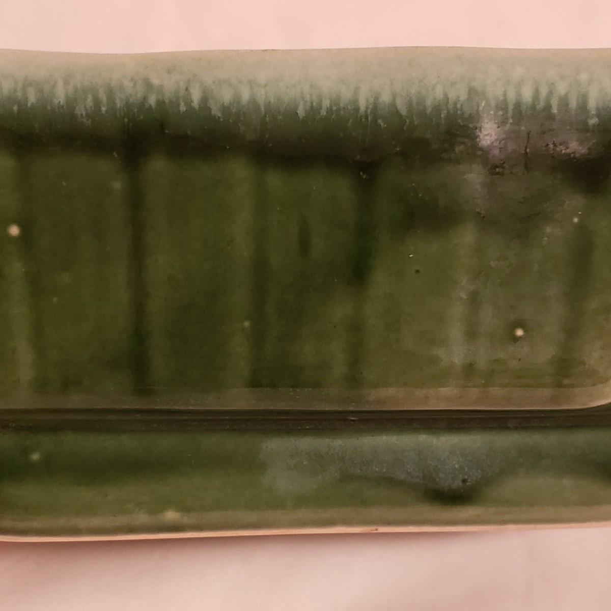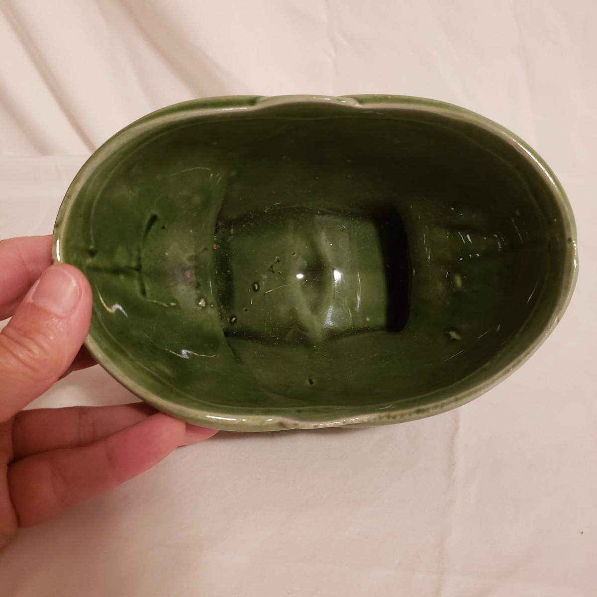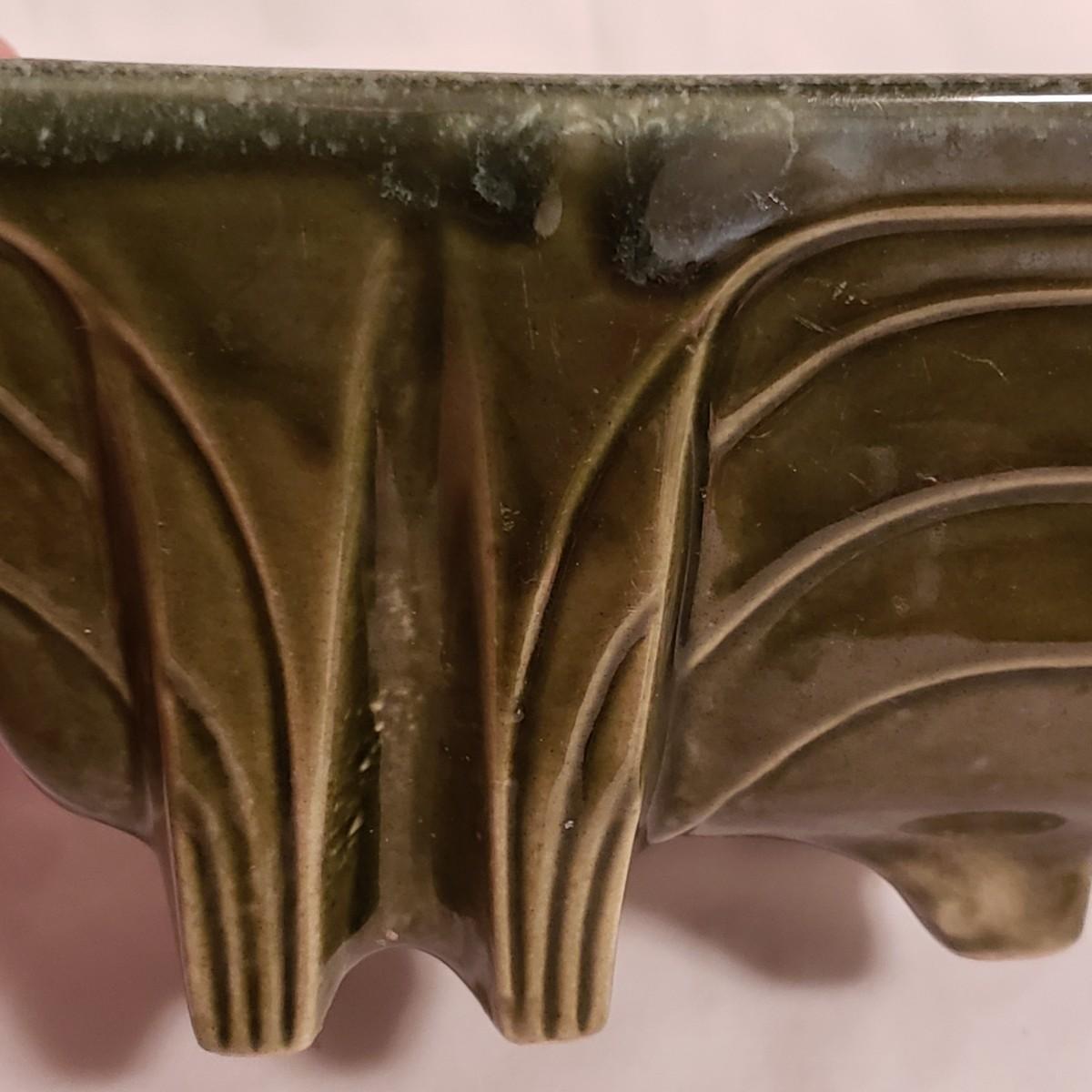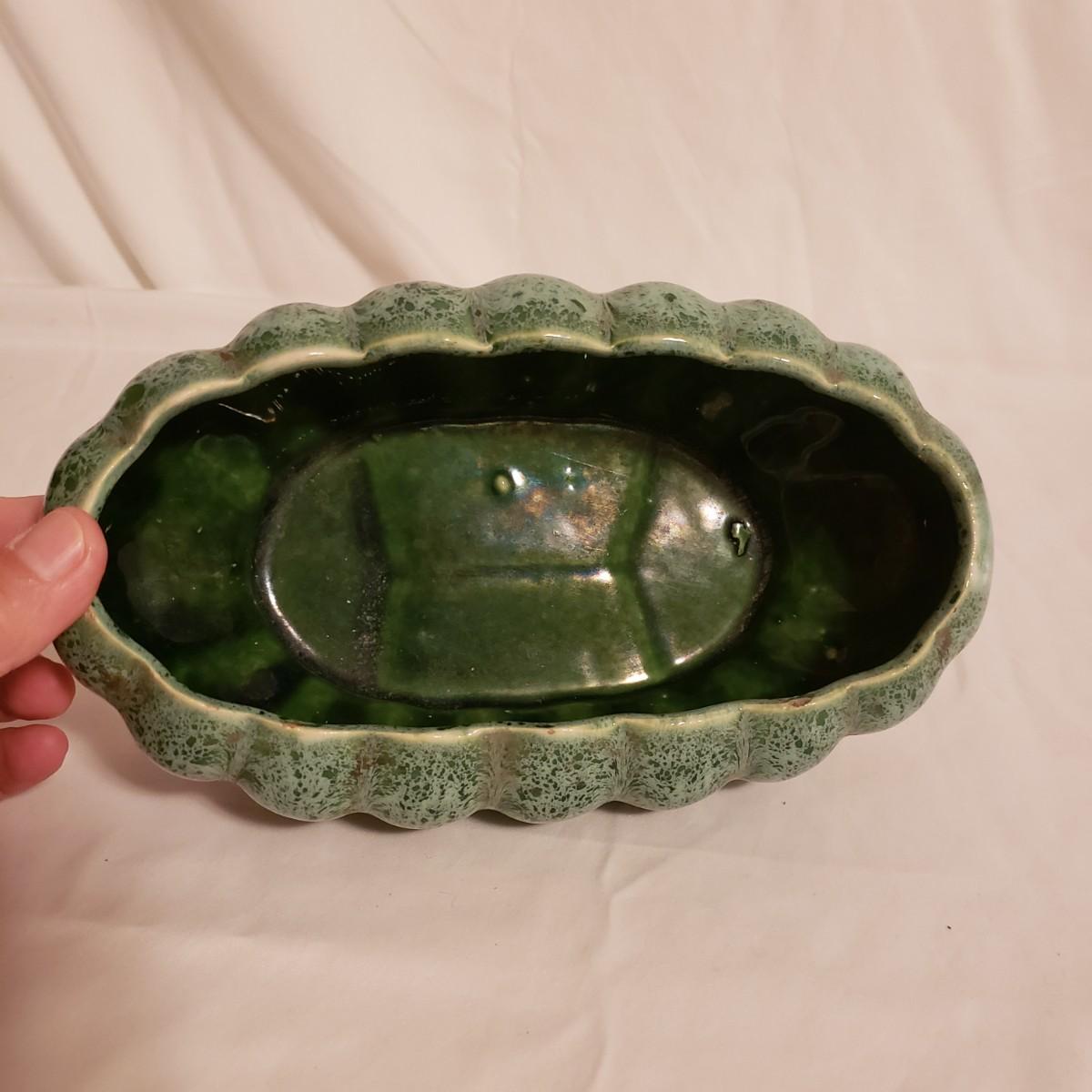 This green glazed pottery lot features several small planters and a candle holder made by Hull marked 67 USA. One planter made by UPCO or Ungemach Pottery Company is marked form 483. This pot with a leaf like pattern measures 8.5" x 5" x 3"H. The pot marked CP1266 appears to be a 1950's Cookson Potters piece. Please see photos for details.