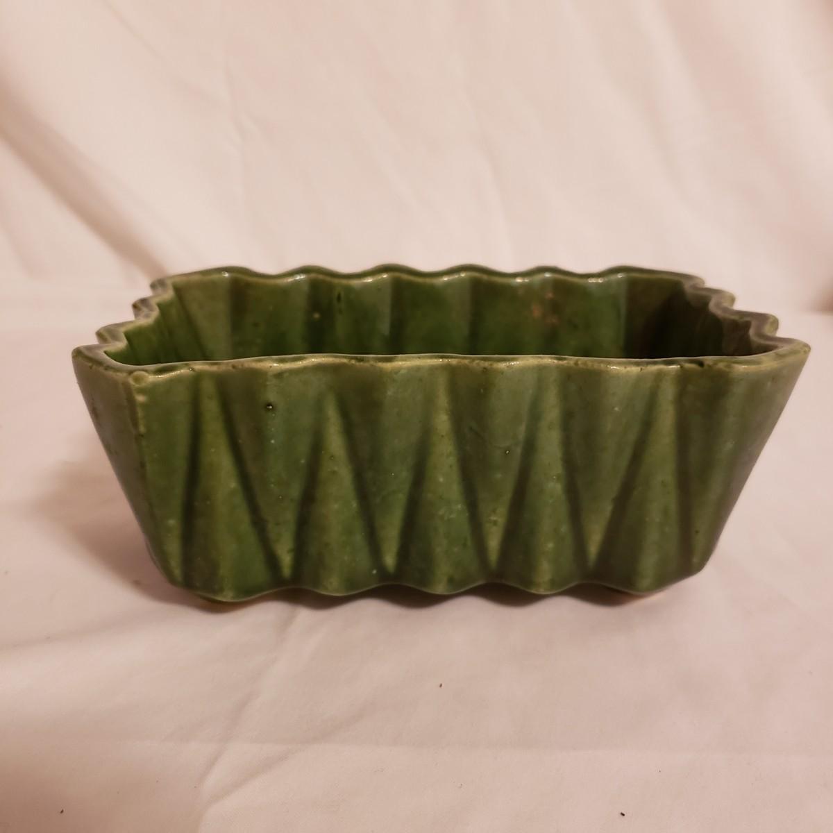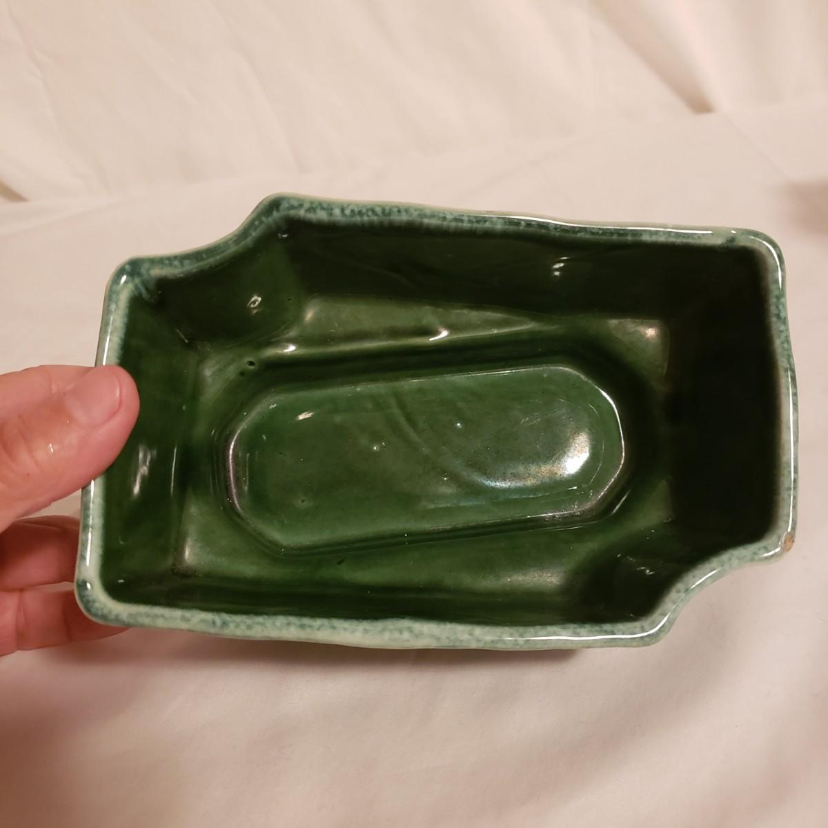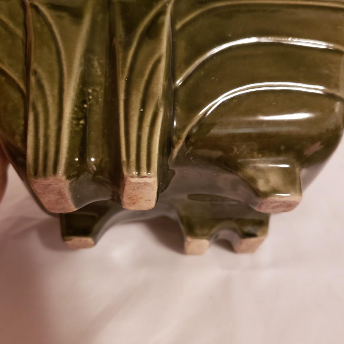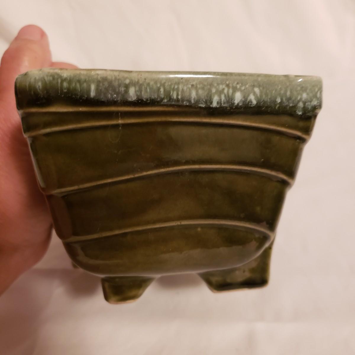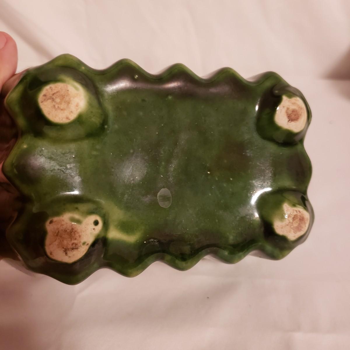 This green glazed pottery lot features several small planters and a candle holder made by Hull marked 67 USA. One planter made by UPCO or Ungemach Pottery Company is marked form 483. This pot with a leaf like pattern measures 8.5" x 5" x 3"H. The pot marked CP1266 appears to be a 1950's Cookson Potters piece. Please see photos for details.