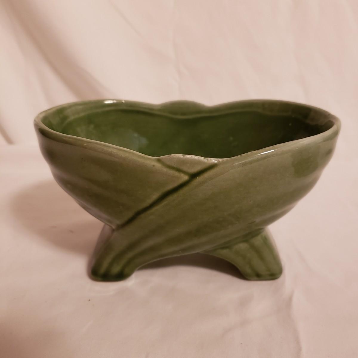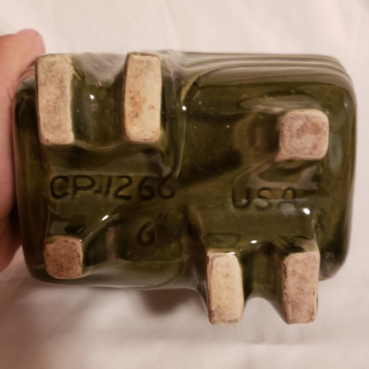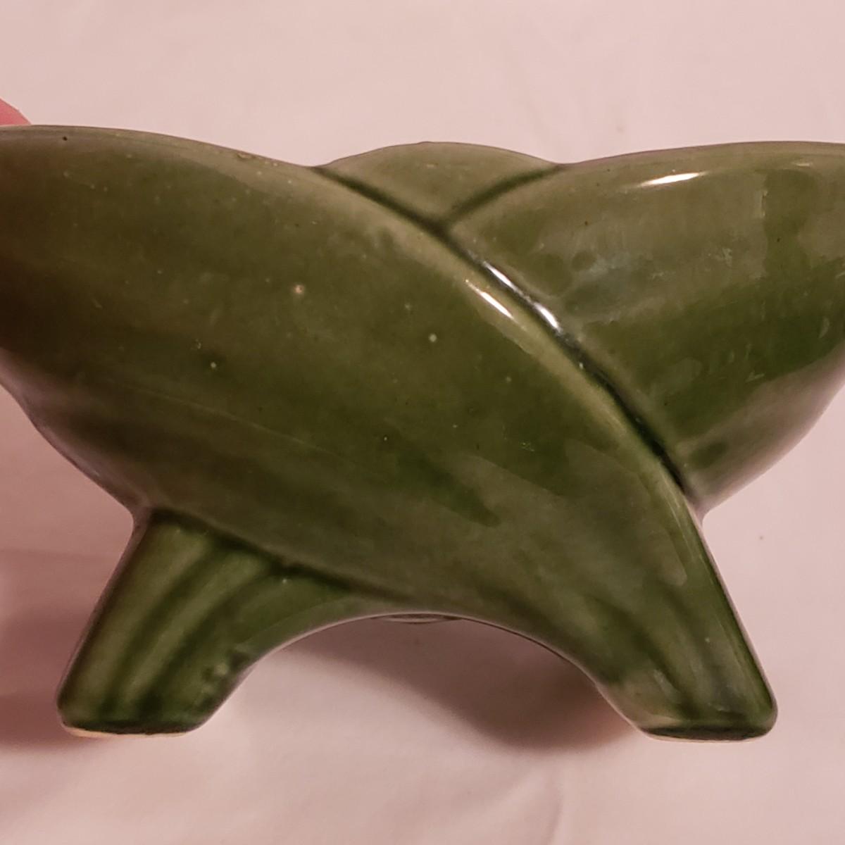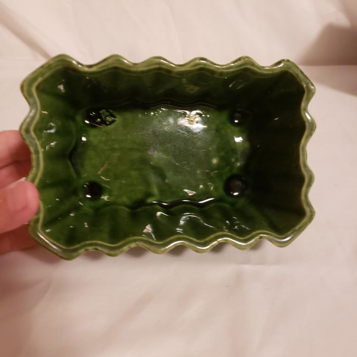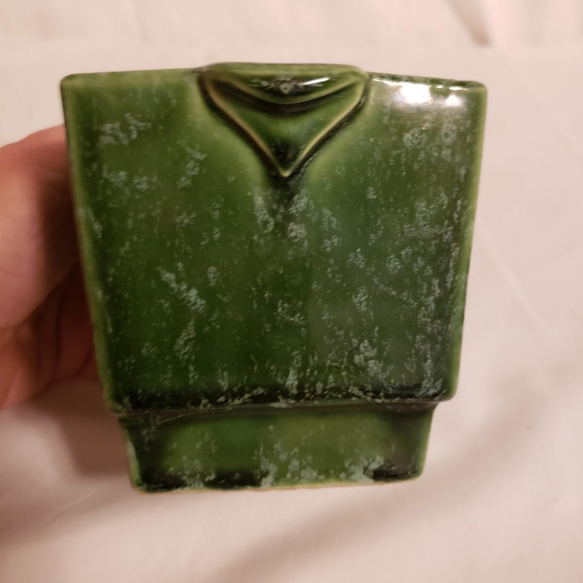 This green glazed pottery lot features several small planters and a candle holder made by Hull marked 67 USA. One planter made by UPCO or Ungemach Pottery Company is marked form 483. This pot with a leaf like pattern measures 8.5" x 5" x 3"H. The pot marked CP1266 appears to be a 1950's Cookson Potters piece. Please see photos for details.