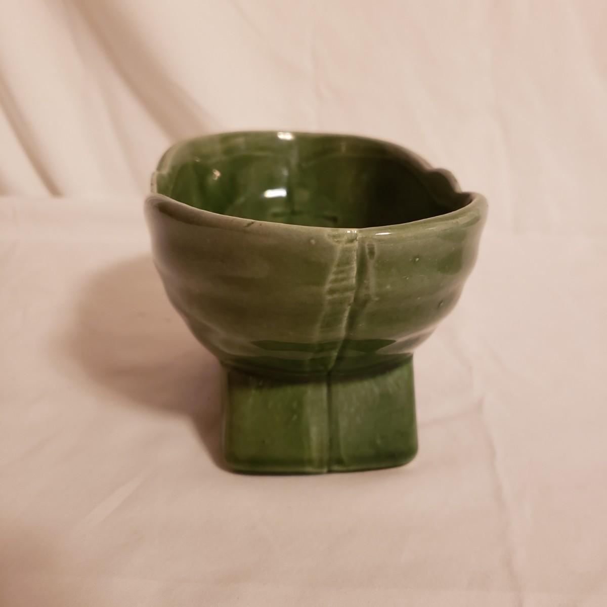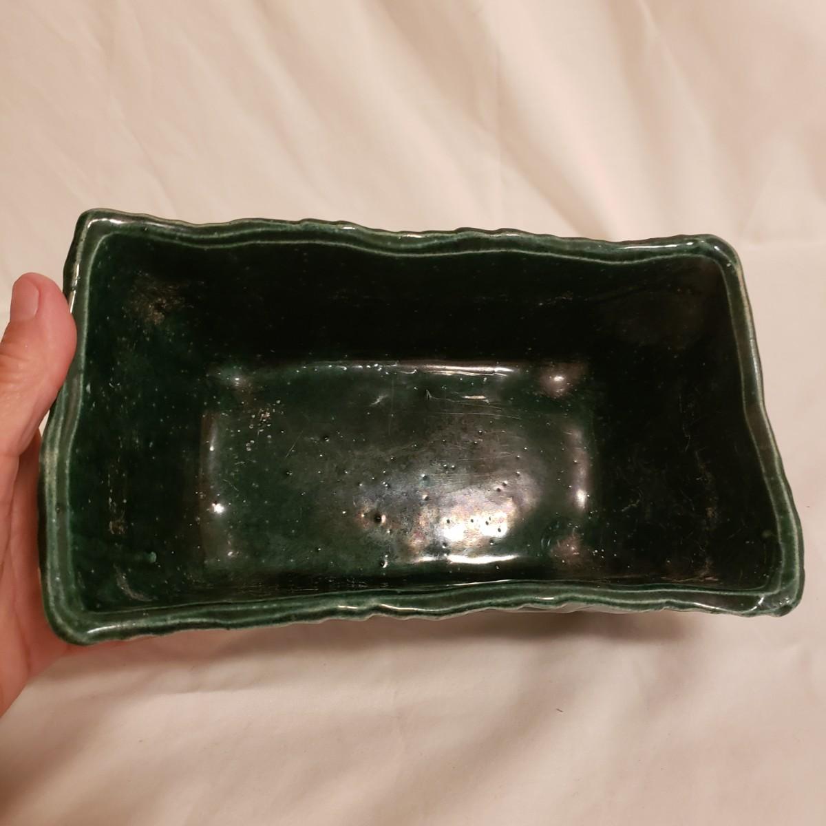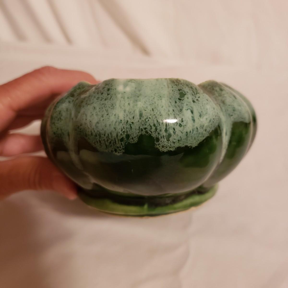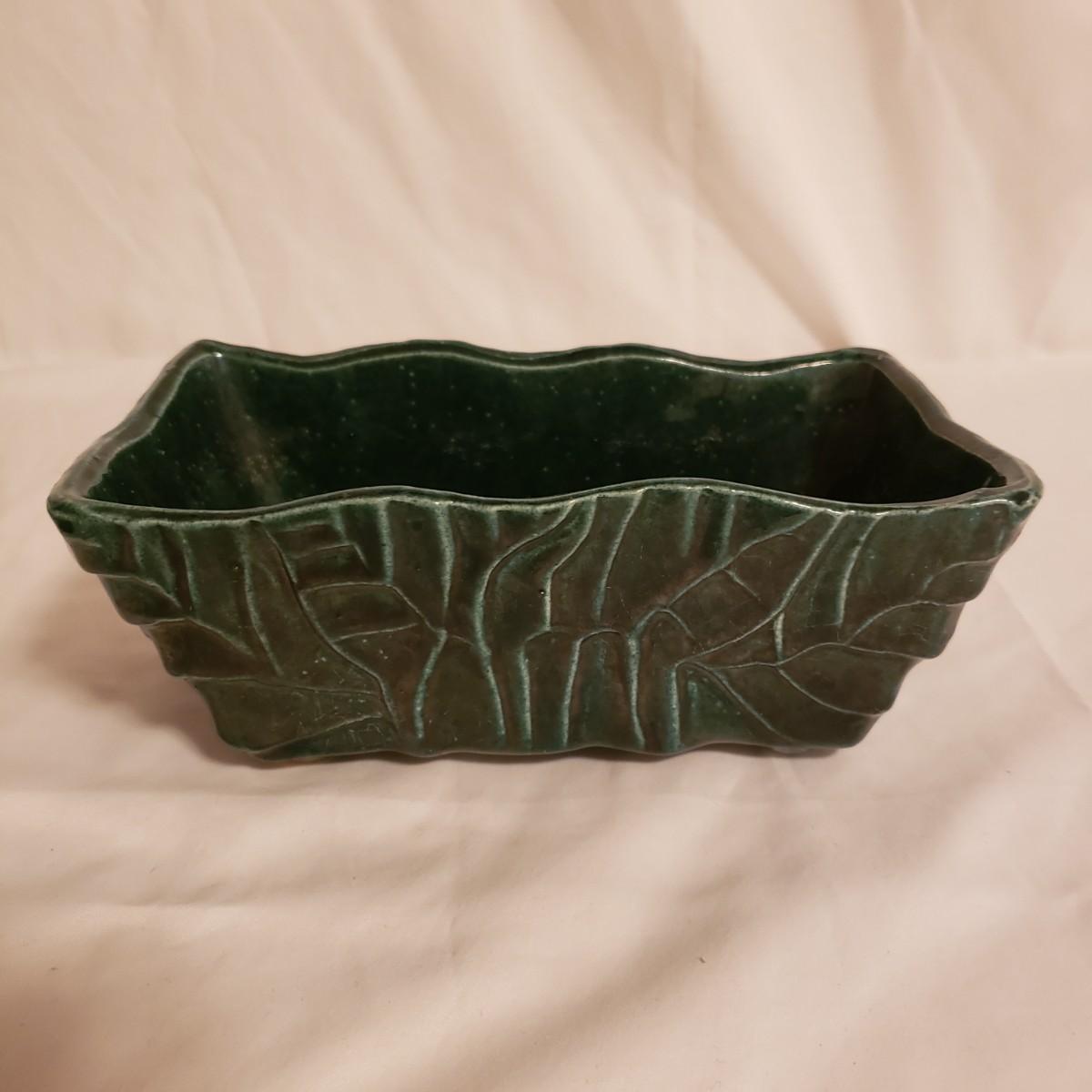 This green glazed pottery lot features several small planters and a candle holder made by Hull marked 67 USA. One planter made by UPCO or Ungemach Pottery Company is marked form 483. This pot with a leaf like pattern measures 8.5" x 5" x 3"H. The pot marked CP1266 appears to be a 1950's Cookson Potters piece. Please see photos for details.