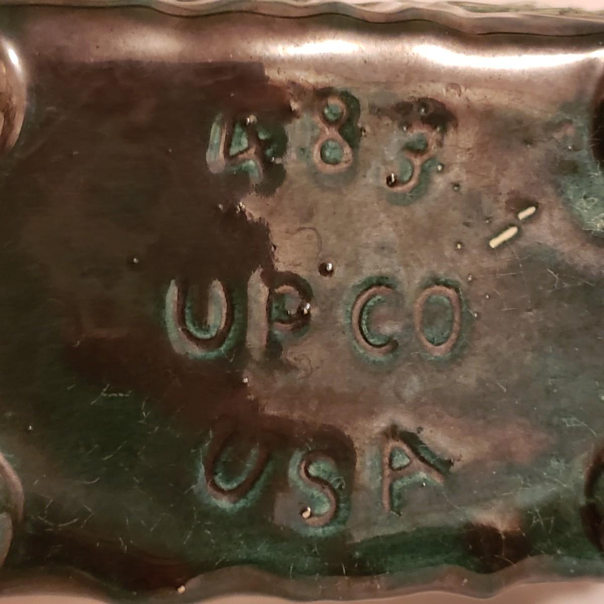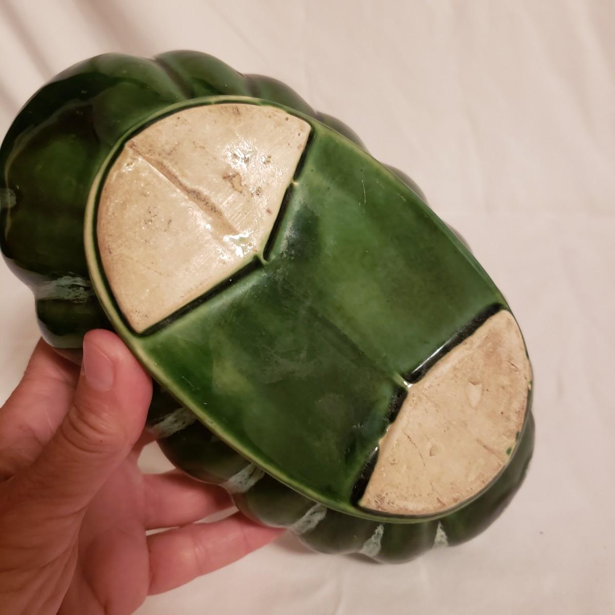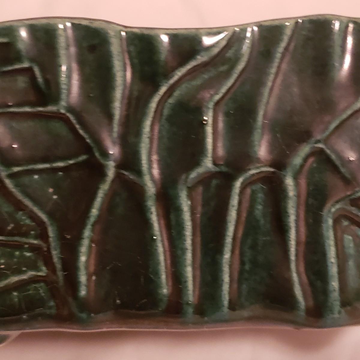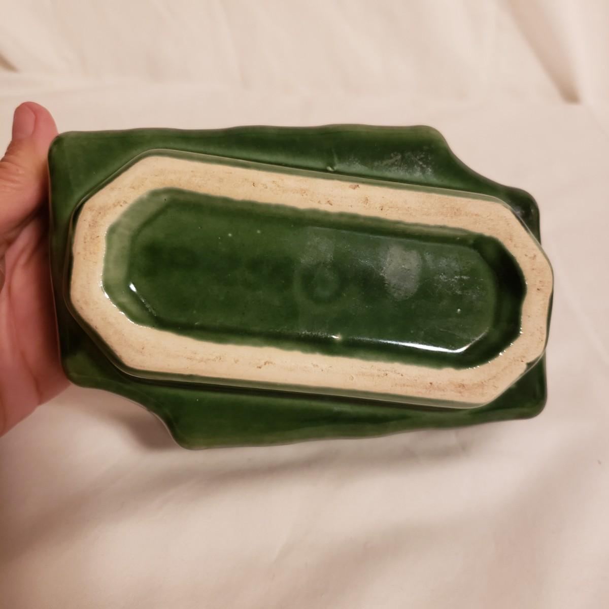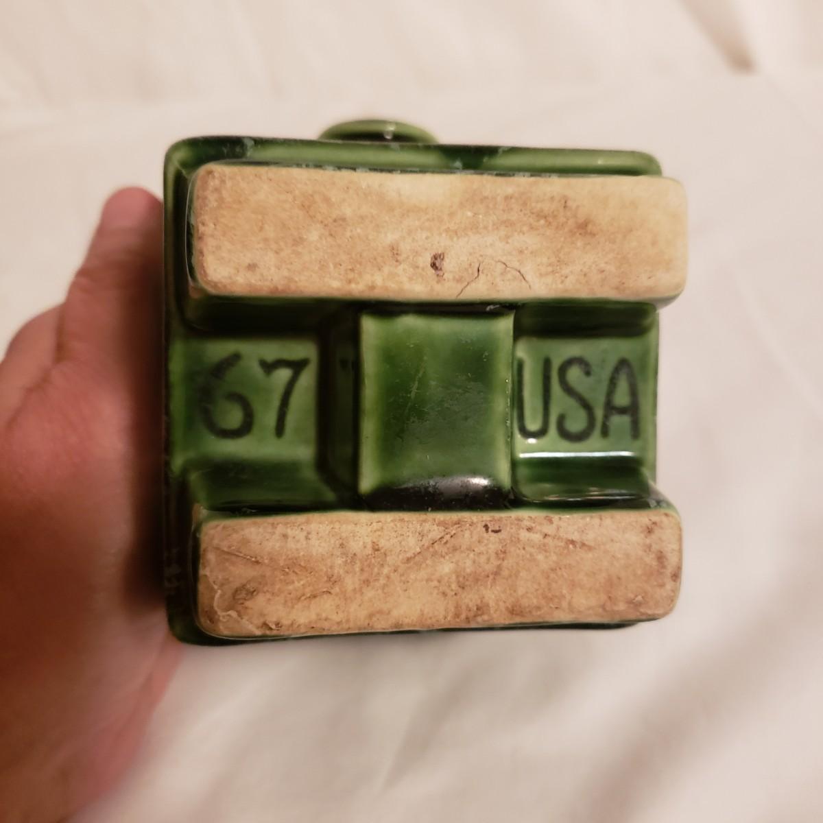 This green glazed pottery lot features several small planters and a candle holder made by Hull marked 67 USA. One planter made by UPCO or Ungemach Pottery Company is marked form 483. This pot with a leaf like pattern measures 8.5" x 5" x 3"H. The pot marked CP1266 appears to be a 1950's Cookson Potters piece. Please see photos for details.